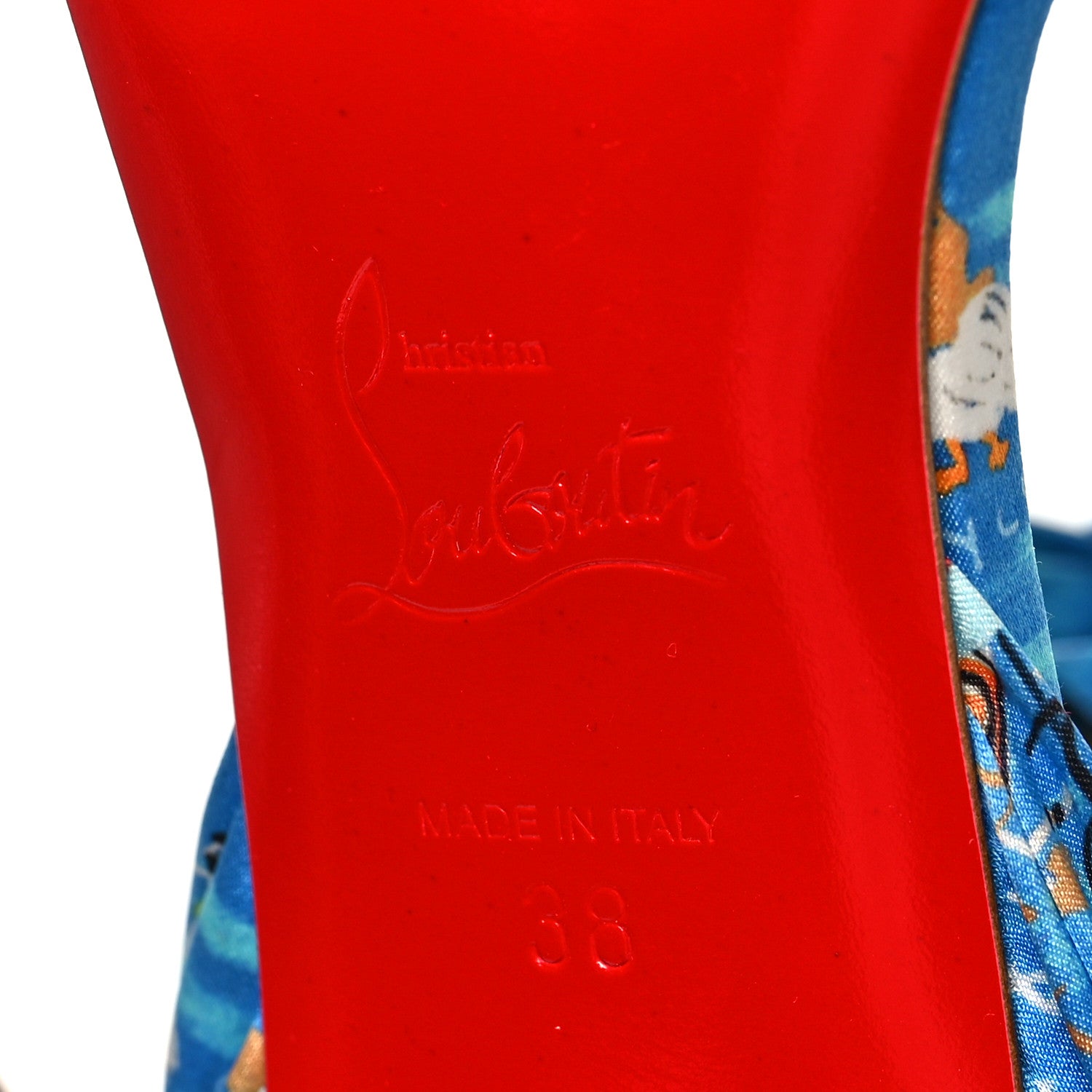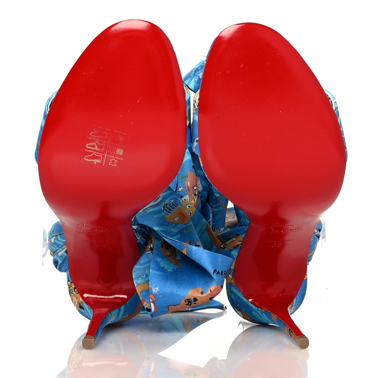 This is an authentic pair of CHRISTIAN LOUBOUTIN Crepe Satin Greekaba Du Desert 100 Sandal size 38 in Blue and Multicolor. These chic stylish heels are crafted of Loubi Odyssey blue patterned crepe satin, inspired by the Greek islands. These have a 4-inch wrapped sharp stiletto, adjustable ribbon ankle ties and an open toe.Follow this item for alerts. Christian Louboutin is a registered trademark of Christian Louboutin. FASHIONPHILE is not affiliated with Christian Louboutin.