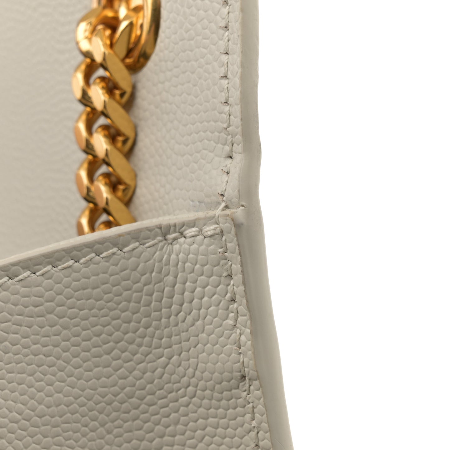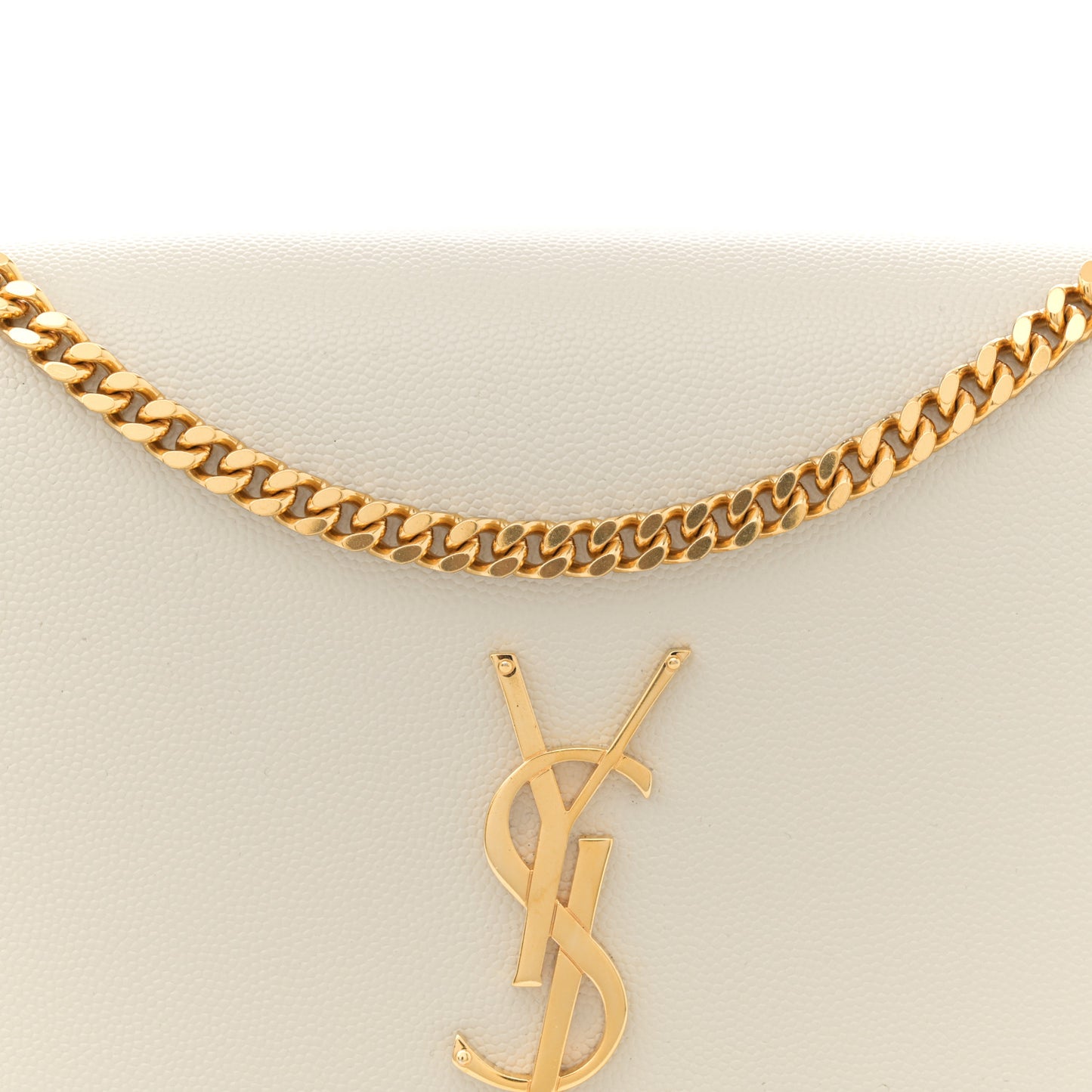 This is an authentic SAINT LAURENT Grain De Poudre Medium Monogram Kate Satchel in Crema Soft. This stylish crossbody is crafted of finely pebbled calfskin leather in crema soft. The bag features a gold chain-link shoulder strap and a full facing flap with the classic polished gold YSL logo. The flap opens to a black fabric interior with a patch pocket.Follow this item for alerts. Saint Laurent is a registered trademark of Saint Laurent. FASHIONPHILE is not affiliated with Saint Laurent.