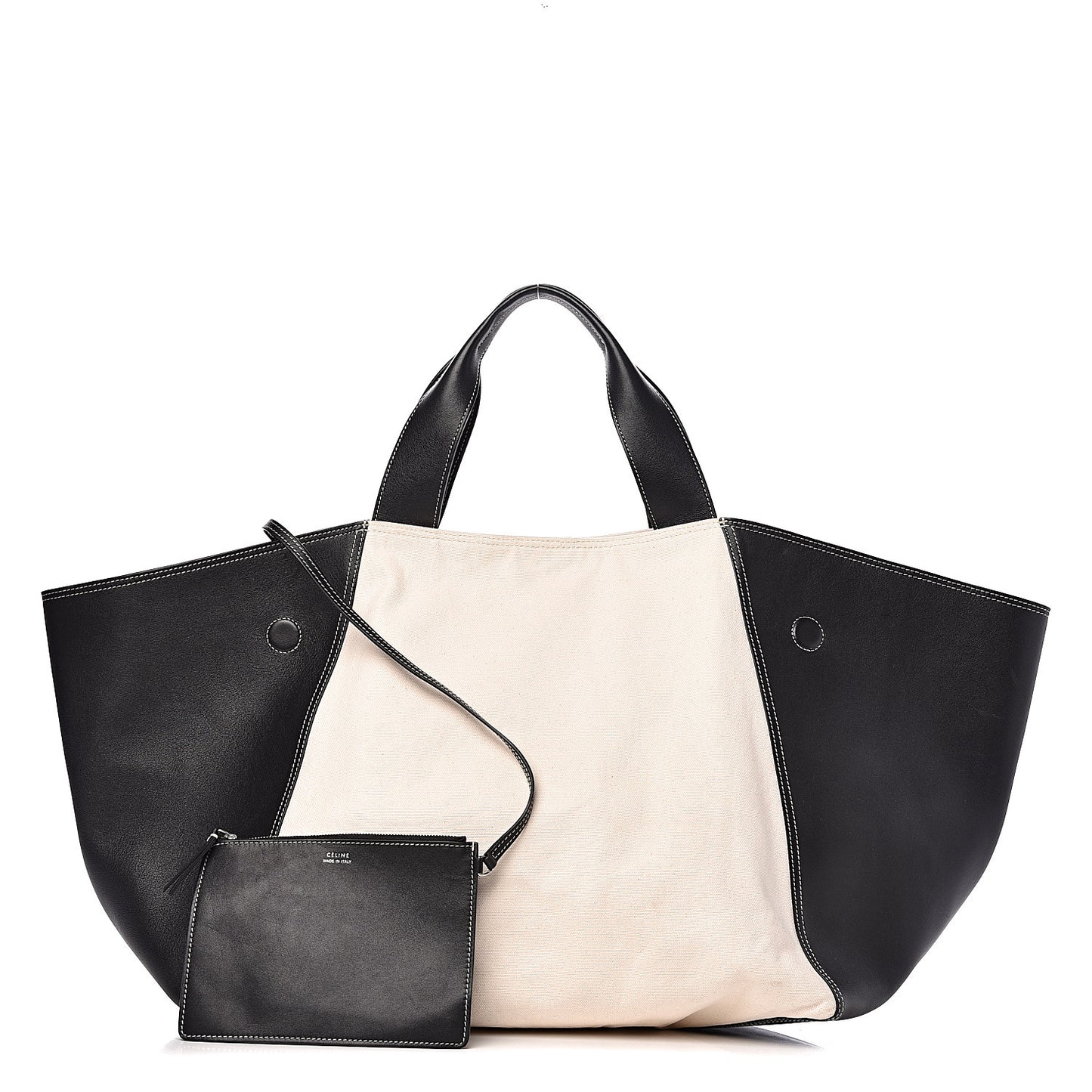 This is an authentic CELINE Canvas Smooth Calfskin Frame Tote in Black and White. This chic tote offers a different take on the iconic luggage handbag style. Crafted of luxuriously smooth calfskin leather in black and beige canvas, this handbag features a spacious silhouette with leather top handles and a removable pouch. Enjoy this fresh look for every day, only from Celine!Follow this item for alerts. Celine is a registered trademark of Celine. FASHIONPHILE is not affiliated with Celine.