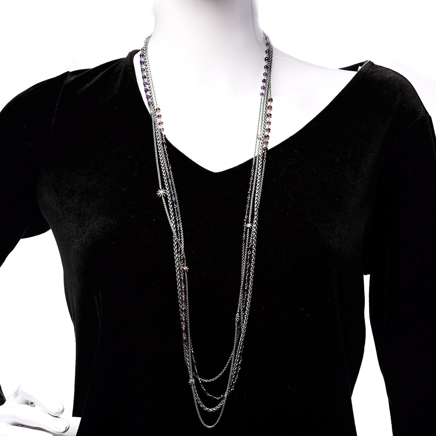 This is an authentic DAVID YURMAN Sterling Silver Amethyst Garnet Multi Strand Starburst Chain Bead Necklace. The necklace is crafted of sterling silver and features four strands of chains. One is adorned with purple amethyst stones, one with garnet stones, one with starburst motifs, and the last a wheat style chain. This is a stunning necklace with the whimsical style of David Yurman!Follow this item for alerts. David Yurman is a registered trademark of David Yurman. FASHIONPHILE is not affiliated with David Yurman.