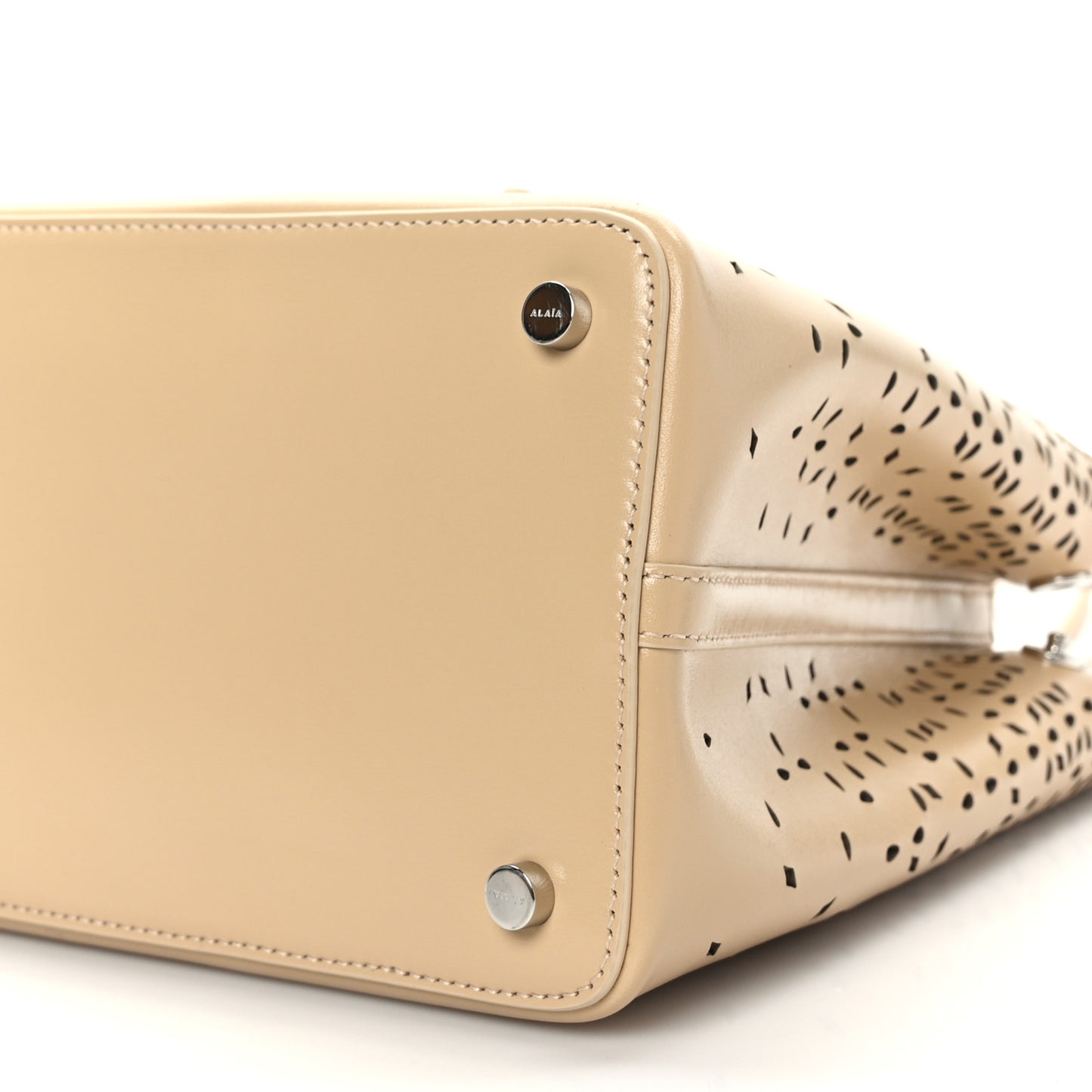 This is an authentic ALAIA Palmelatto Calfskin Fiori Degrade Mina 25 Bag in Sable. This stylish tote is crafted of beige calfskin leather with laser cut design throughout. The bag features leather strap handles, an optional shoulder strap, and silver hardware. The top opens to a dark beige leather interior with a pouch.Follow this item for alerts. Alaia is a registered trademark of Alaia. FASHIONPHILE is not affiliated with Alaia.