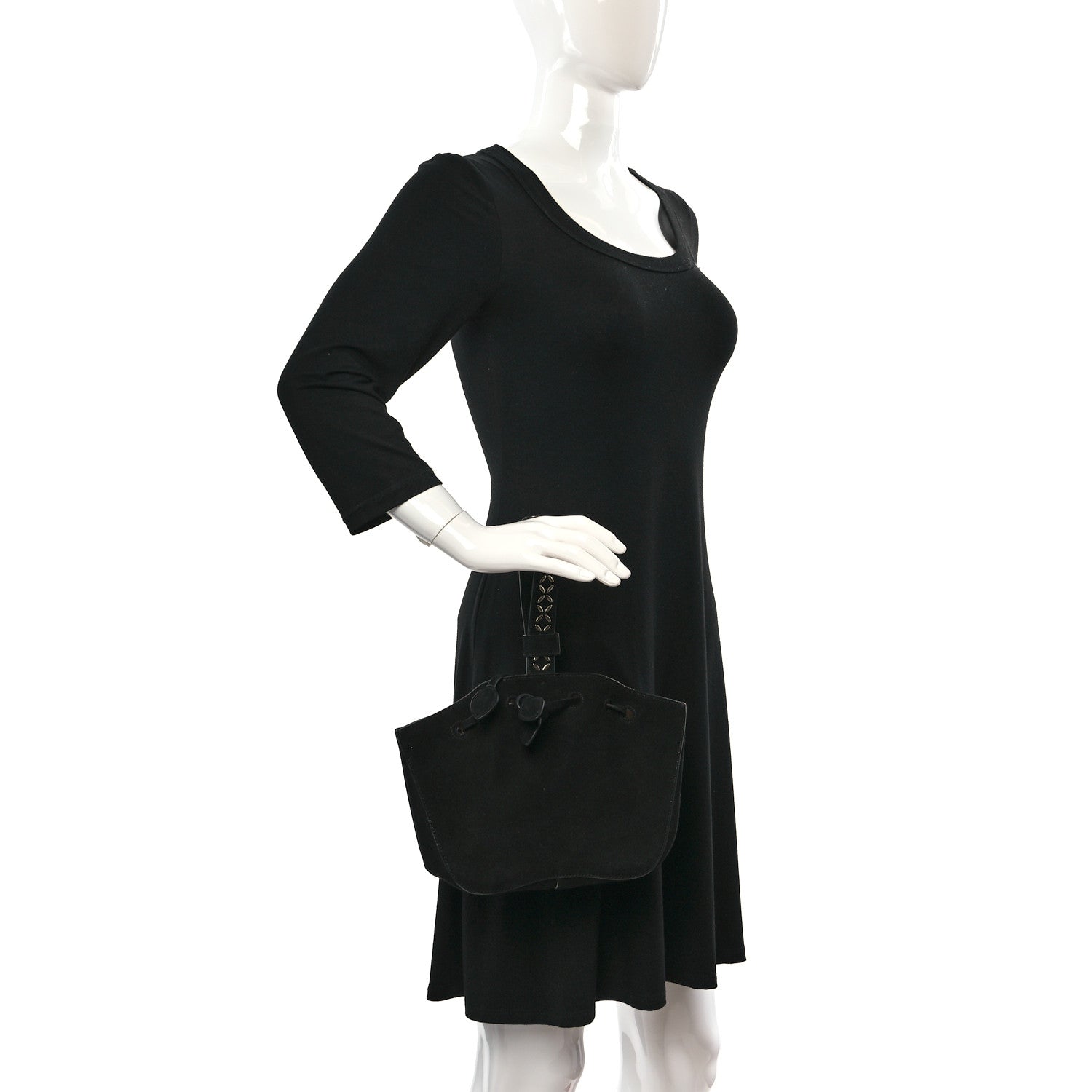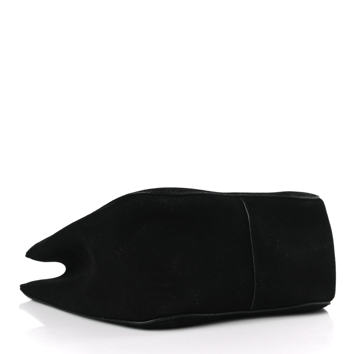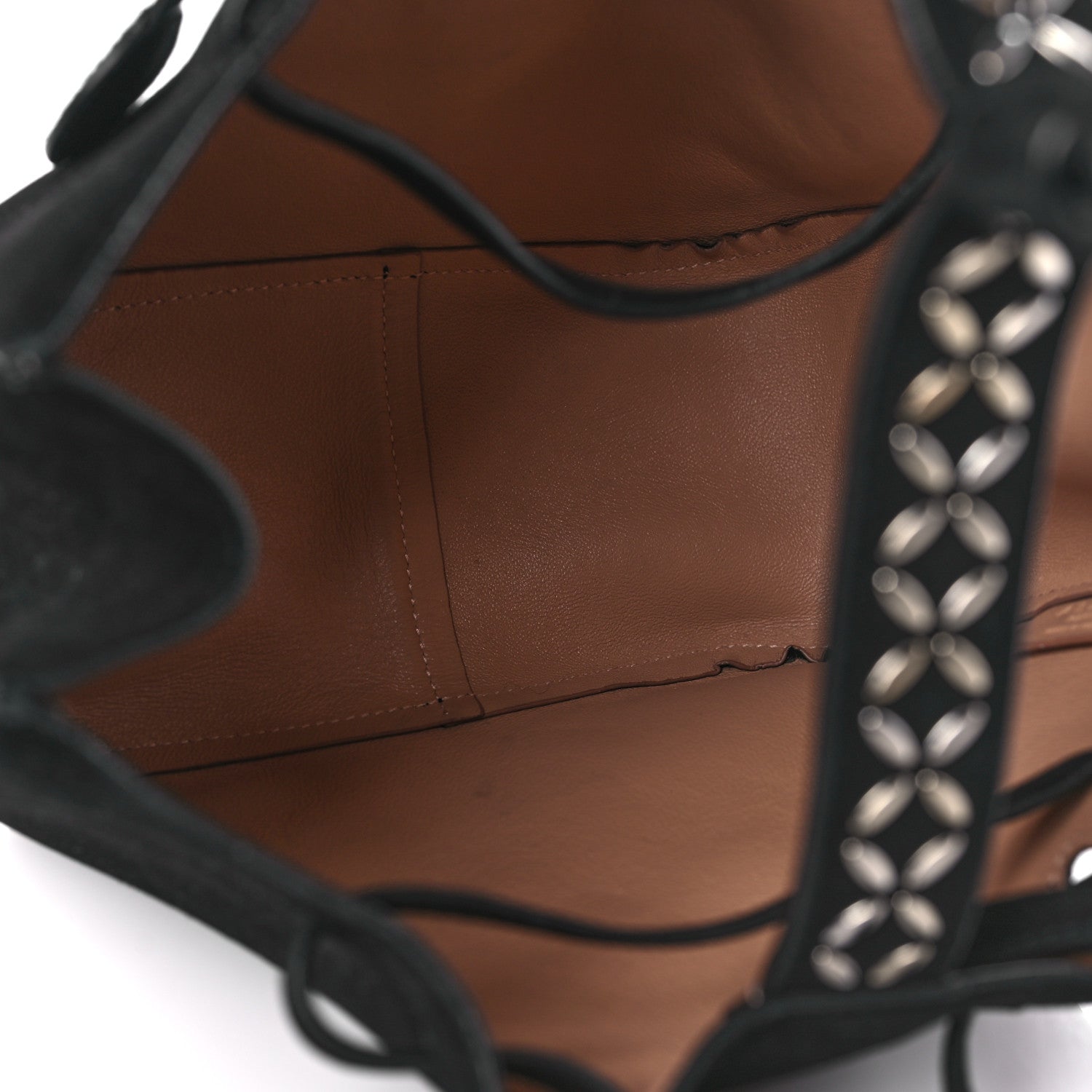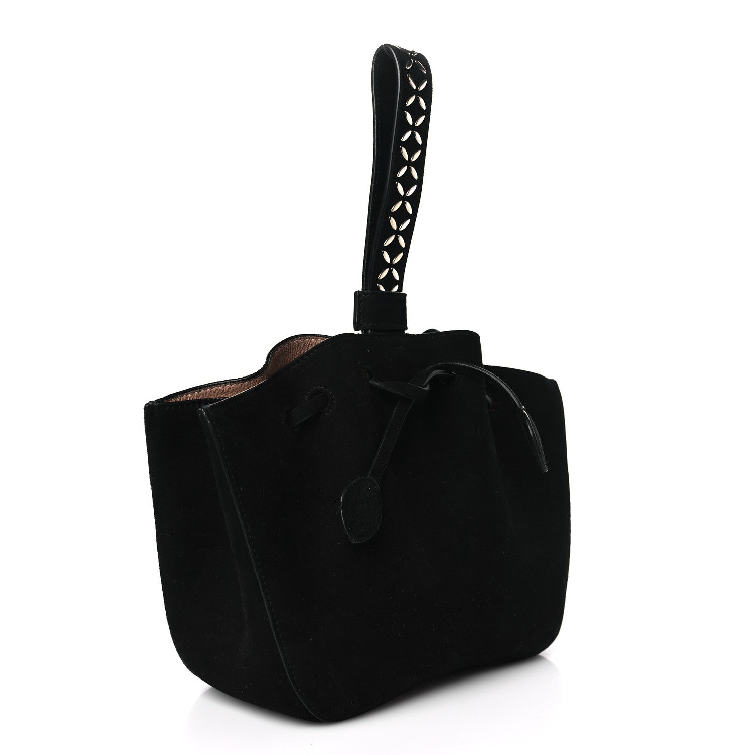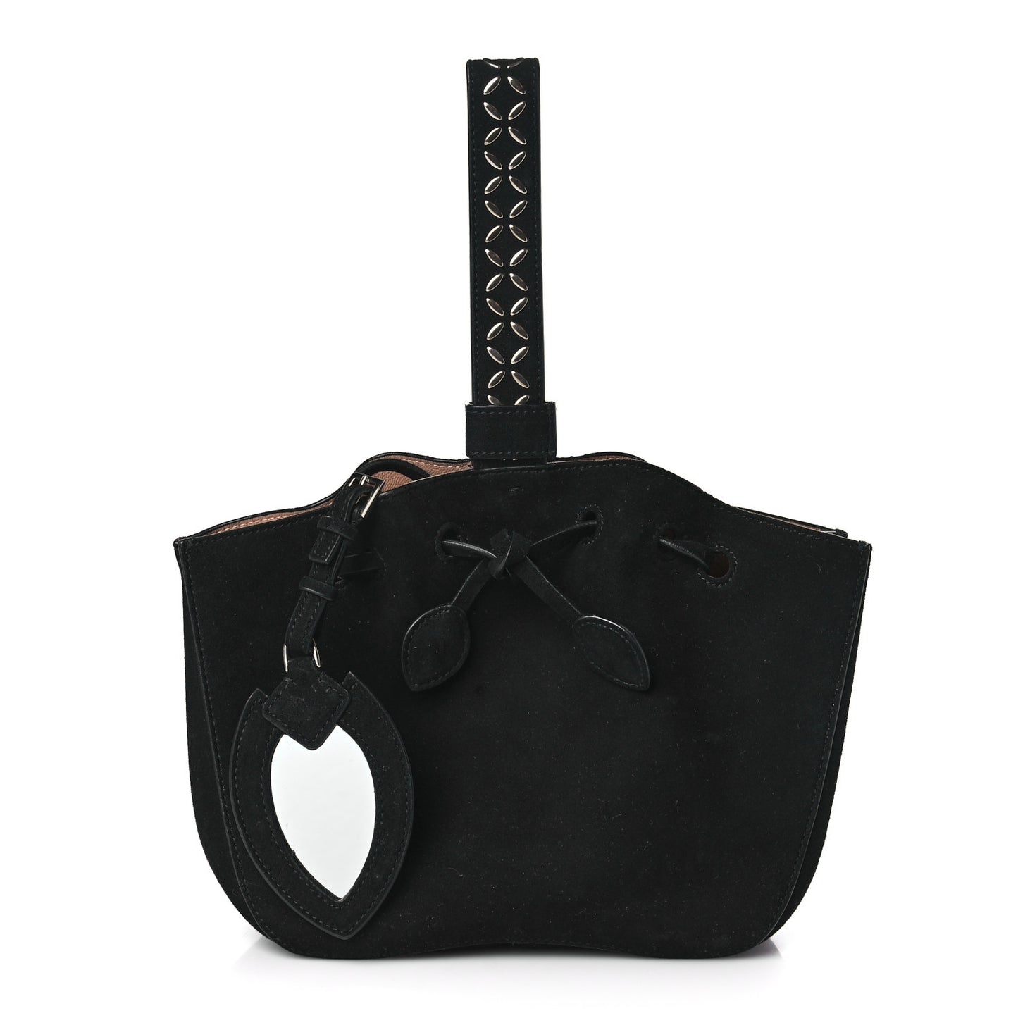 This is an authentic ALAIA Suede Petal Embellished Rose-Marie 19 Bag in Black. This stylish wristlet is crafted of soft microfiber in black with a silver studded handle. The bag features a wristlet and a broad and an easy access open top. There is a spacious beige leather interior with a mirror.Follow this item for alerts. Alaia is a registered trademark of Alaia. FASHIONPHILE is not affiliated with Alaia.