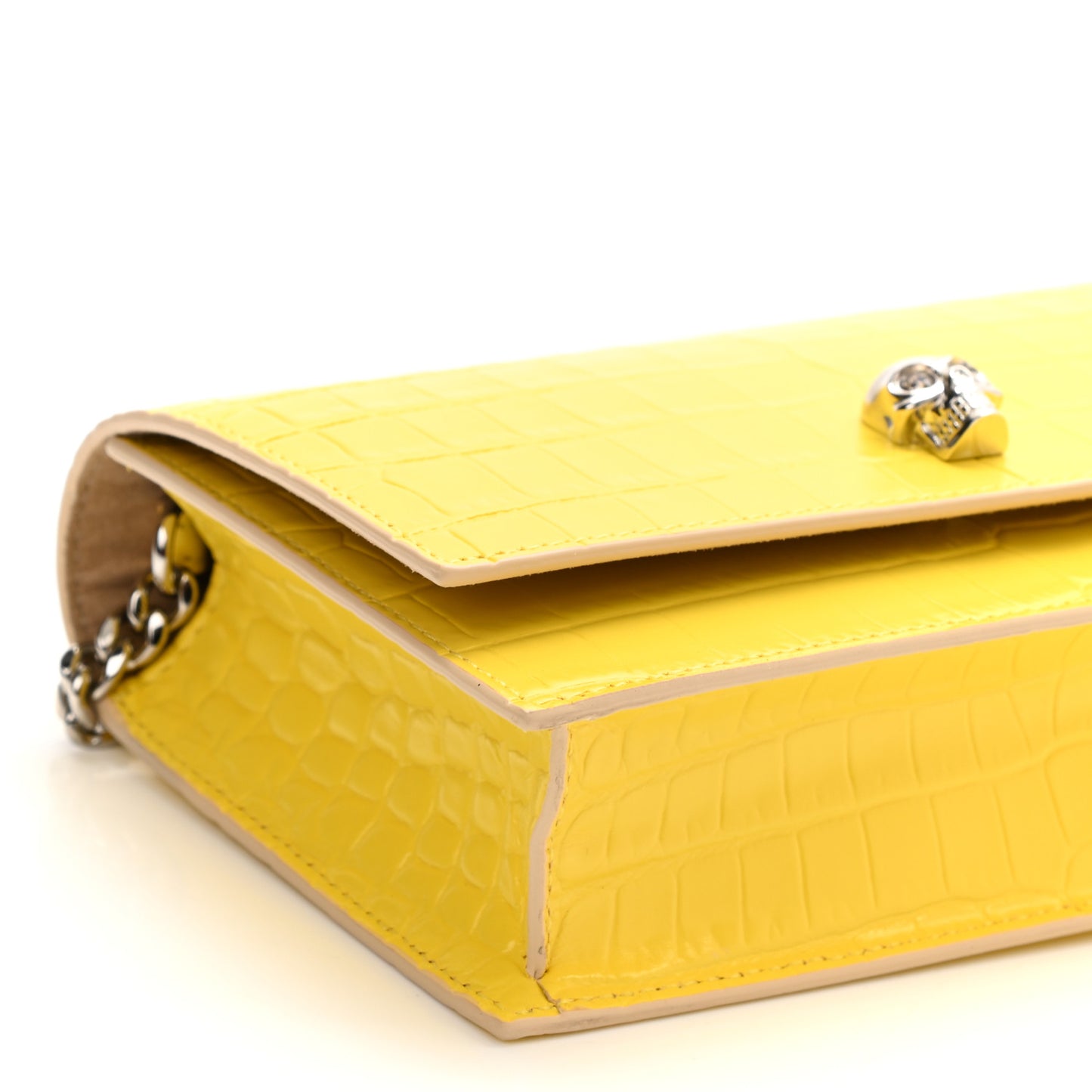 This is an authentic ALEXANDER MCQUEEN Calfskin Crocodile Embossed Skull Mini Crossbody Bag in Yellow. This stunning clutch wallet is crafted of embossed leather in yellow. The wallet features a silver shoulder chain and opens to a fabric interior with a patch pocket.Follow this item for alerts. Alexander McQueen is a registered trademark of Alexander McQueen. FASHIONPHILE is not affiliated with Alexander McQueen.