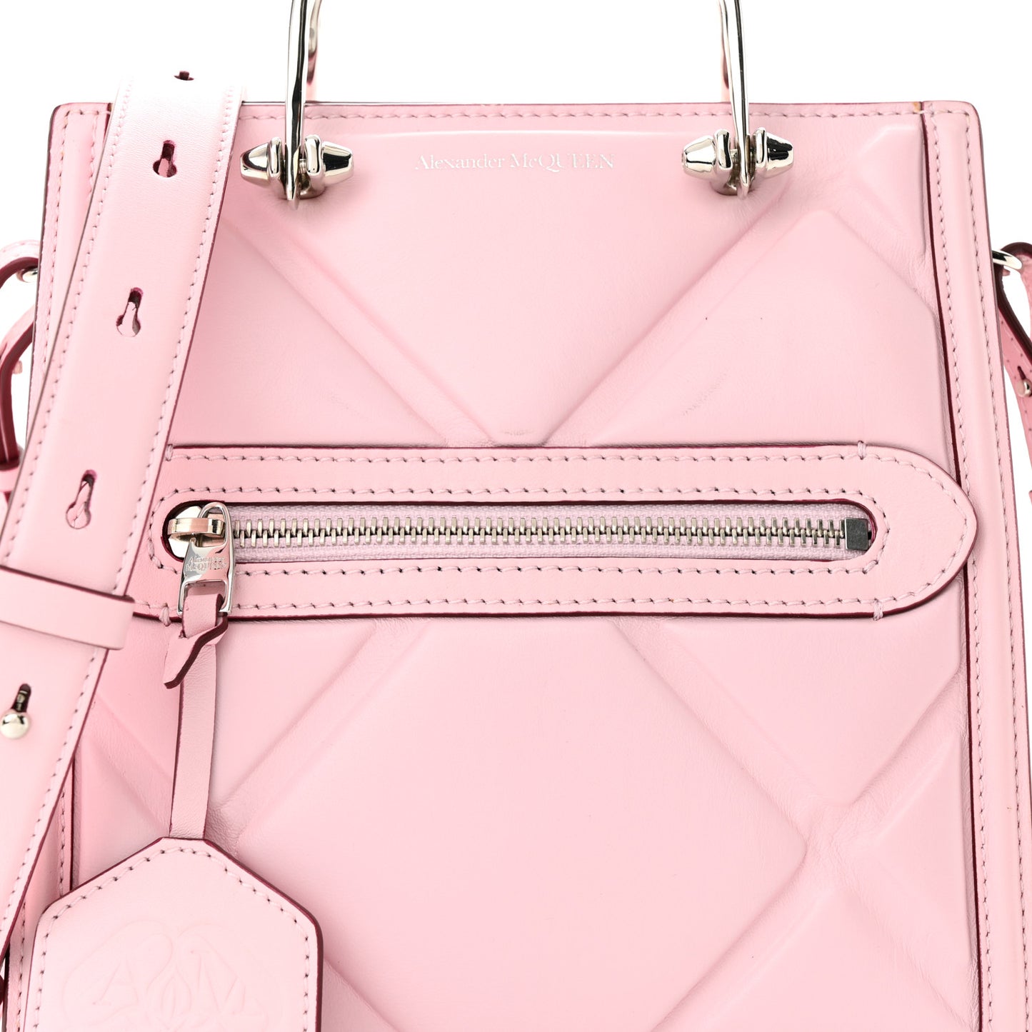 This is an authentic ALEXANDER MCQUEEN Calfskin Quilted The Short Story Shoulder Bag in Pink. This stylish shoulder bag is crafted of smooth, quilted calfskin leather in pink with a front zipper pocket, decorative silver handles and optional leather shoulder strap. The bag opens to a black microfiber interior with pockets.Follow this item for alerts. Alexander McQueen is a registered trademark of Alexander McQueen. FASHIONPHILE is not affiliated with Alexander McQueen.