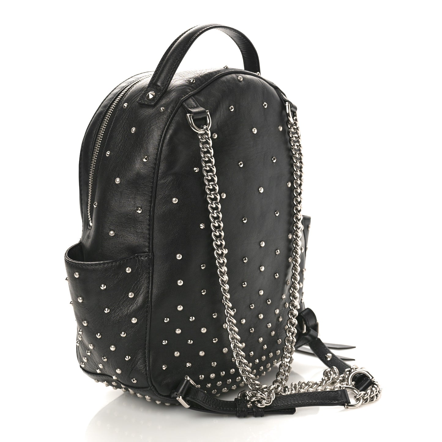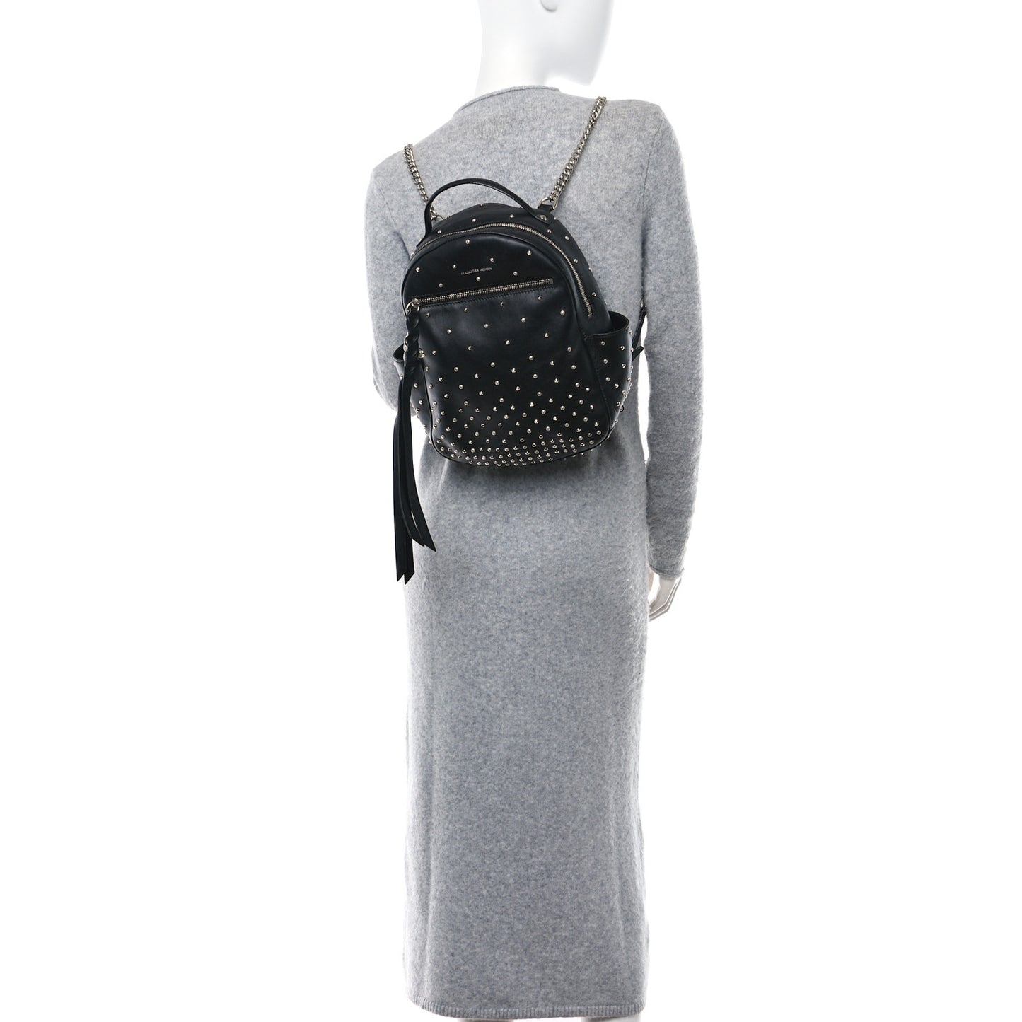 This is an authentic ALEXANDER MCQUEEN Calfskin Studded Small Backpack in Black. This chic bag is crafted with black smooth calfskin leather embellished with silver studs. It features a leather top handle and adjustable shoulder straps and opens to a fabric interior with a zipper pocket and two patch pockets.Follow this item for alerts. Alexander McQueen is a registered trademark of Alexander McQueen. FASHIONPHILE is not affiliated with Alexander McQueen.