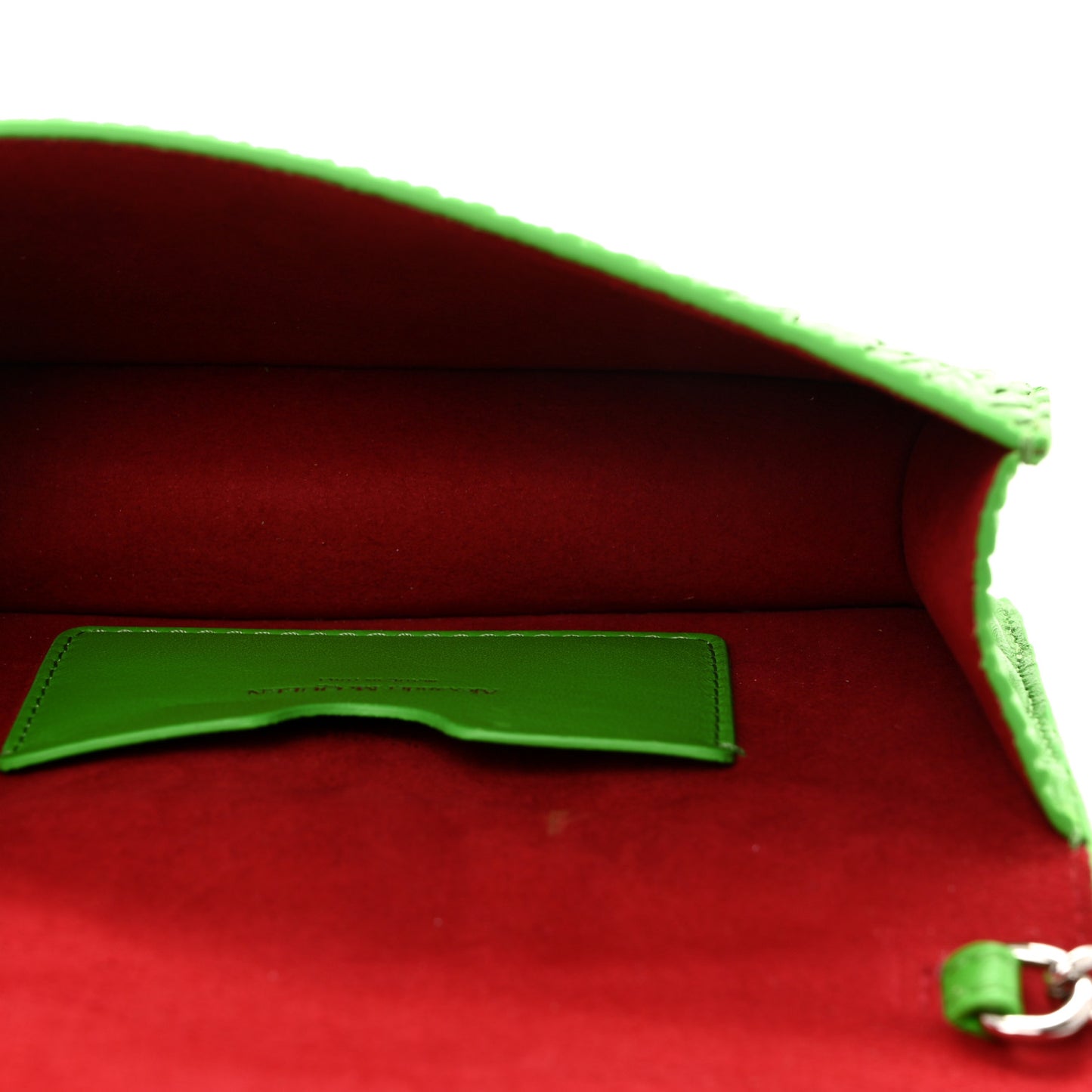 This is an authentic ALEXANDER MCQUEEN Lambskin Pleated Skull Small Chain Crossbody Bag in Acid Green. This chic tote is crafted of pleated lambskin leather in green. The bag features a silver chain shoulder strap and a silver Alexander McQueen skeletal knuckle embellishments. This opens to a red fabric interior with a green leather pocket.Follow this item for alerts. Alexander McQueen is a registered trademark of Alexander McQueen. FASHIONPHILE is not affiliated with Alexander McQueen.