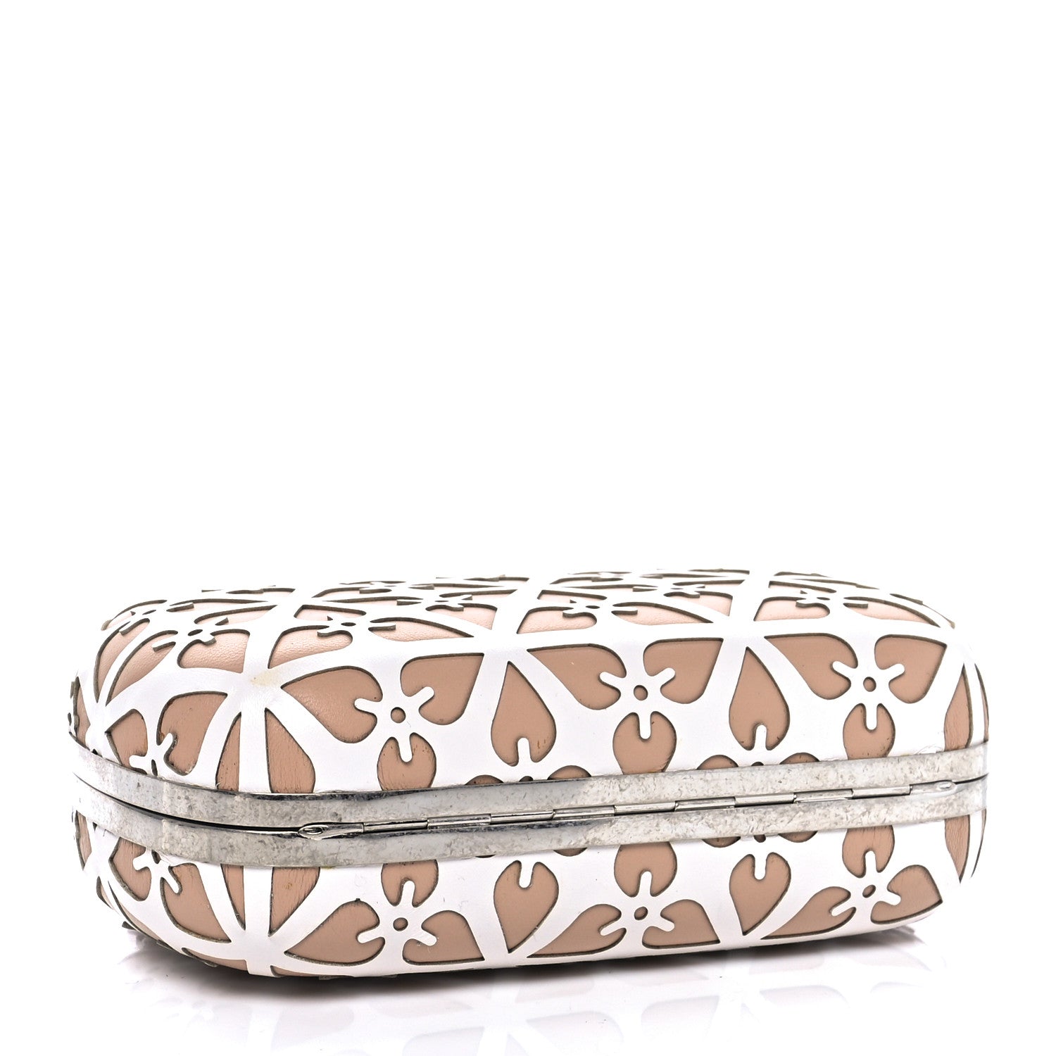 This is an authentic ALEXANDER MCQUEEN Nappa Laser-Cut Skull Box Chain Clutch in Nude and White. This stylish clutch is crafted of beige lambskin leather covered with white laser-cut soft lambskin leather. This evening bag features a silver chain and skull hinge closure embellished with crystals.Follow this item for alerts. Alexander McQueen is a registered trademark of Alexander McQueen. FASHIONPHILE is not affiliated with Alexander McQueen.