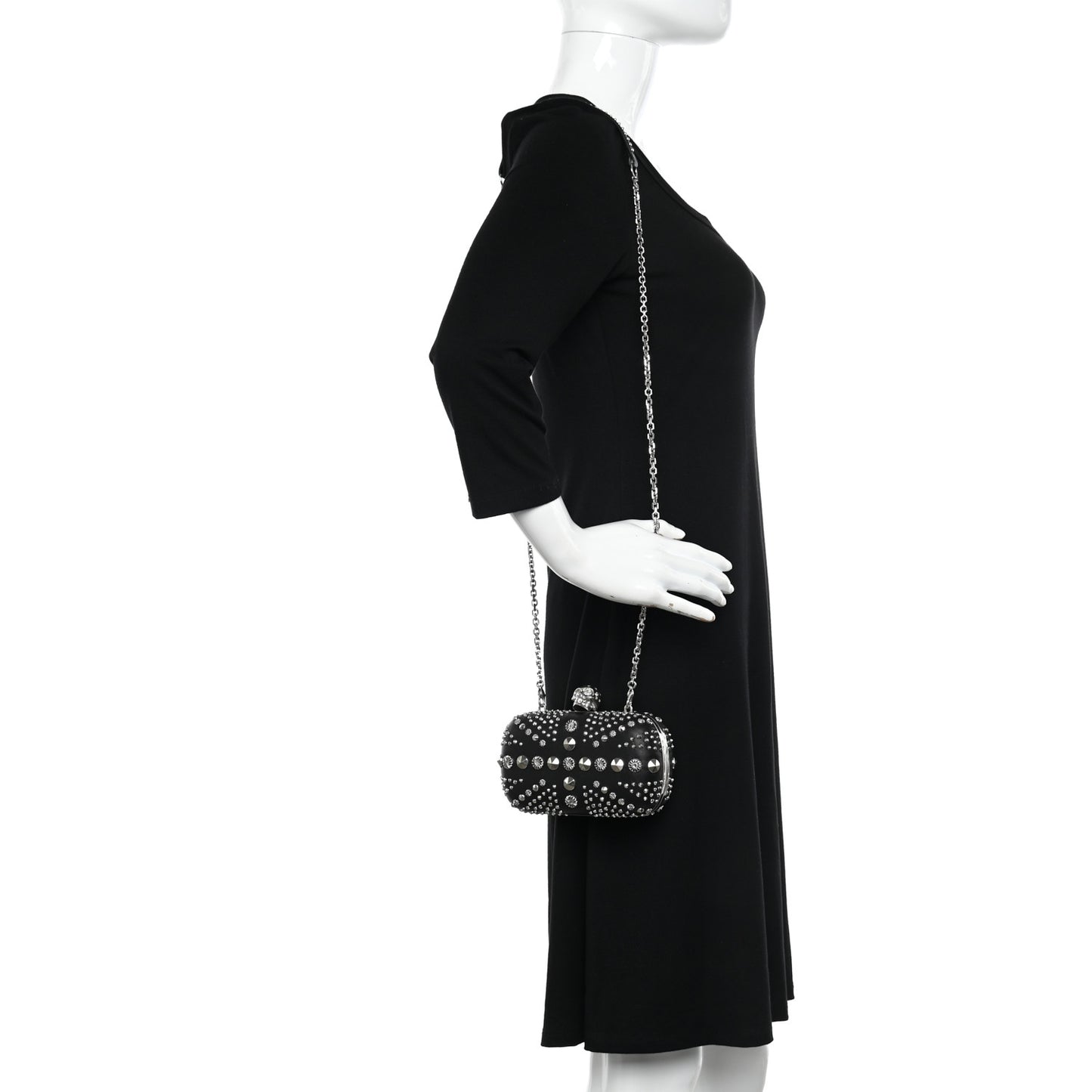 This is an authentic ALEXANDER MCQUEEN Nappa Studded Britannia Skull Box Clutch in Black. This stylish clutch is crafted of black Nappa calf leather with elaborate studded detailing in the form of a Union Jack flag on the face and on the reverse. The clutch features a silver cage and a silver crystal eyed scull kiss lock that opens to a black leather interior.Follow this item for alerts. Alexander McQueen is a registered trademark of Alexander McQueen. FASHIONPHILE is not affiliated with Alexander McQueen.