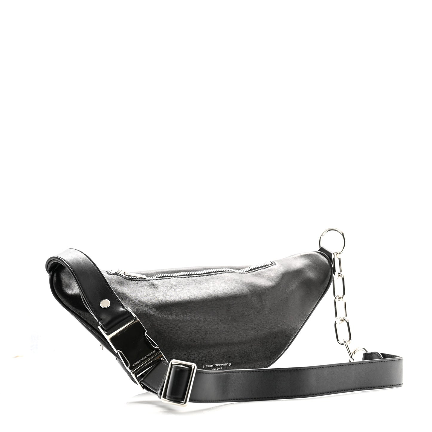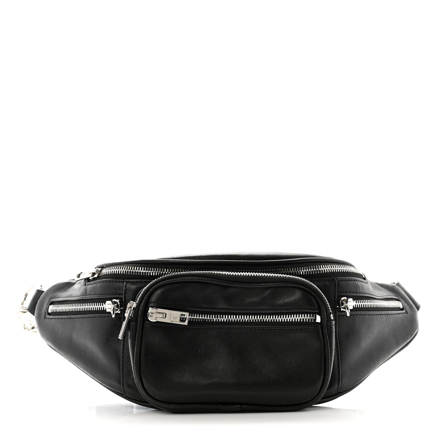 This is an authentic ALEXANDER WANG Lambskin Attica Belt Bag in Black. This stylish belt bag is crafted of black lambskin leather. This bag features multiple exterior zipper pockets, an adjustable leather belt strap with silver chains, and silver hardware. The main zipper opens to a black nylon fabric interior.Follow this item for alerts. Alexander Wang is a registered trademark of Alexander Wang. FASHIONPHILE is not affiliated with Alexander Wang.