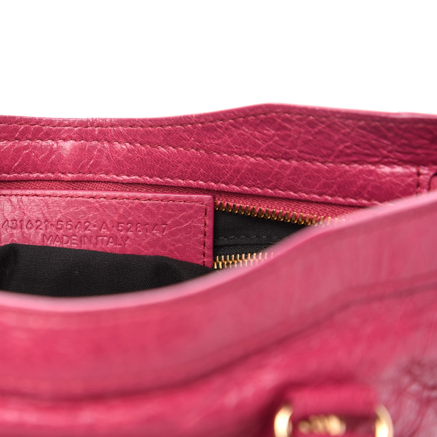 This is an authentic BALENCIAGA Agneau Classic Gold Hardware S City in Rose Dahlia. This stylish tote is crafted of beautiful lambskin leather in deep pink. The bag features top handles with hand-stitched detail, an optional shoulder strap, a frontal zipper pocket for the hanging mirror, leather belts and patches, and gold tone hardware including buckles and studs. The top zipper opens to a black fabric interior with zipper and patch pockets.Follow this item for alerts. Balenciaga is a registered trademark of Balenciaga. FASHIONPHILE is not affiliated with Balenciaga.