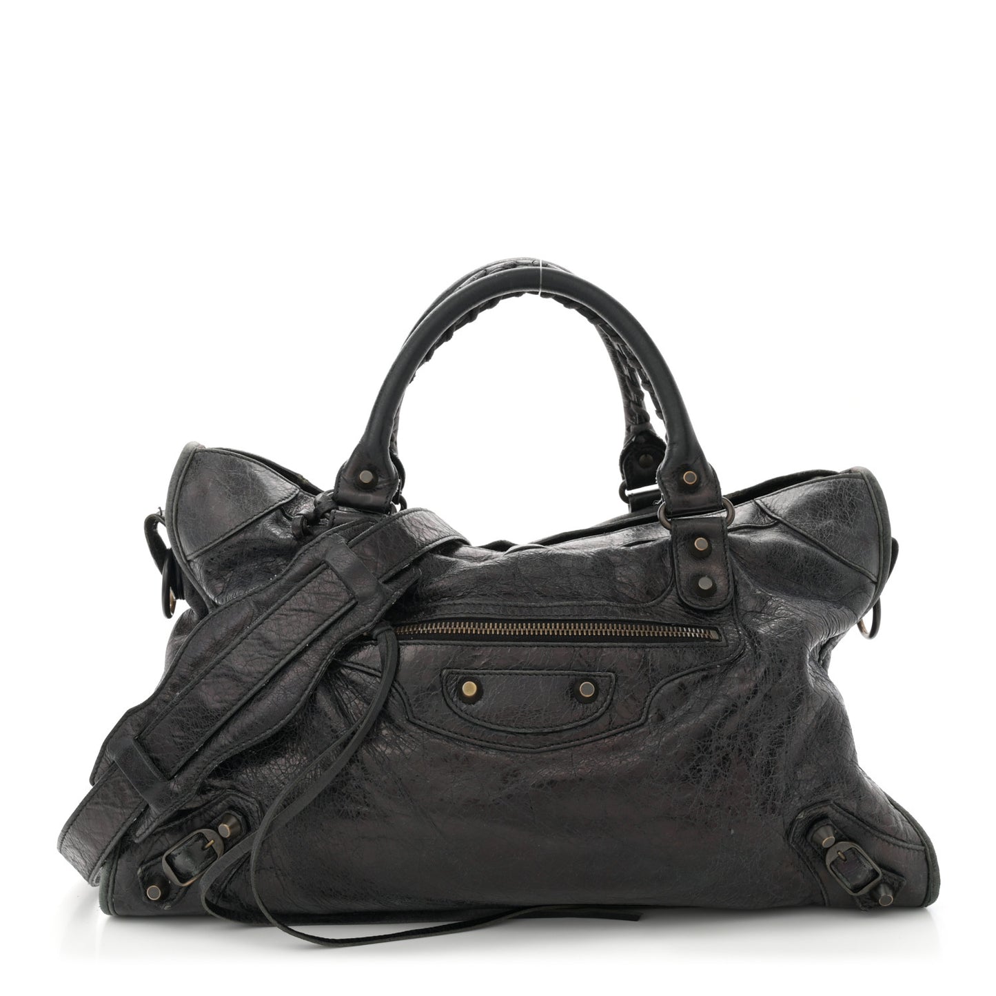 This is an authentic BALENCIAGA Agneau Classic Hardware City in Black. This chic tote is crafted of distressed lambskin leather in black, accented with dark brass hardware buckles and studs. The bag features an exterior zipper pocket with a removable mirror, rolled leather top handles with handwoven whipstitch detail, and an optional shoulder strap. The overextended top zippers open the bag to a black fabric interior a zipper pocket.Follow this item for alerts. Balenciaga is a registered trademark of Balenciaga. FASHIONPHILE is not affiliated with Balenciaga.