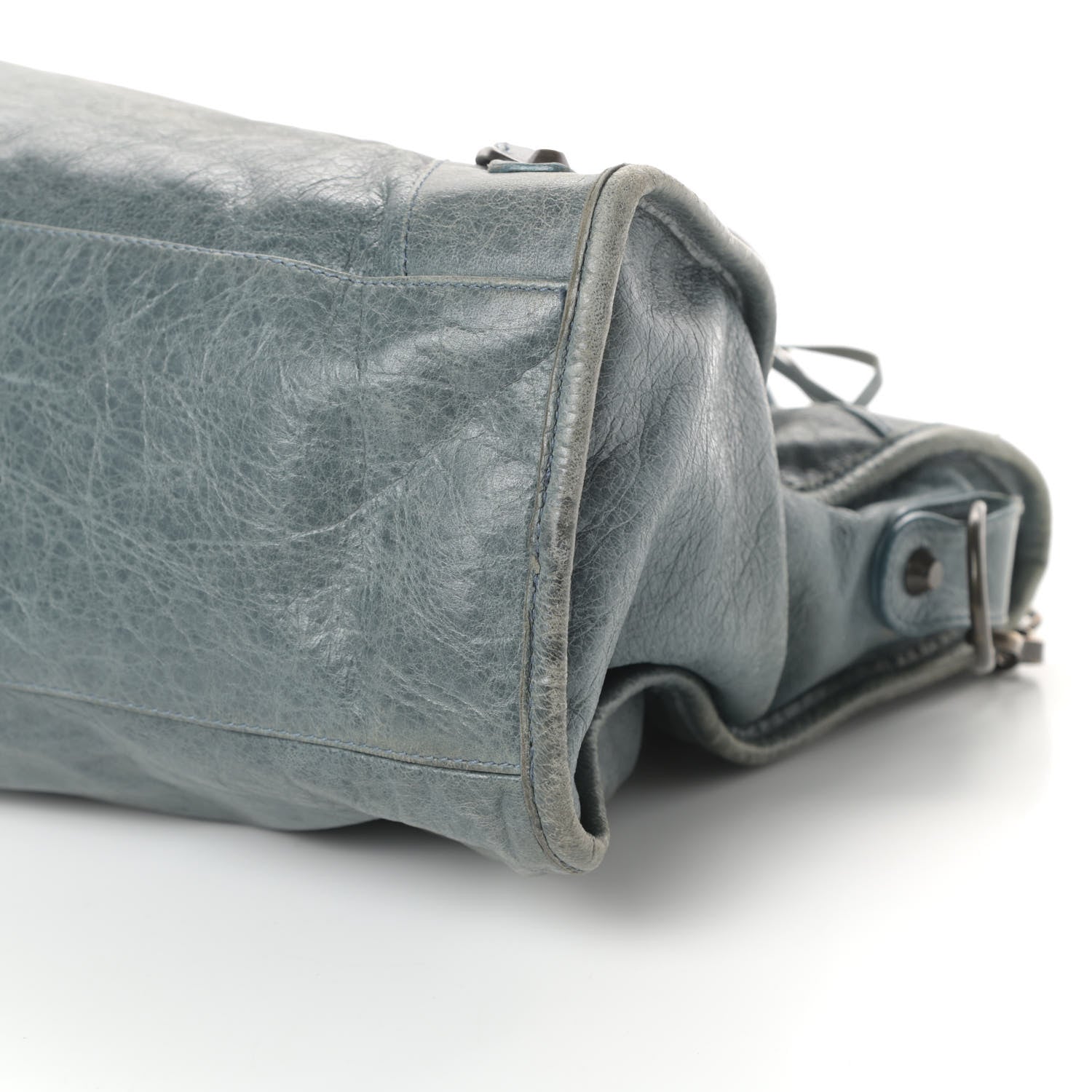 This is an authentic BALENCIAGA Agneau Classic Hardware City in Tempete. This is made of luscious, soft distressed agneau lambskin leather in blue. This hand bag features rolled leather handles, an optional shoulder strap and brass hardware that includes studs, buckles, d-rings and zipper pulls. The top zipper opens to a black fabric interior with a zipper pocket. A luxurious and eye catching tote, this bag is ideal for daily excursions of all kinds, by Balenciaga!