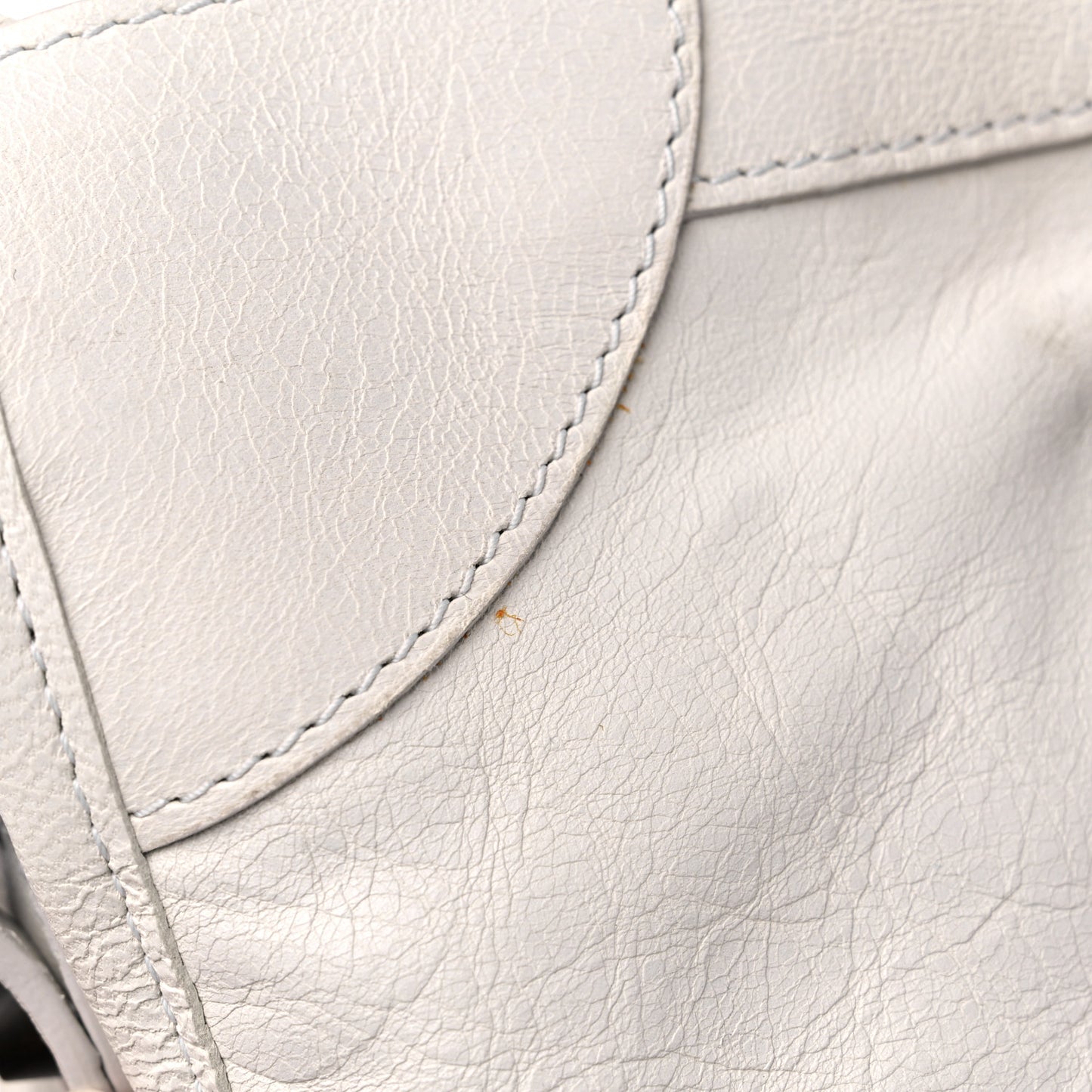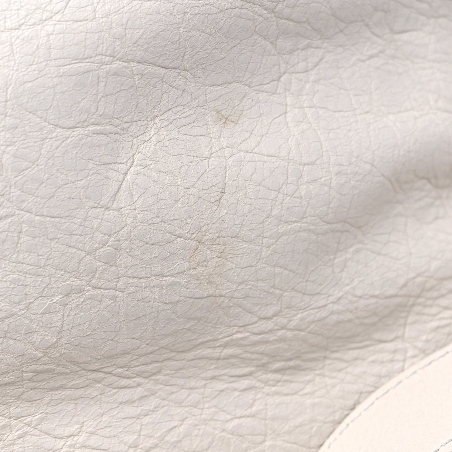 This is an authentic BALENCIAGA Agneau Classic Hardware City in White. This chic tote is crafted of distressed lambskin leather in white, accented with aged brass buckles and studs. The bag features an exterior zipper pocket with a removable mirror, rolled leather top handles with handwoven whipstitch detail, and an optional shoulder strap. The overextended top zippers open the bag to a black fabric interior with pockets.Follow this item for alerts. Balenciaga is a registered trademark of Balenciaga. FASHIONPHILE is not affiliated with Balenciaga.