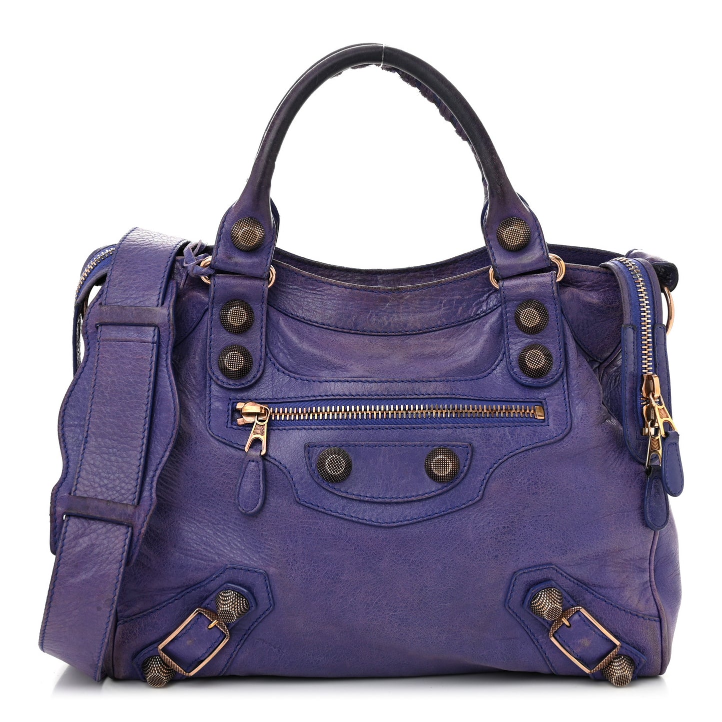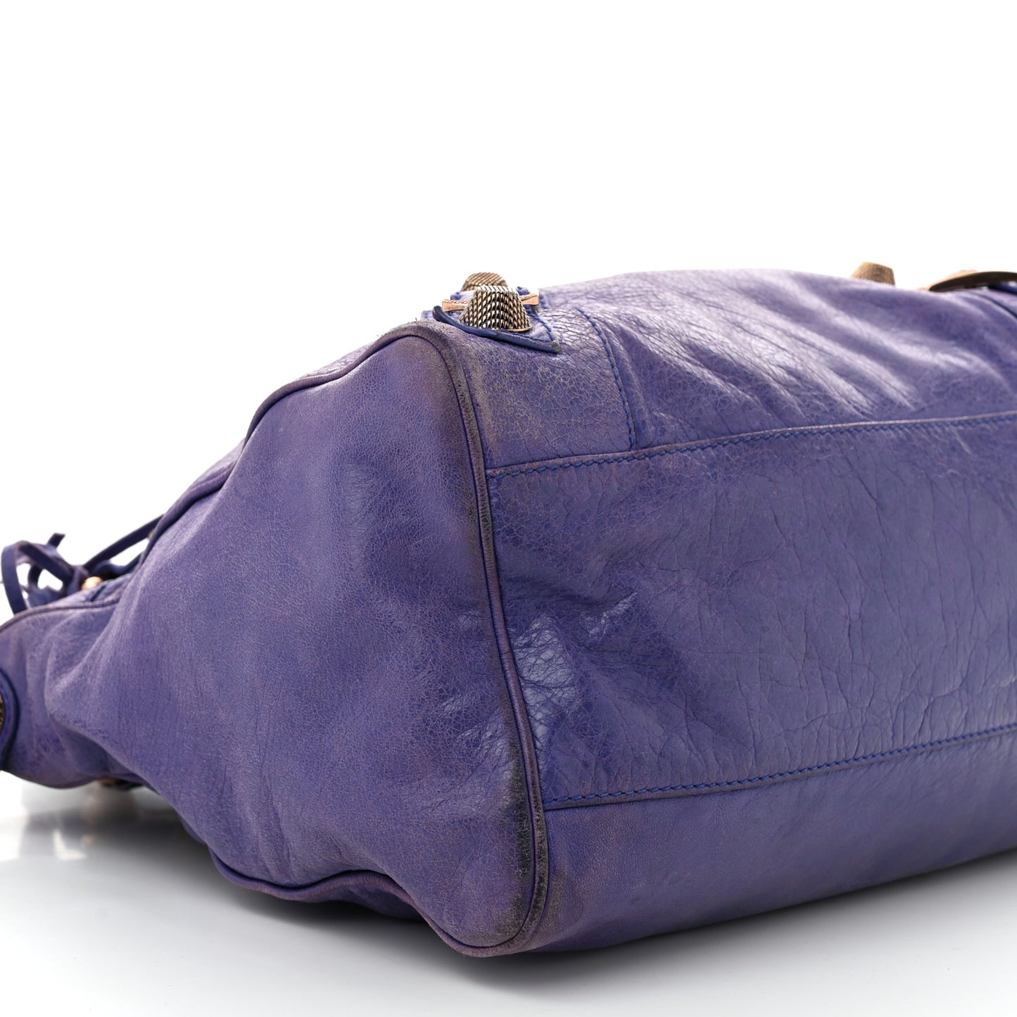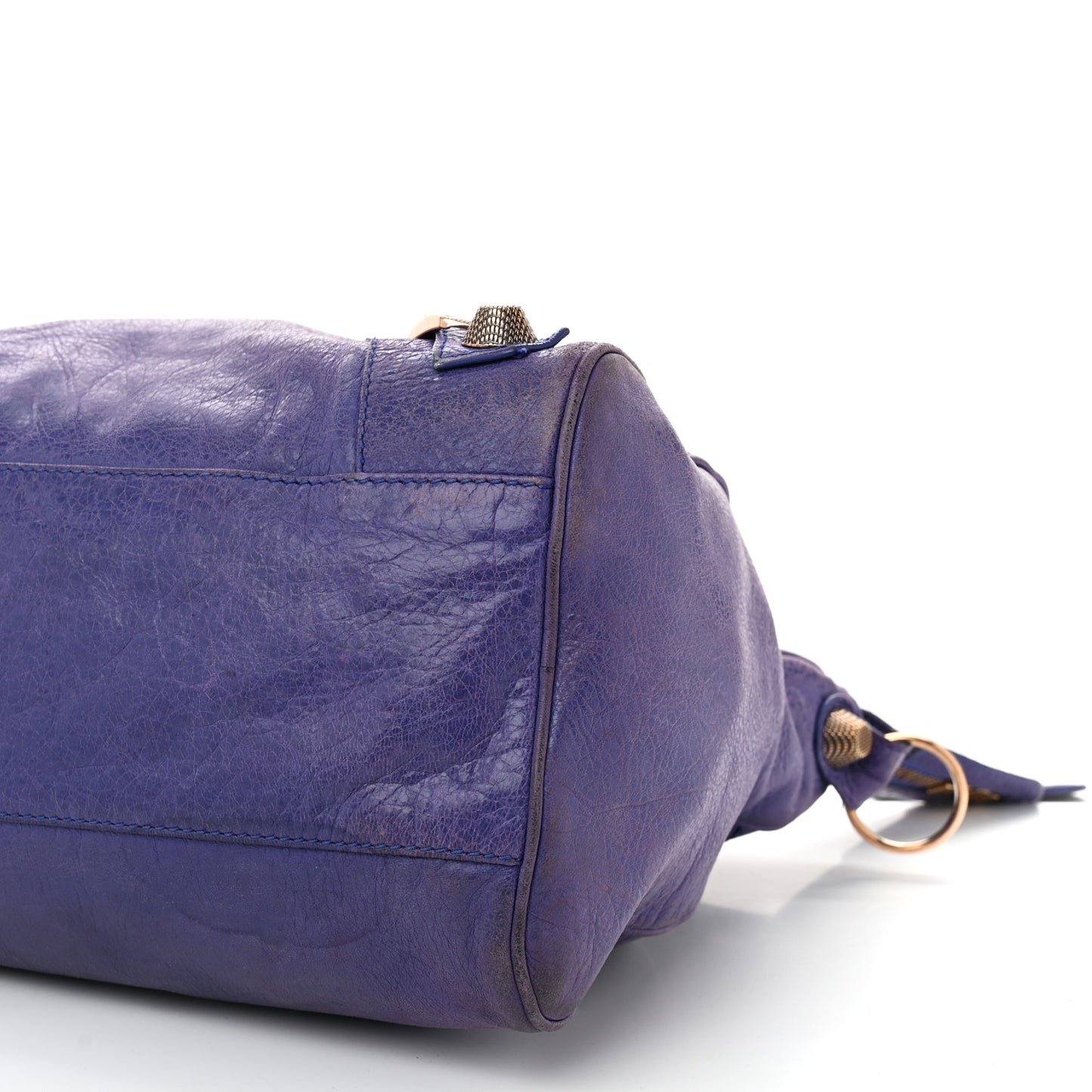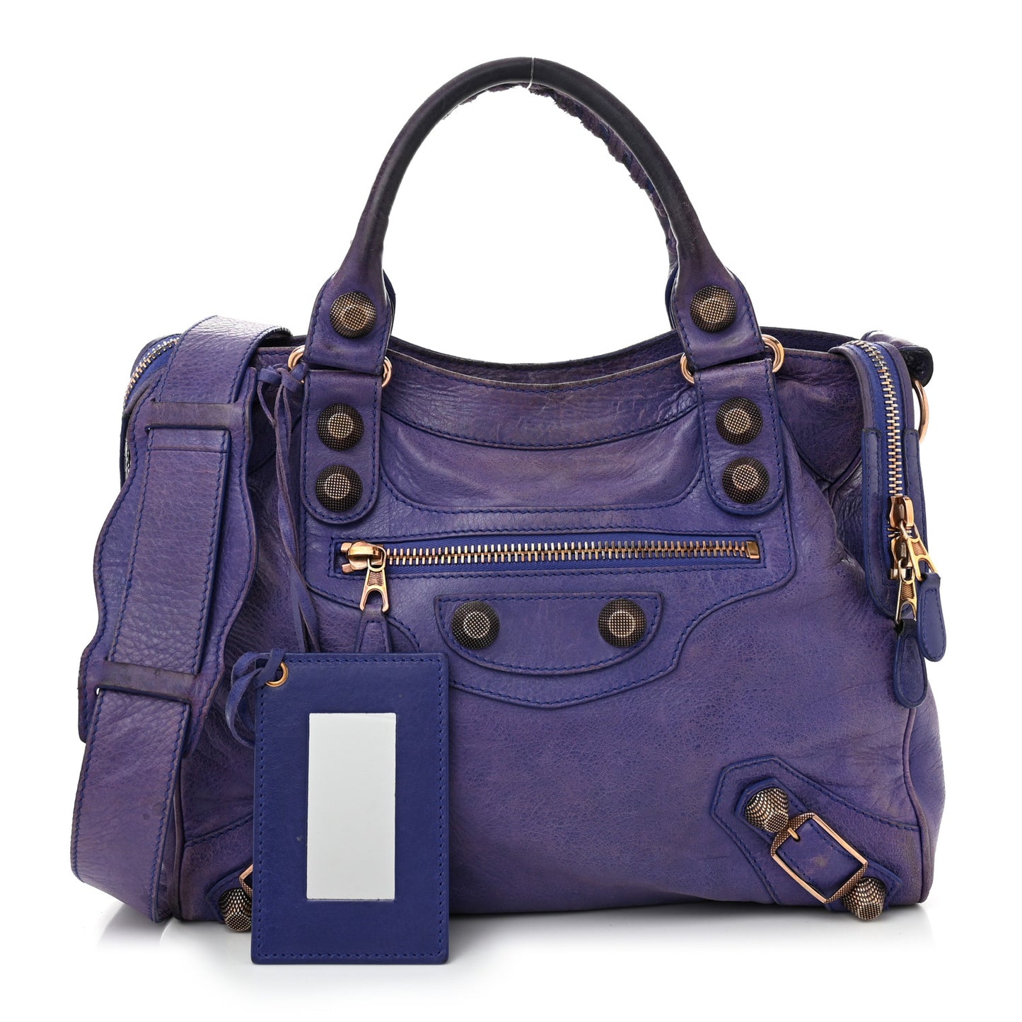 This is an authentic BALENCIAGA Agneau Giant 21 Rose Gold Hardware Velo in Bleu Lavande. This stylish tote is crafted of soft lambskin leather in purple. It features rolled leather top handles, a detachable shoulder strap, an exterior zip pocket for the hanging mirror, patches and belts, and textured rose gold hardware including buckles and giant studs. The top zipper opens to a black fabric interior with a zipper pocket.Follow this item for alerts. Balenciaga is a registered trademark of Balenciaga. FASHIONPHILE is not affiliated with Balenciaga.