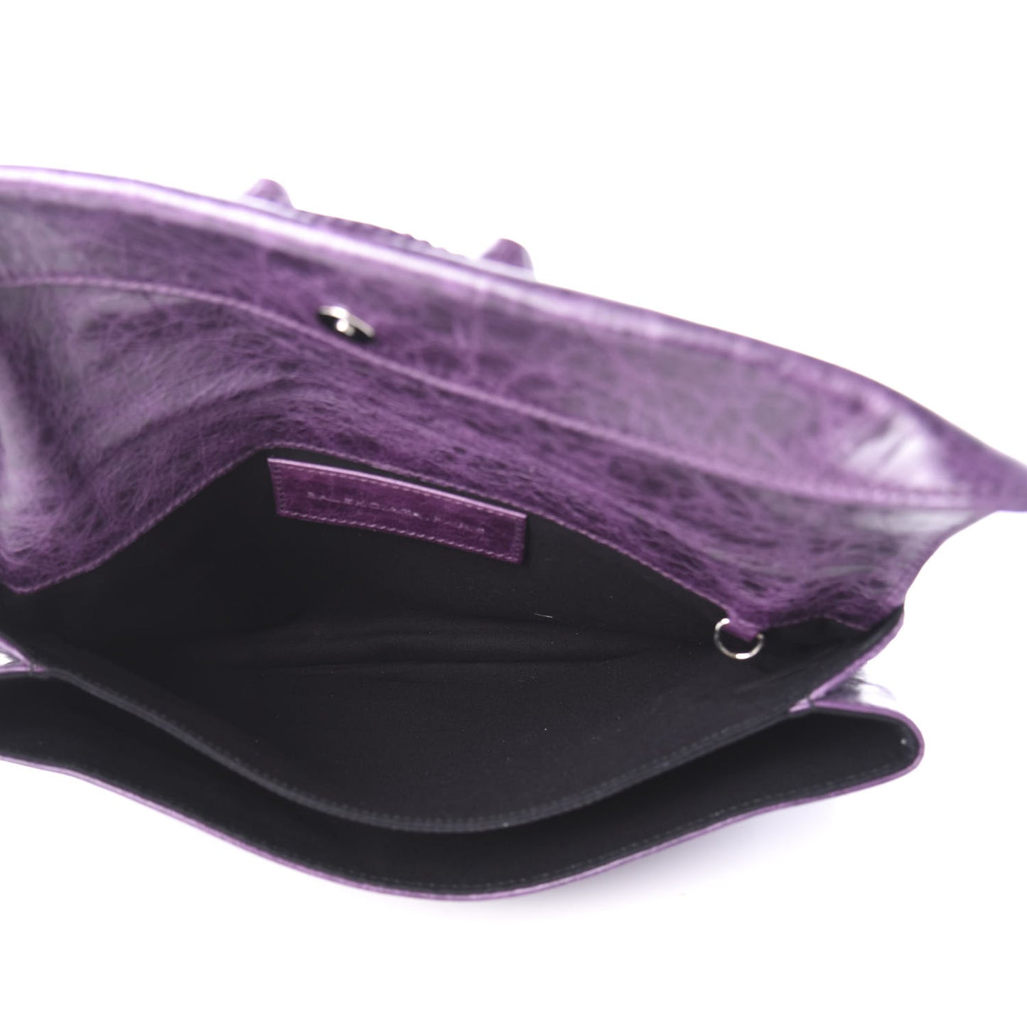 This is an authentic BALENCIAGA Agneau Giant Covered Envelope Clutch in Raisin. This stylish clutch is crafted of soft lambskin leather in purple. It features a exterior zip pocket, patches, belts, and textured silver hardware including buckles and giant covered studs. The flap opens to reveal a partitioned black fabric interior. This is an ideal clutch for day or evening, from Balenciaga!Follow this item for alerts. Balenciaga is a registered trademark of Balenciaga. FASHIONPHILE is not affiliated with Balenciaga.