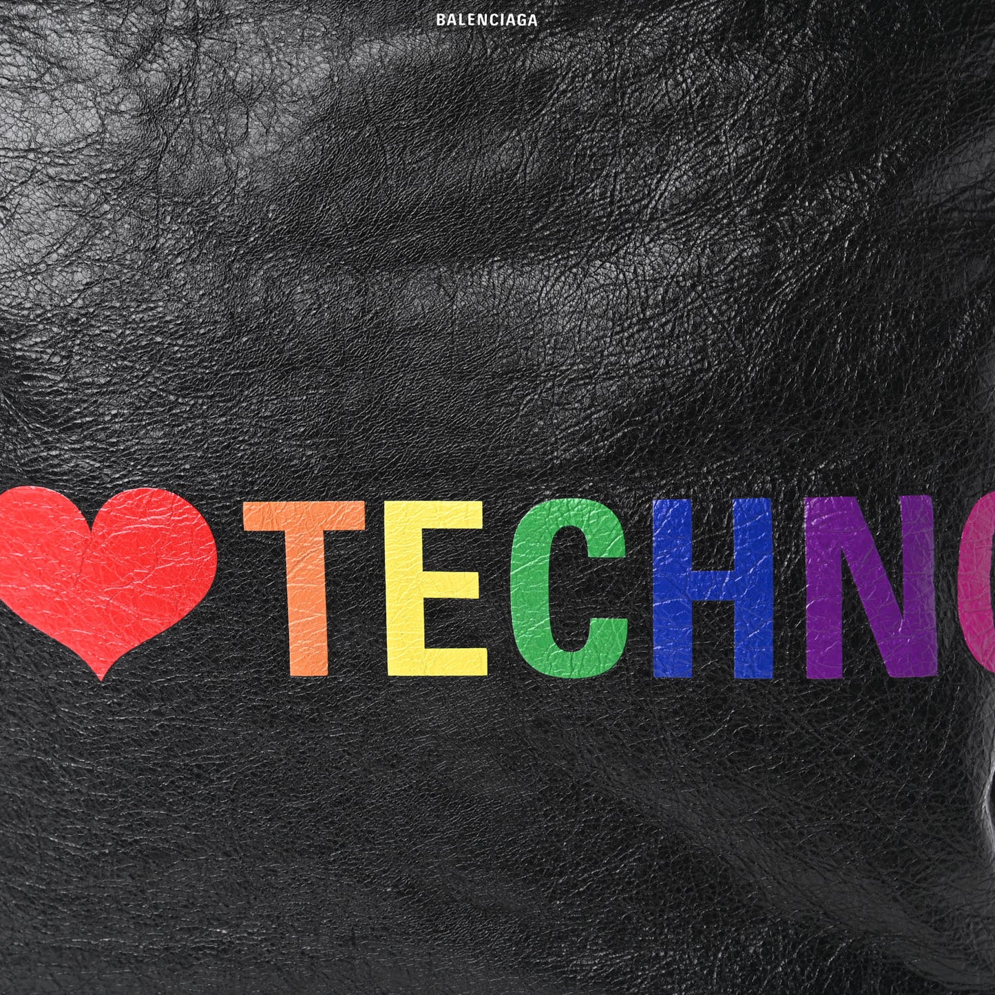 This is an authentic BALENCIAGA Agneau I Love Techno Supermarket Shopper L in Black and Multicolor. This chic handbag is crafted of smooth black calfskin leather, with a facing rainbow "I heart techno" logo print. The bag features long leather top handles and opens to a spacious black leather and fabric interior with zipper pockets.Follow this item for alerts. Balenciaga is a registered trademark of Balenciaga. FASHIONPHILE is not affiliated with Balenciaga.