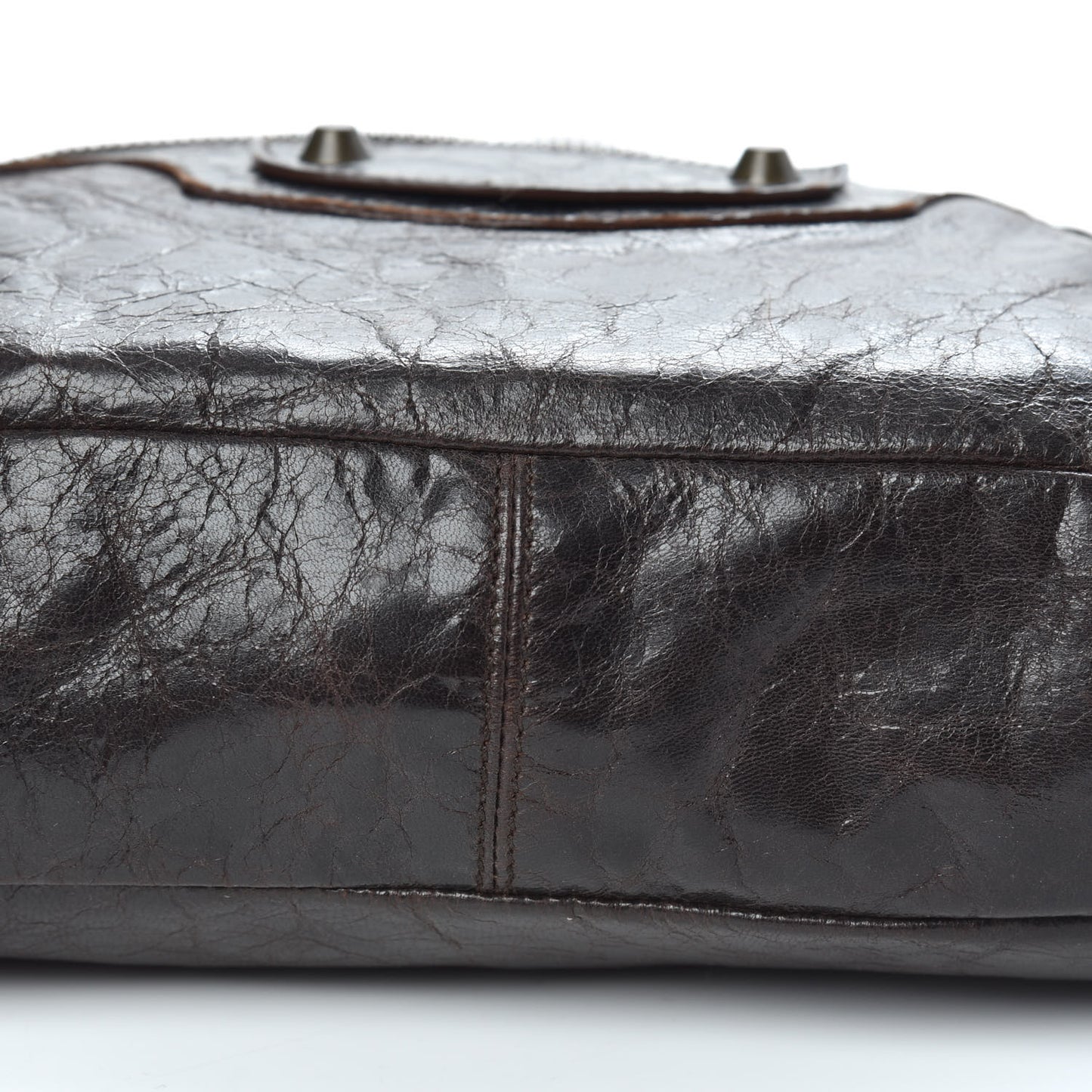 This is an authentic BALENCIAGA Chevre Classic Hardware First in Chocolate. This stylish tote is beautifully crafted of chevre calfskin leather in dark brown. The bag features leather top handles with a hand woven detail, a frontal zipper pocket with a leather framed mirror, decorative belts and aged hardware including buckles and studs. The top zipper opens to a black fabric interior with zipper and patch pockets.Follow this item for alerts. Balenciaga is a registered trademark of Balenciaga. FASHIONPHILE is not affiliated with Balenciaga.