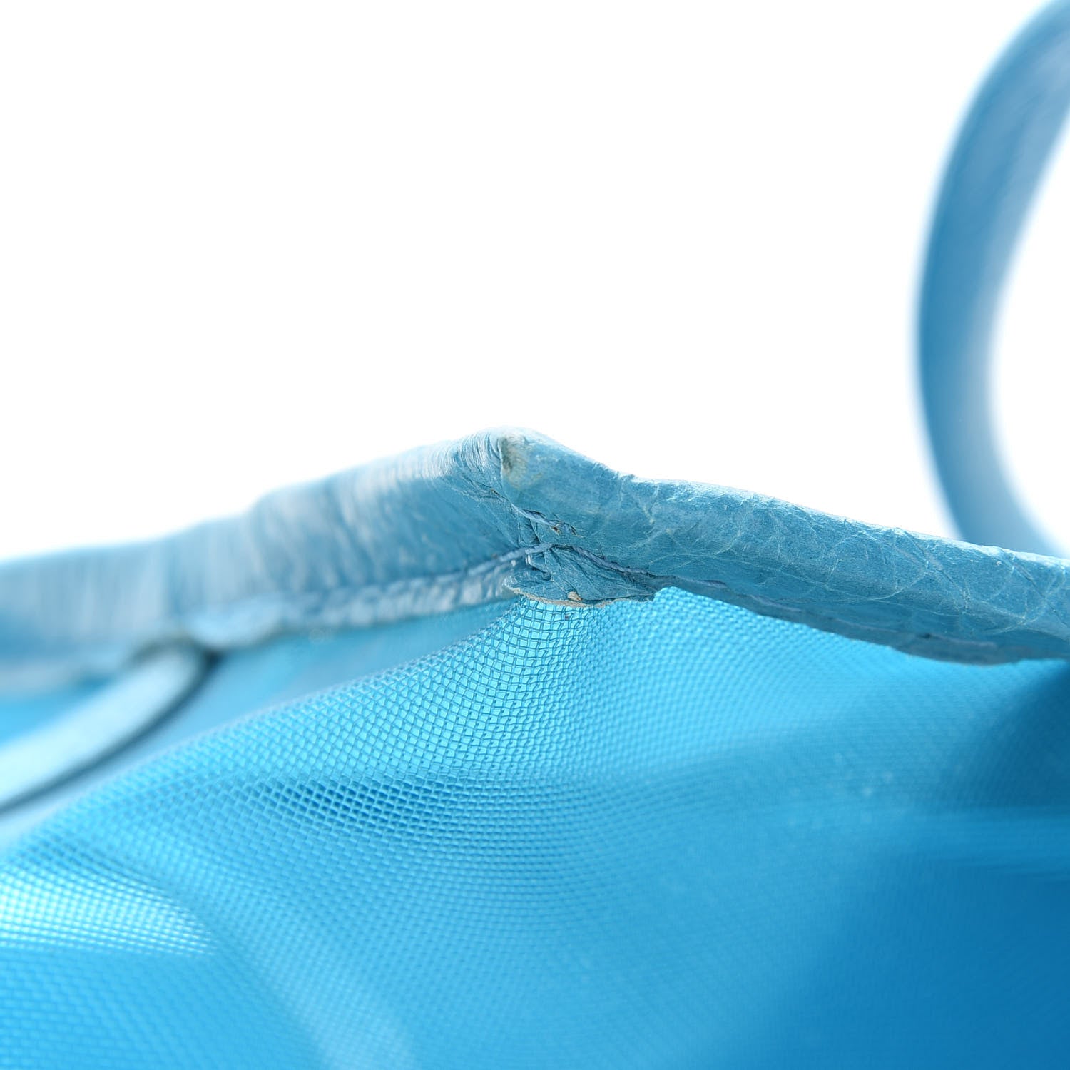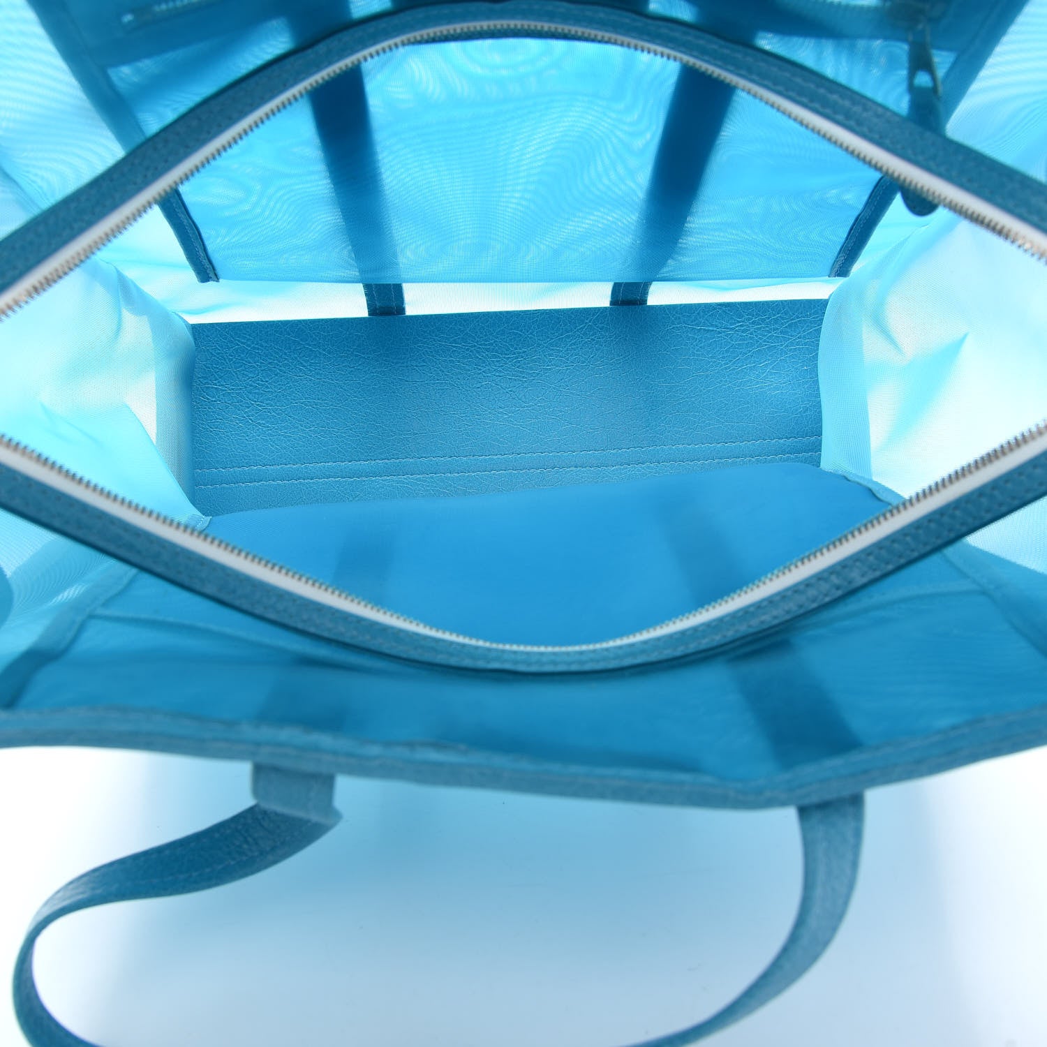 This is an authentic BALENCIAGA Mesh Medium Bazar Shopper Tote in Blue. This stylish tote is crafted of leather and mesh in bright blue. The handbag features top handles and polished silver hardware. The top opens top opens to a matching mesh interior with a leather base and a hanging zipper pocket.