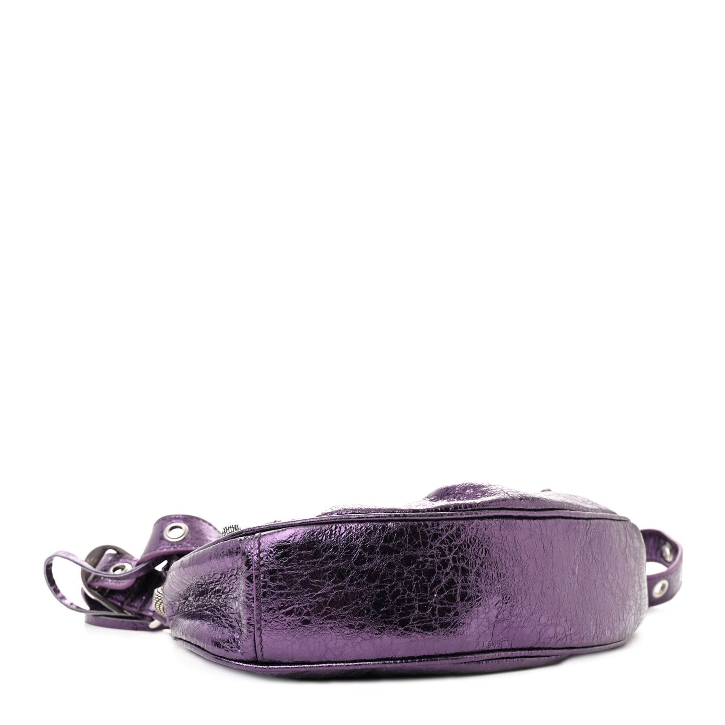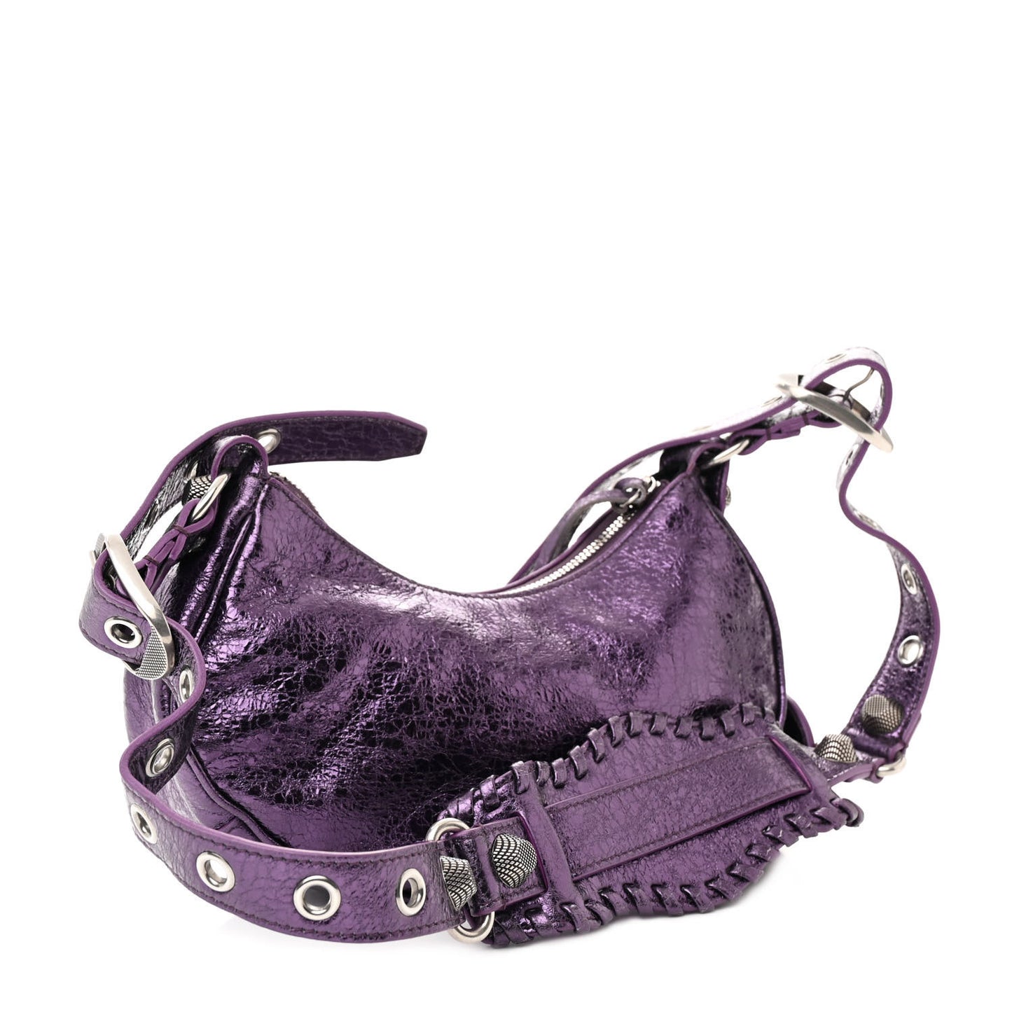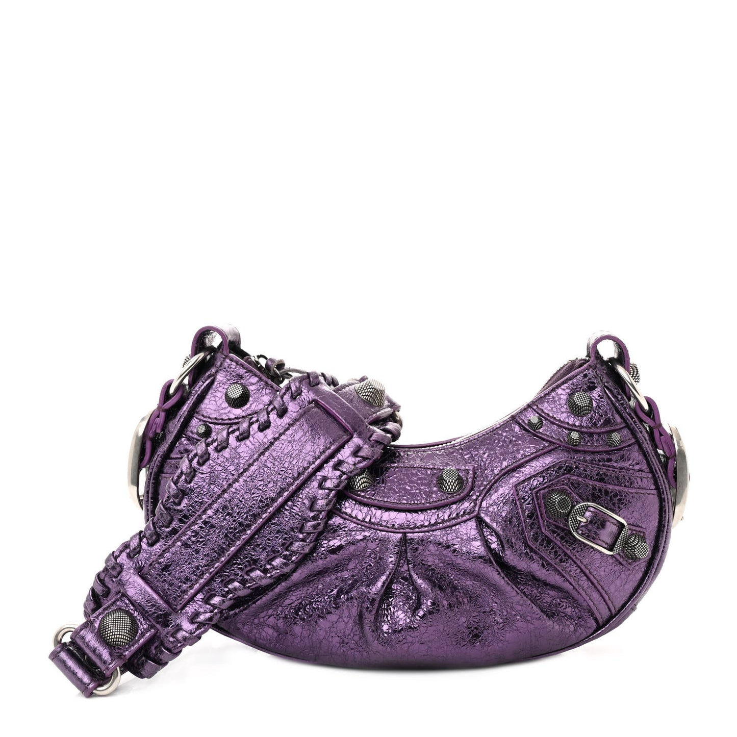 This is an authentic BALENCIAGA Metallic Agneau Arena Le Cagole Shoulder Bag XS in Met Mauve. This stylish and structured handbag is crafted of metallic leather in purple calfskin leather. The bag features an adjustable shoulder strap, a coin purse, a heart shaped mirror, and signature silver studs and faux buckles. The top unzips to a black fabric compact interior.Follow this item for alerts. Balenciaga is a registered trademark of Balenciaga. FASHIONPHILE is not affiliated with Balenciaga.