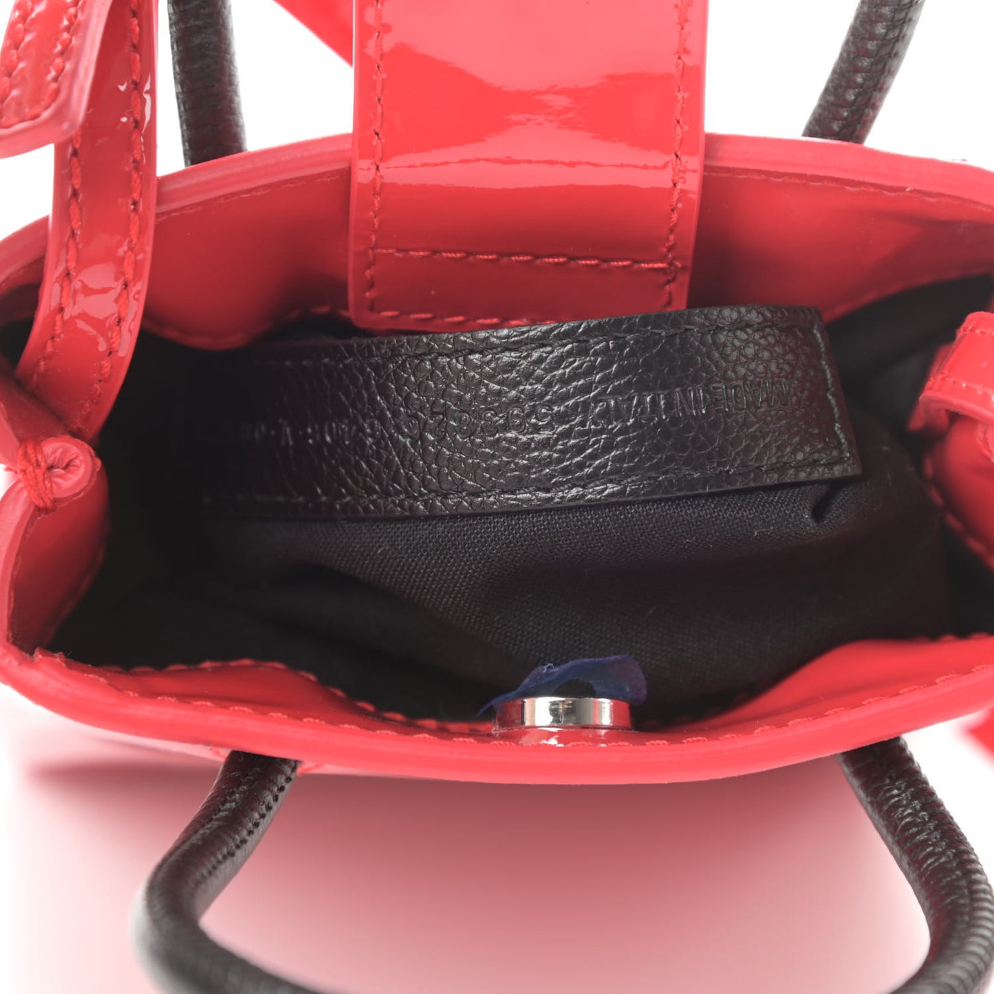 This is an authentic BALENCIAGA Patent Calfskin Logo Shopping Phone Holder Bag in Bright Red. This stylish handbag is crafted of red calfskin patent leather. The handbag features thin black leather top handles and an adjustable red leather crossbody strap. The top is open to a black fabric interior with a patch pocket.Follow this item for alerts. Balenciaga is a registered trademark of Balenciaga. FASHIONPHILE is not affiliated with Balenciaga.