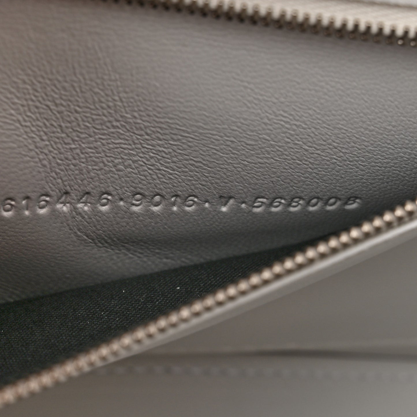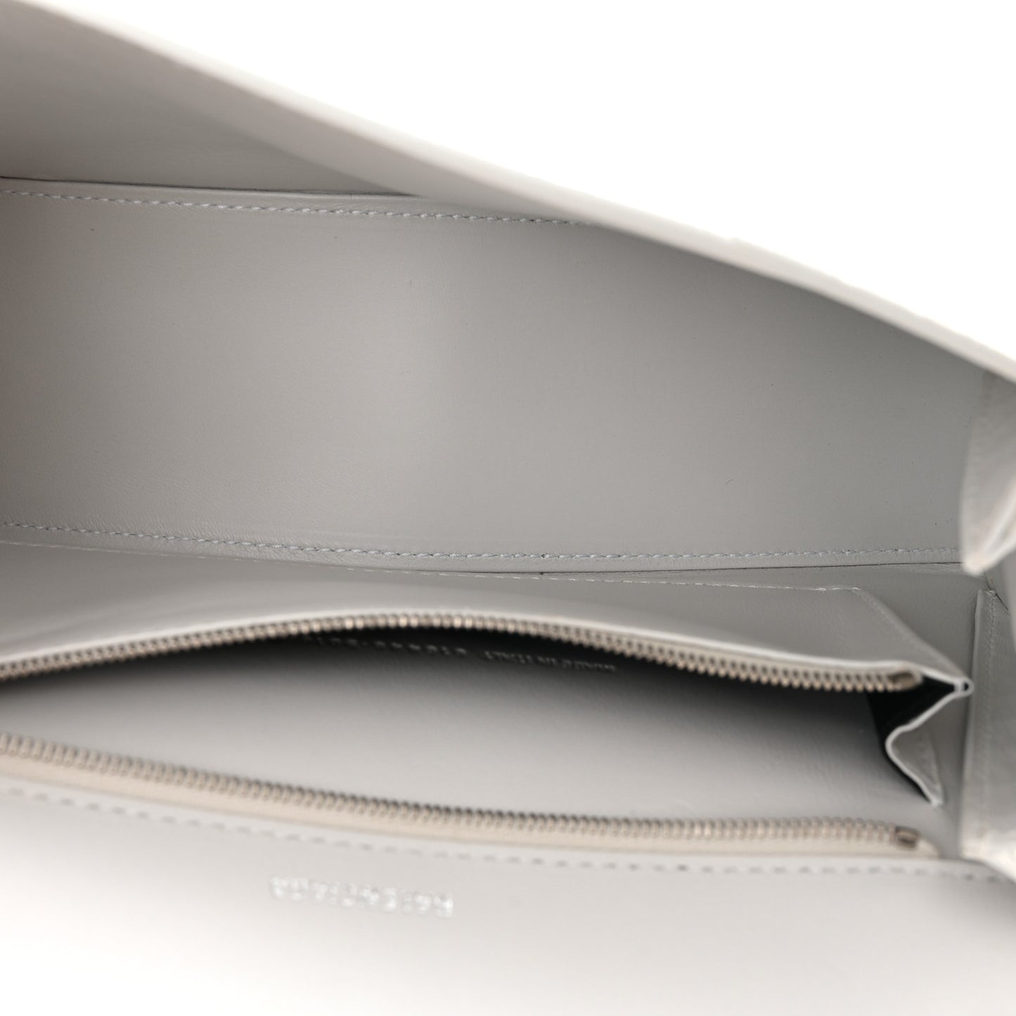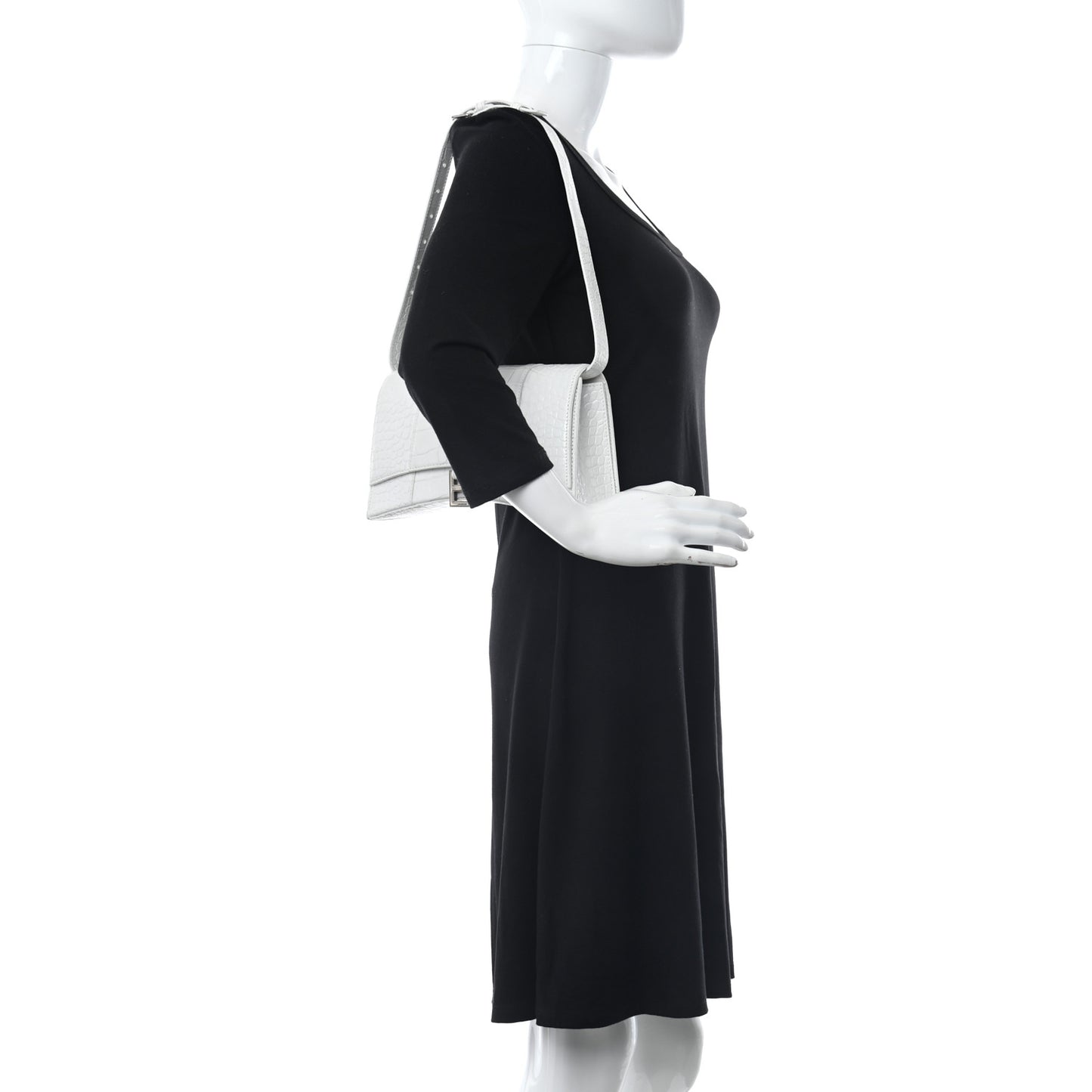 This is an authentic BALENCIAGA Shiny Calfskin Crocodile Embossed Small Hourglass Sling Shoulder Bag in White. This stylish petite handbag is beautifully crafted of crocodile-stamped glazed calfskin in white. It features a matching optional shoulder strap. This bag also features the signature Balenciaga B charm. The front flap opens to a leather interior with a zipper pocket.Follow this item for alerts. Balenciaga is a registered trademark of Balenciaga. FASHIONPHILE is not affiliated with Balenciaga.