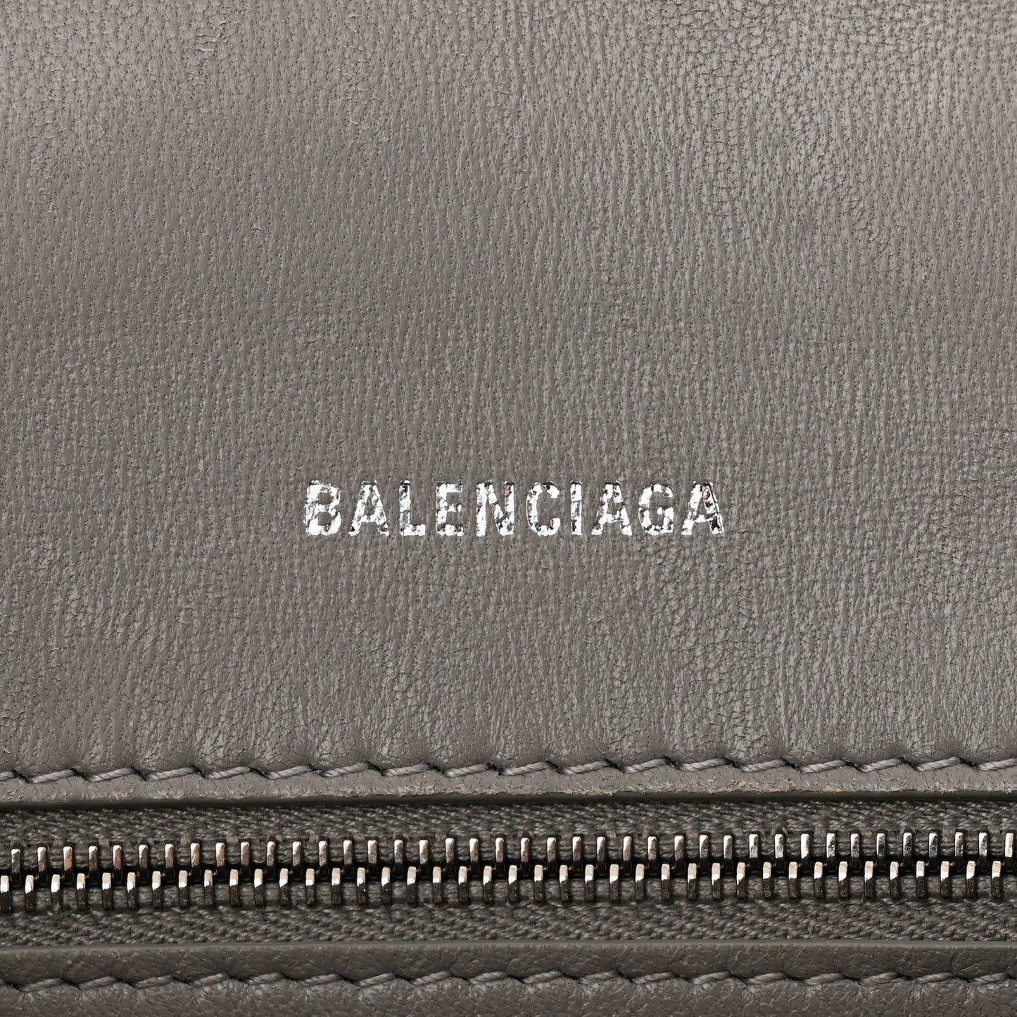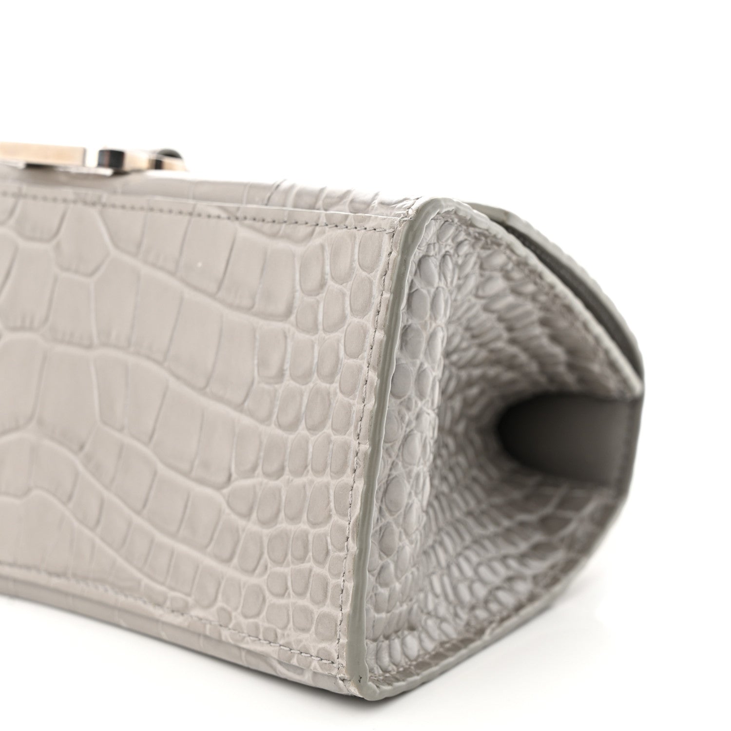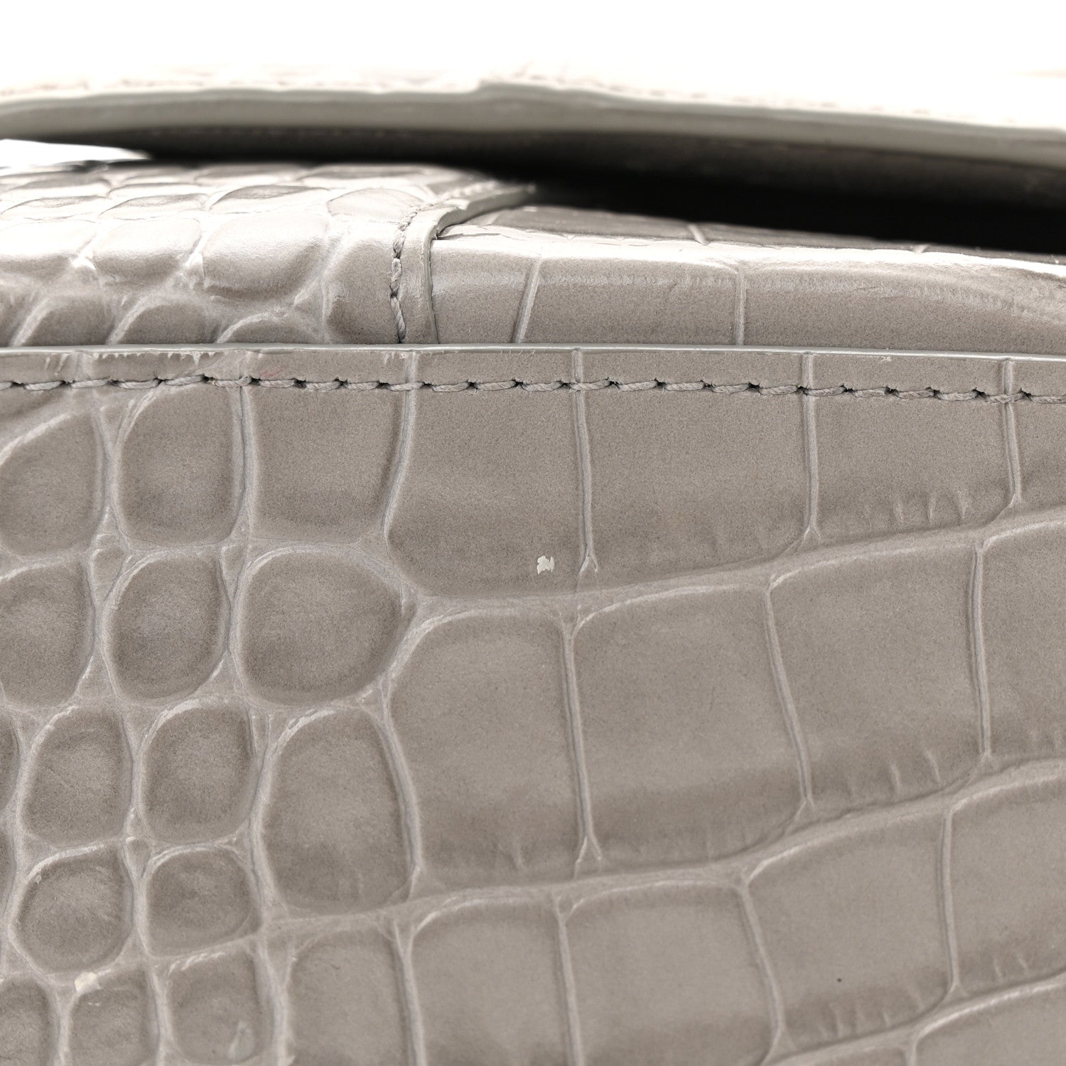 This is an authentic BALENCIAGA Shiny Calfskin Crocodile Embossed Small Hourglass Top Handle Bag in Steel Grey. This stylish petite handbag is beautifully crafted of crocodile stamped glazed calfskin in grey. It features a top handle, an optional shoulder strap and aged silver hardware. The front flap opens to a grey leather interior with a zipper pocket.Follow this item for alerts. Balenciaga is a registered trademark of Balenciaga. FASHIONPHILE is not affiliated with Balenciaga.