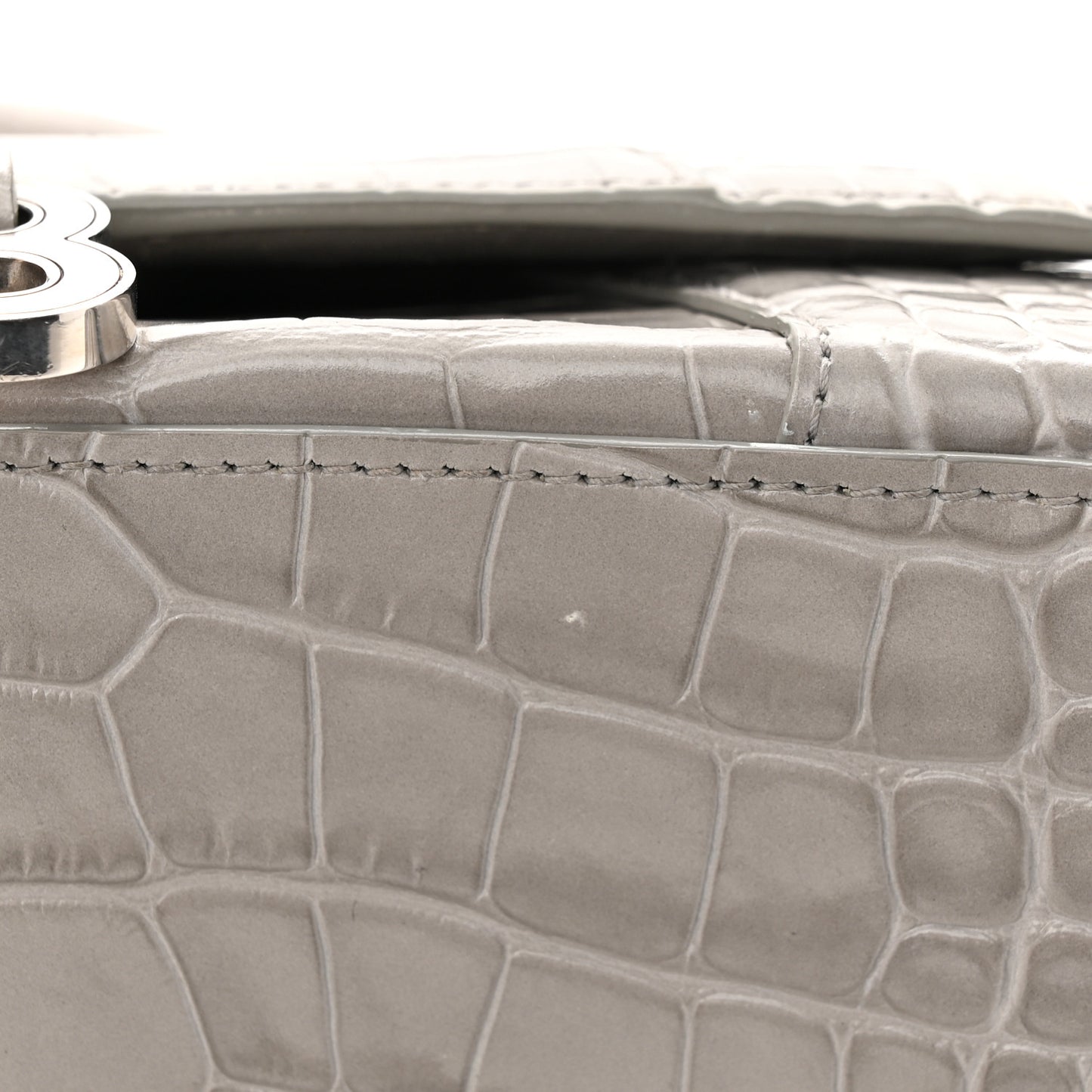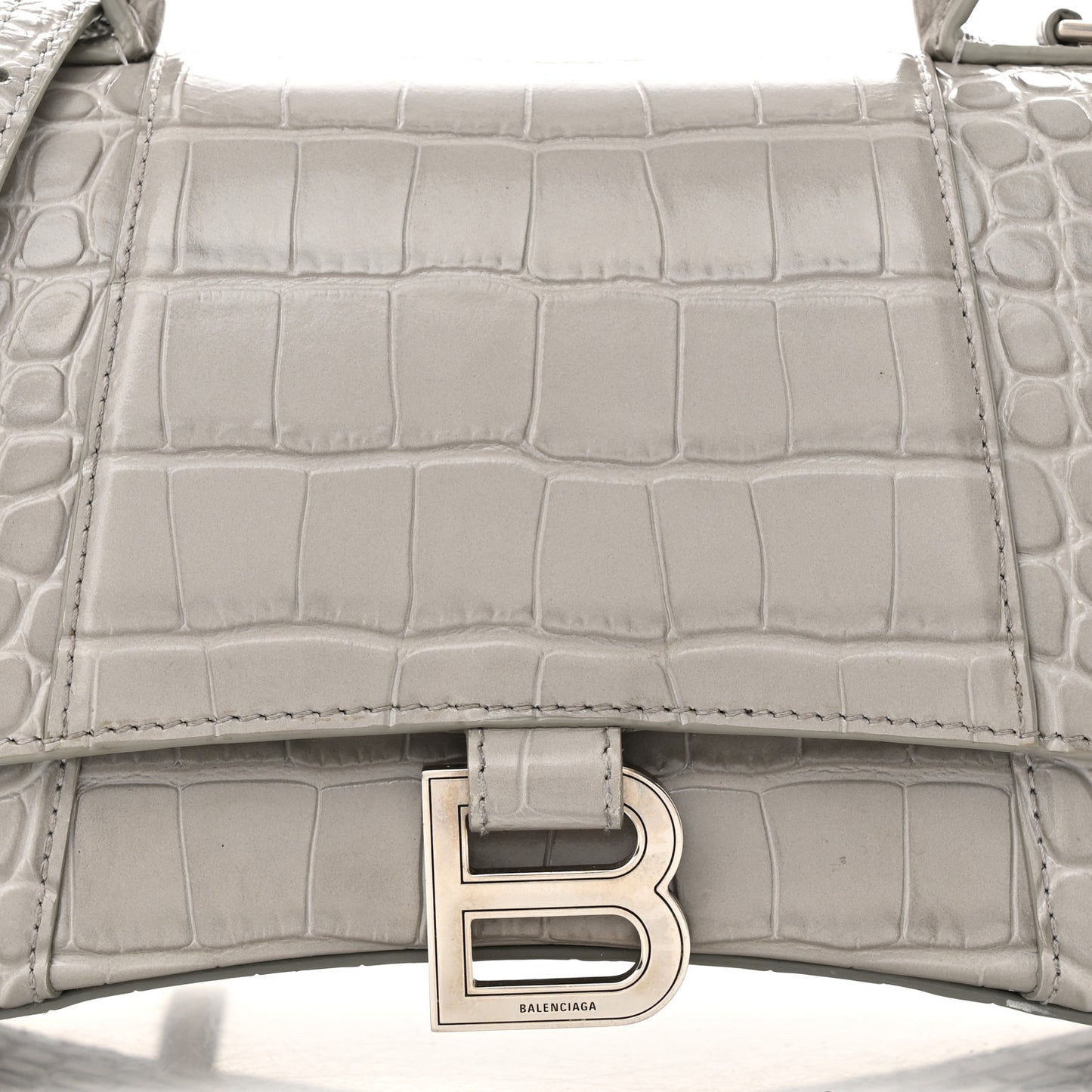 Balenciaga/ Bags/ Shoulder Bags /Balenciaga Shiny Calfskin Crocodile Embossed Small Hourglass Top Handle Bag Steel Grey