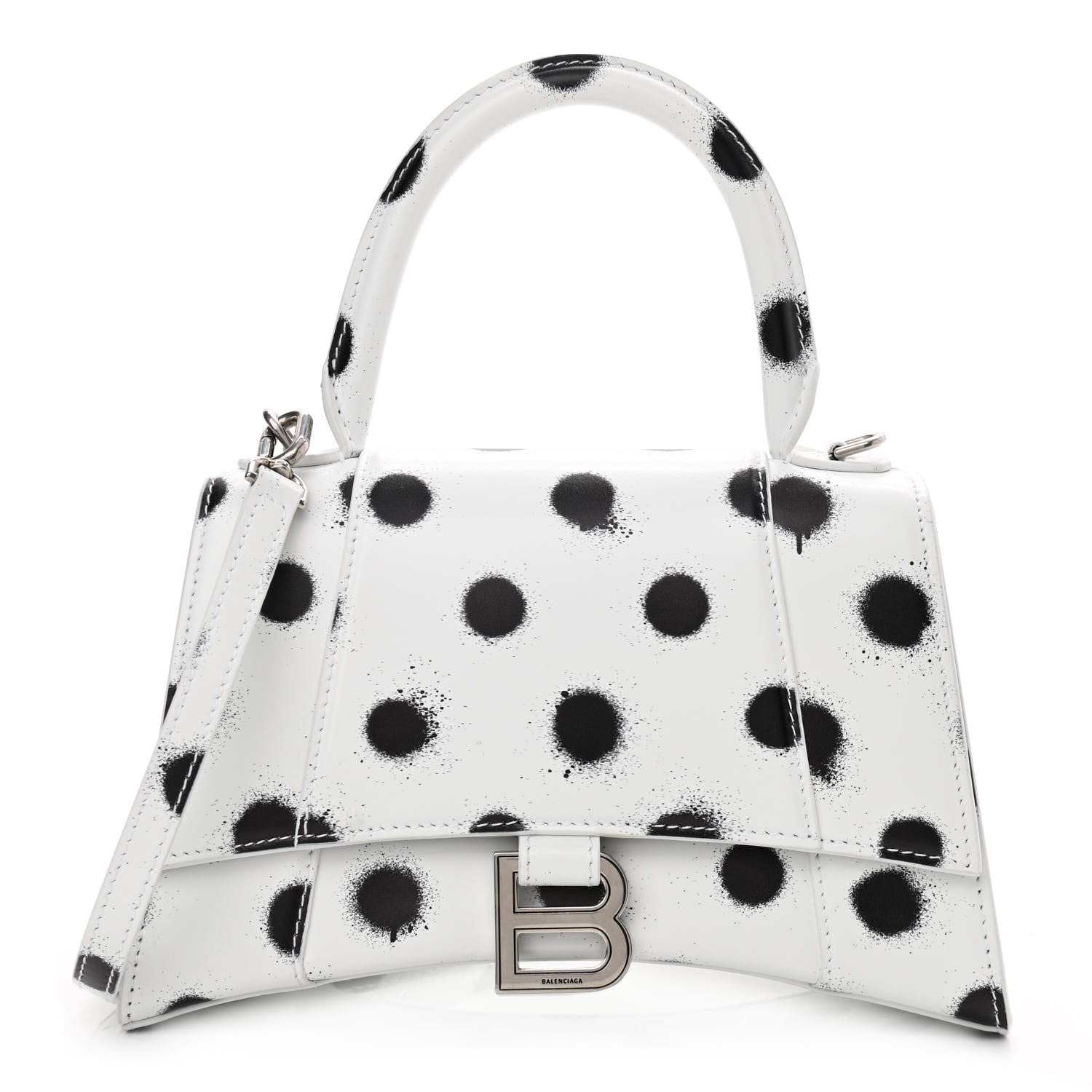 This is an authentic BALENCIAGA Smooth Calfskin Spray Polka Dot Small Hourglass Top Handle Bag in White and Black. This stylish petite handbag is beautifully crafted of smooth calfskin in white with black polka dots. It features a top handle and an optional shoulder strap. This bag also features the signature Balenciaga B charm, silver hardware, and slip pocket at back. The front flap opens to a black leather interior.Follow this item for alerts. Balenciaga is a registered trademark of Balenciaga. FASHIONPHILE is not affiliated with Balenciaga.