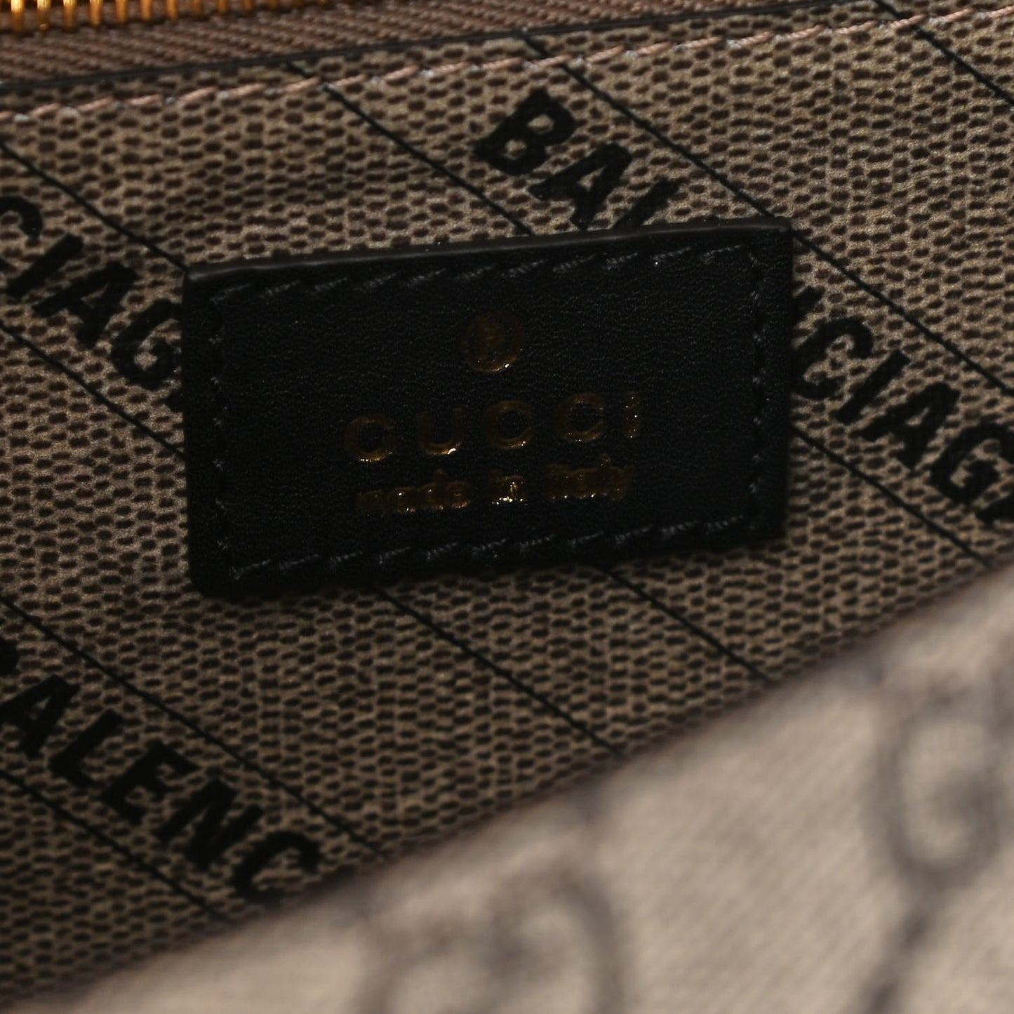 This is an authentic BALENCIAGA X GUCCI GG Supreme Monogram Medium Hourglass Top Handle Bag in Beige and Ebony. This stylish petite handbag is beautifully crafted with the Gucci monogram on coated canvas. It features a top handle and an optional shoulder strap. This bag also features the signature Balenciaga B charm, gold hardware and slip pocket at back. The front flap opens to a beige Balenciaga monogrammed coated canvas interior.Follow this item for alerts. Balenciaga is a registered trademark of Balenciaga. FASHIONPHILE is not affiliated with Balenciaga.