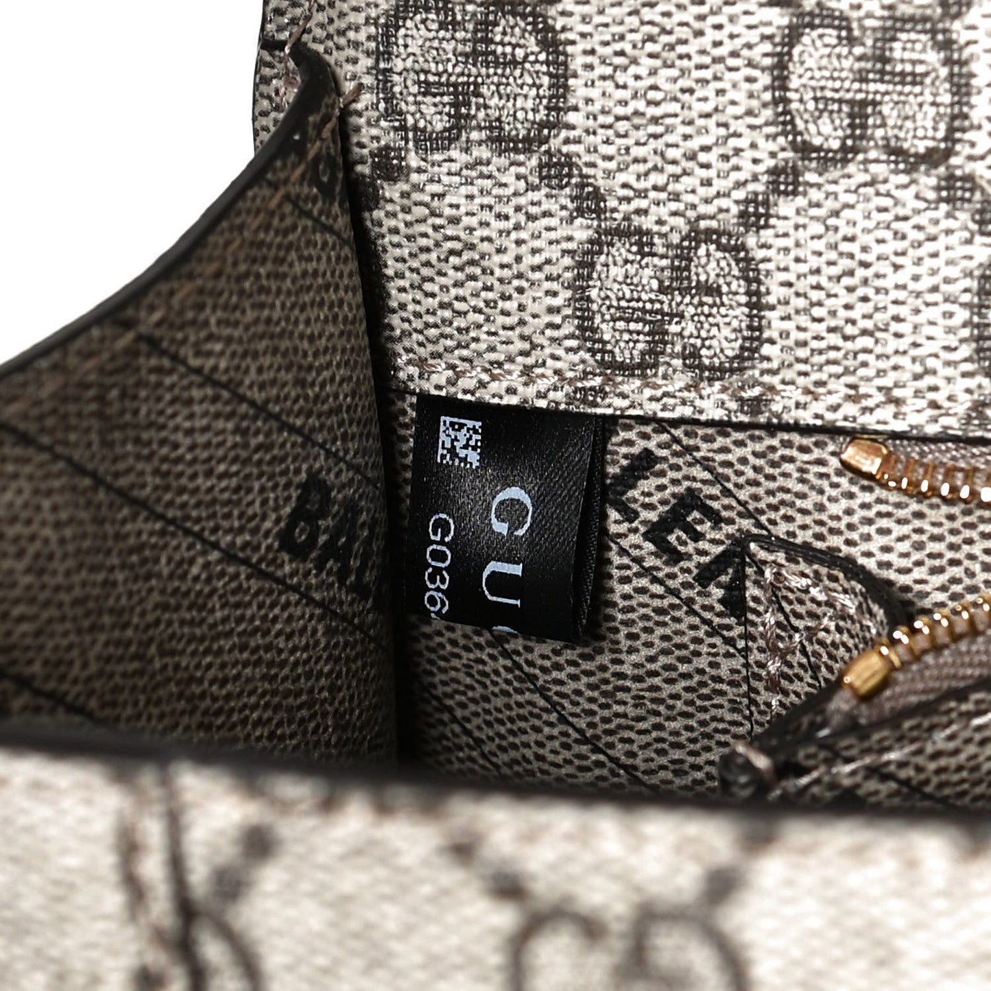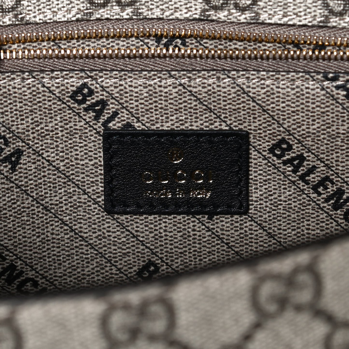 This is an authentic BALENCIAGA X GUCCI GG Supreme Monogram Medium Hourglass Top Handle Bag in Beige and Ebony. This stylish petite handbag is beautifully crafted with the Gucci monogram on coated canvas. It features a top handle and an optional shoulder strap. This bag also features the signature Balenciaga B charm, gold hardware and slip pocket at back. The front flap opens to a beige Balenciaga monogrammed coated canvas interior.Follow this item for alerts. Balenciaga is a registered trademark of Balenciaga. FASHIONPHILE is not affiliated with Balenciaga.