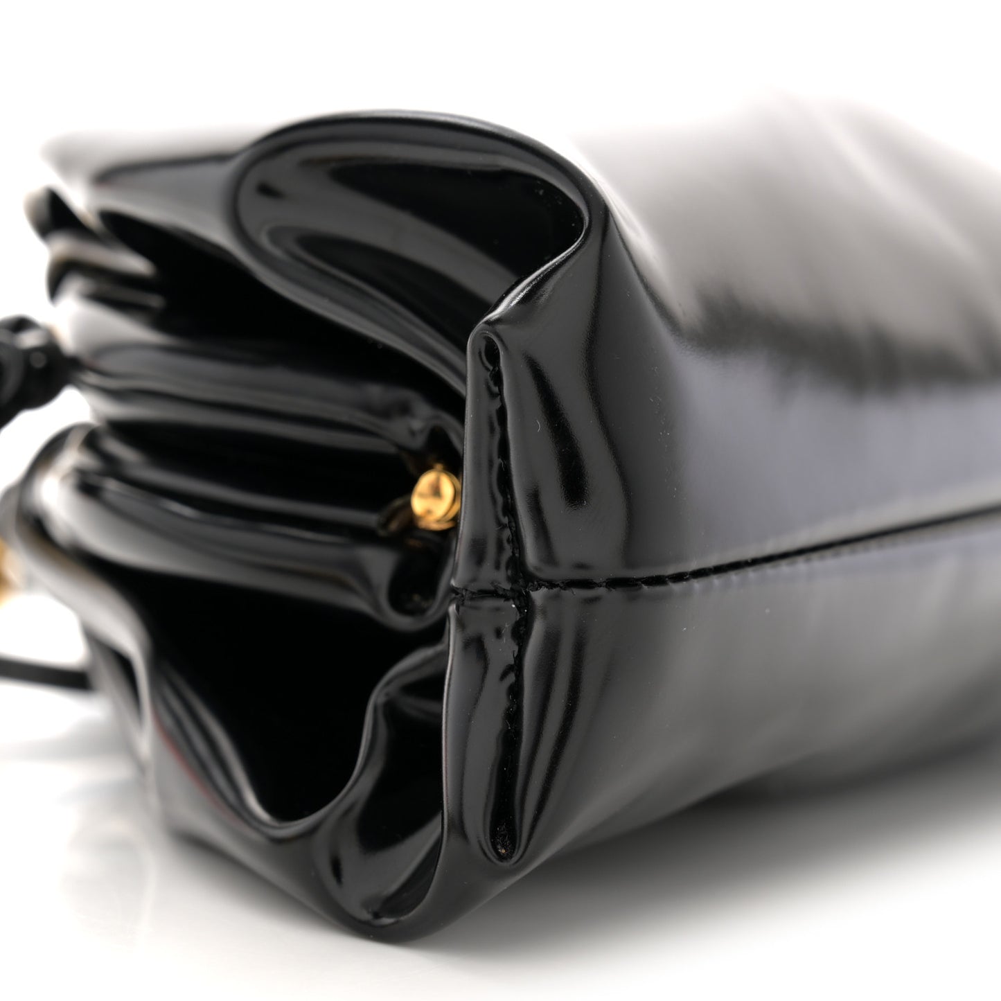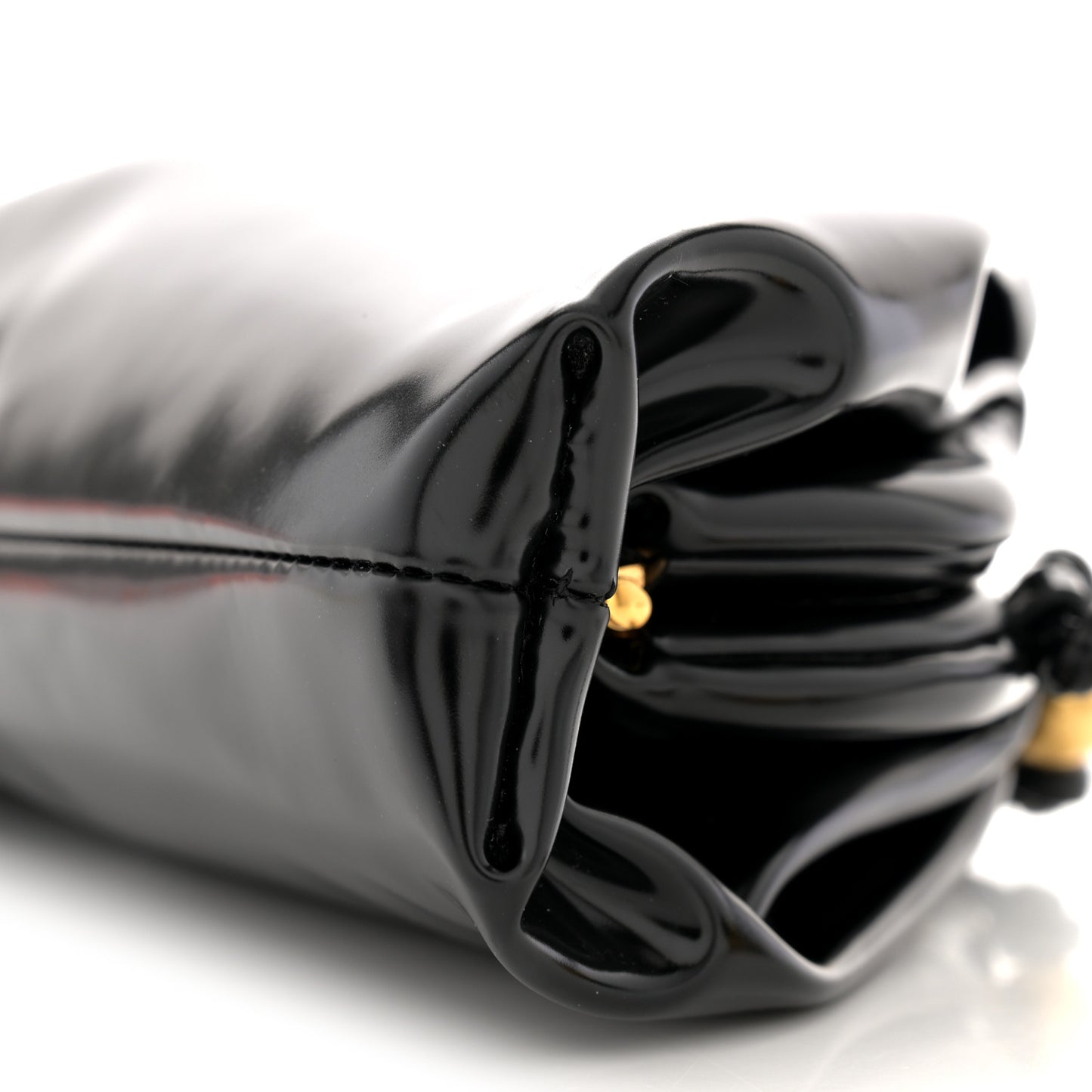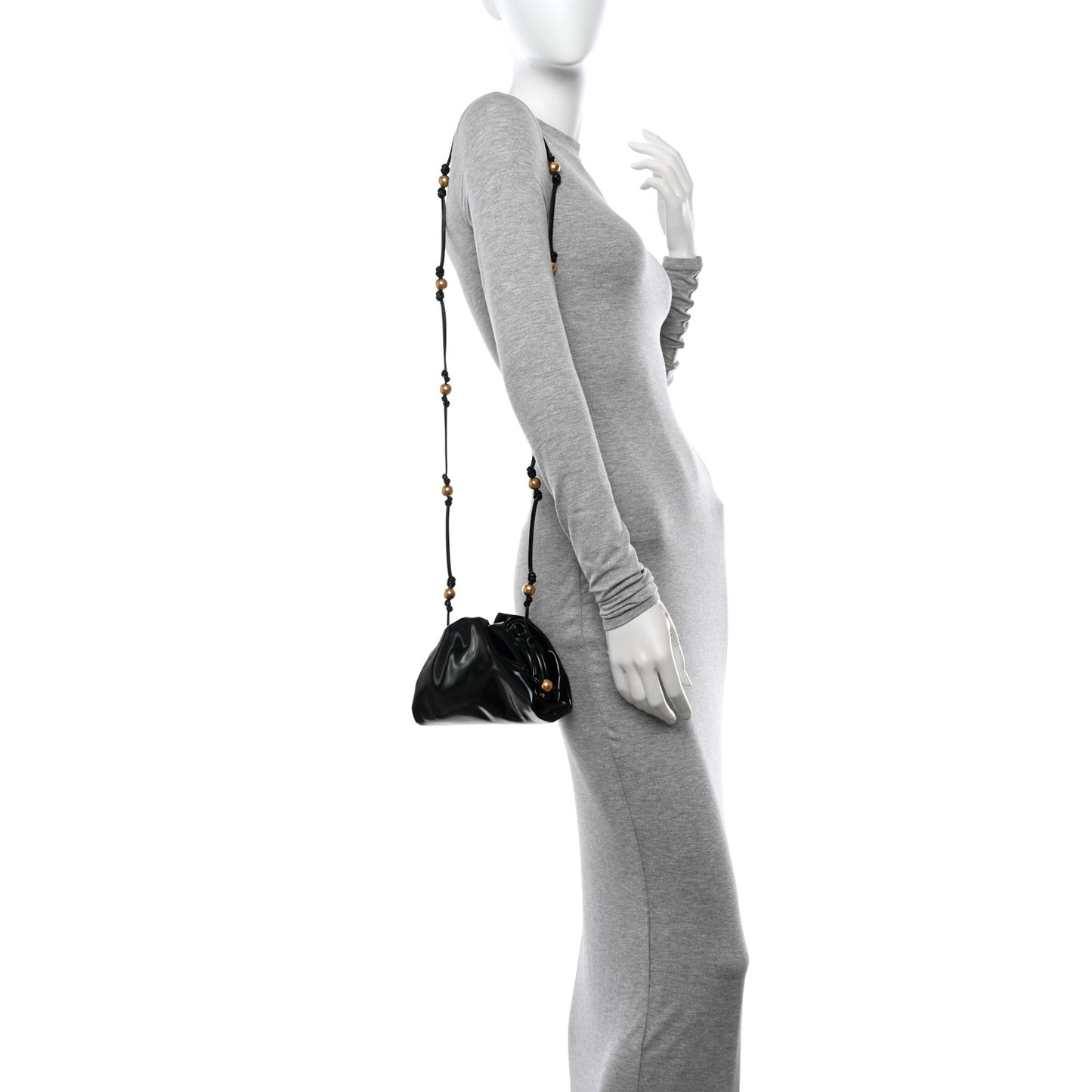 This is an authentic BOTTEGA VENETA Brushed Calfskin The Mini Pouch in Black. This ultra-popular crossbody bag is crafted of brushed calfskin leather in black, and features a ruched leather magnetic frame top that opens to a matching leather interior. A long thin crossbody strap is accented with aged gold beads and signature knotted ends.