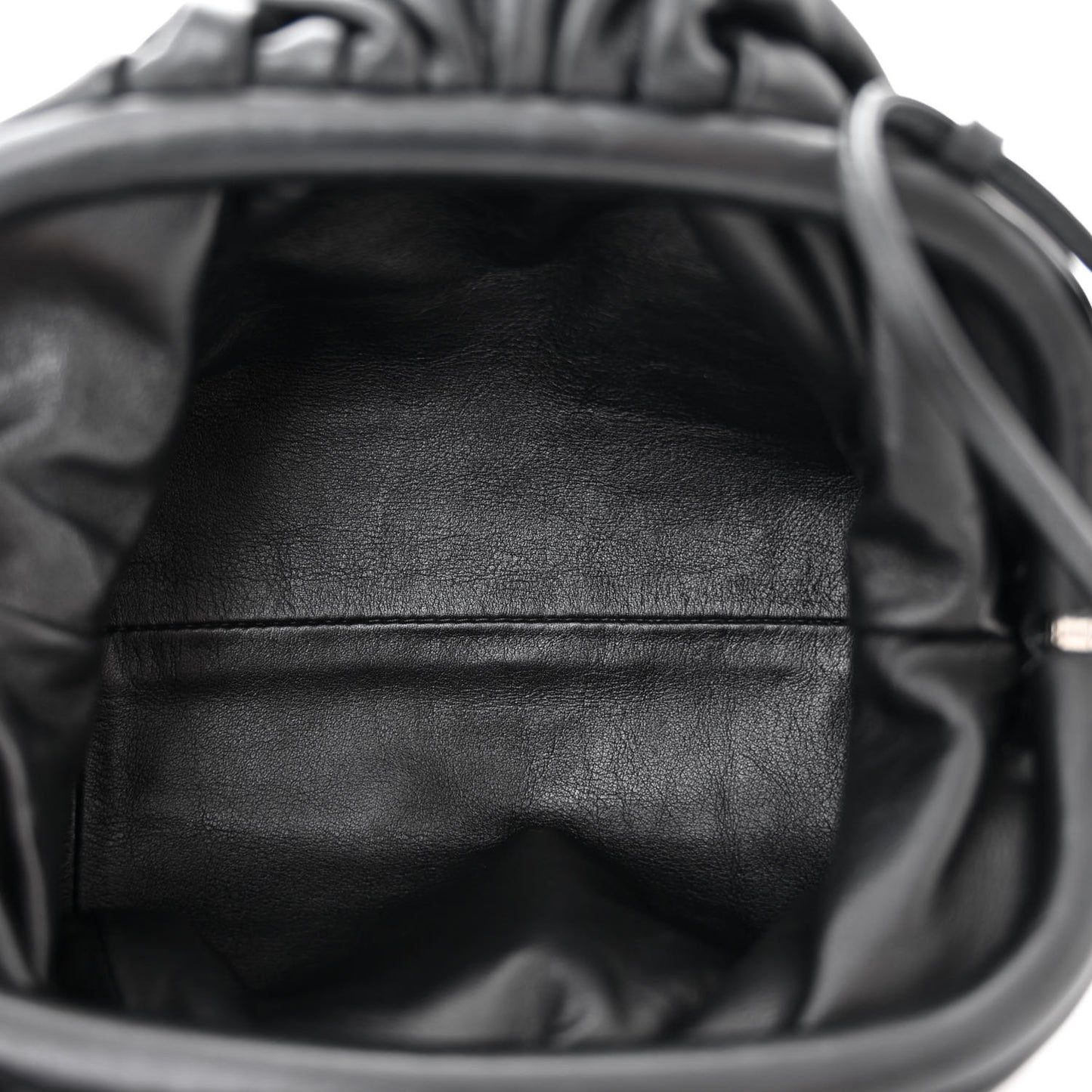 This is an authentic BOTTEGA VENETA Butter Calfskin The Mini Pouch in Black. This ultra-popular crossbody bag is crafted of calfskin leather in black, and features a ruched leather magnetic frame top that opens to a matching leather interior. A long thin crossbody strap is accented with signature knotted ends.Follow this item for alerts. Bottega Veneta is a registered trademark of Bottega Veneta. FASHIONPHILE is not affiliated with Bottega Veneta.