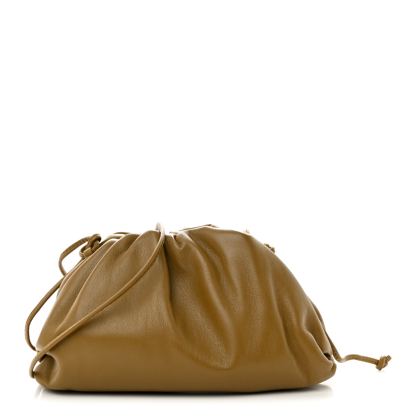 This is an authentic BOTTEGA VENETA Butter Calfskin The Mini Pouch in Moutarde. This ultra-popular clutch is crafted of supple calfskin leather in ochre with a green undertone. The bag features a ruched leather magnetic frame top that opens to a matching leather interior. A long thin crossbody strap is accented with signature knotted ends.