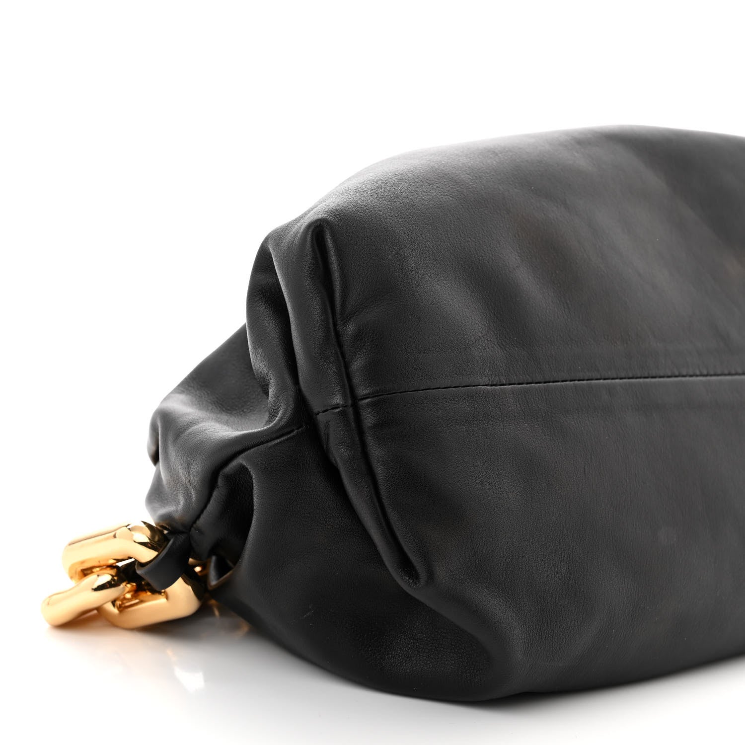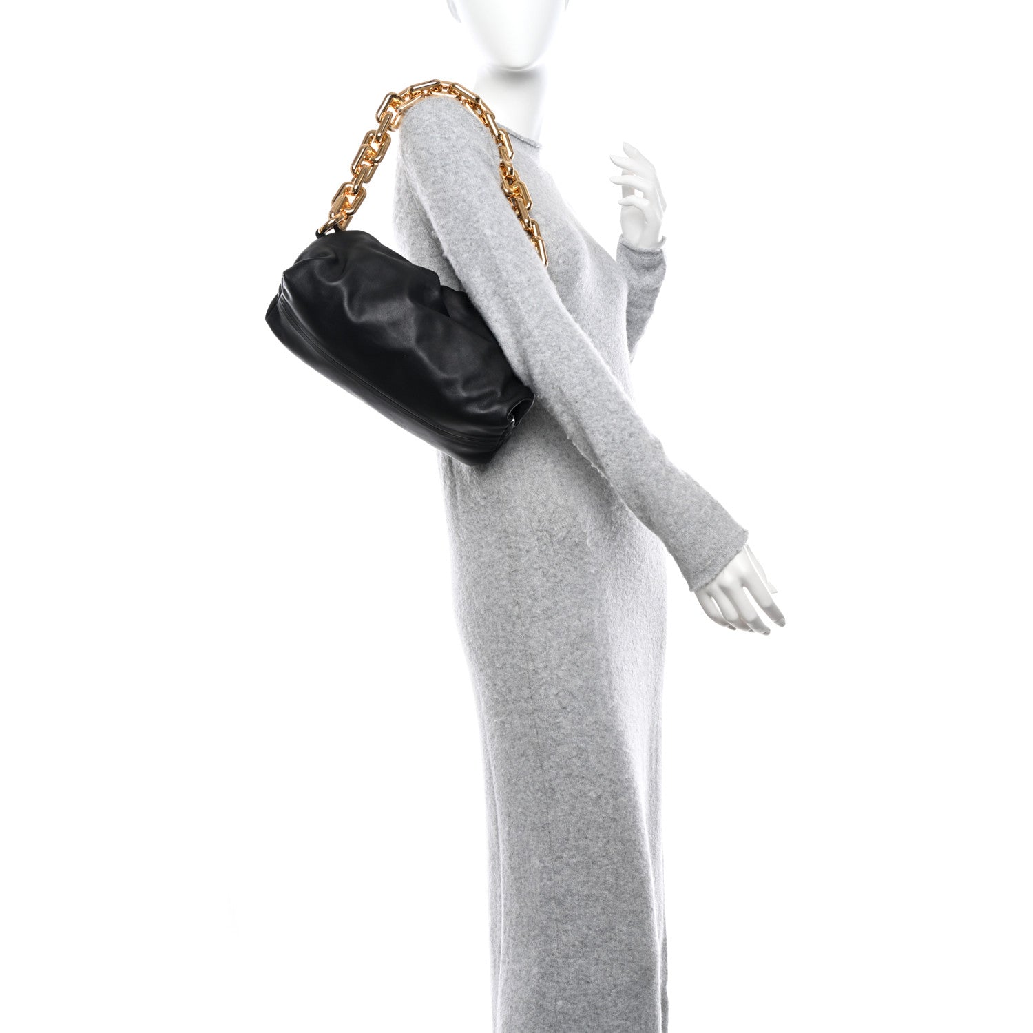This is an authentic BOTTEGA VENETA Calfskin The Pouch Chain in Black. This ultra-popular shoulder bag is crafted of supple calfskin leather in black. The bag features a ruched leather magnetic frame top that opens to a matching leather interior and a thick gold chain strap.Follow this item for alerts. Bottega Veneta is a registered trademark of Bottega Veneta. FASHIONPHILE is not affiliated with Bottega Veneta.