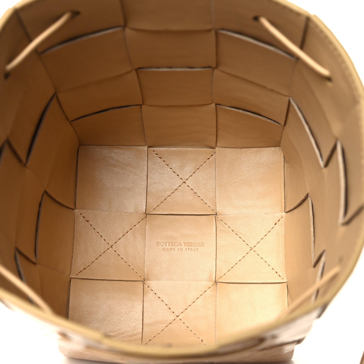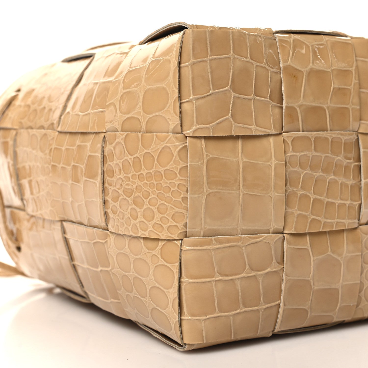 This is an authentic BOTTEGA VENETA Gloss Calfskin Croc Embossed Intreccio Mini Cassette Crossbody Bucket Bag in Praline. This stylish messenger bags crafted of tightly woven intrecciato crocodile patent leather in beige. It features thin leather shoulder straps and an open top that leads to a smooth matching leather interior.Follow this item for alerts. Bottega Veneta is a registered trademark of Bottega Veneta. FASHIONPHILE is not affiliated with Bottega Veneta.