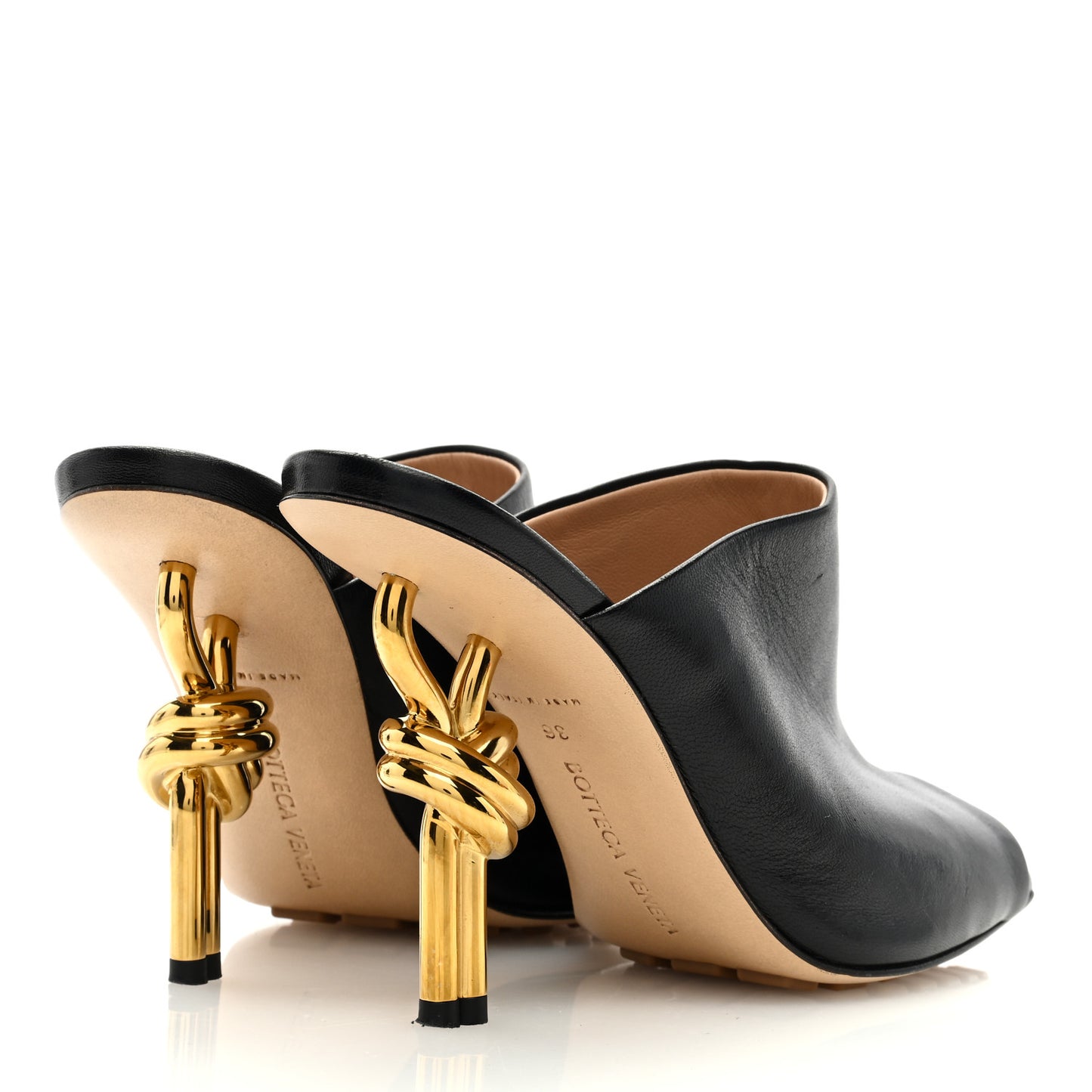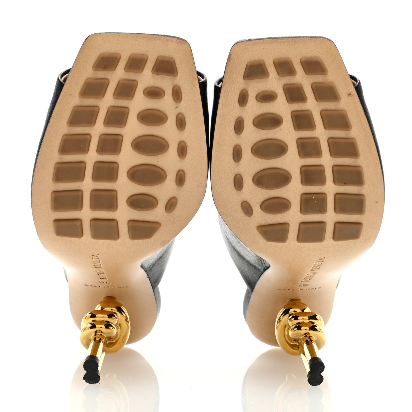 This is an authentic pair of BOTTEGA VENETA Lambskin Stretch Mule Sandals size 36 in Black. These stylish sandals are crafted of smooth lambskin leather in black and feature a squared toe, and a 3.75 inch knot designed heel.Follow this item for alerts. Bottega Veneta is a registered trademark of Bottega Veneta. FASHIONPHILE is not affiliated with Bottega Veneta.