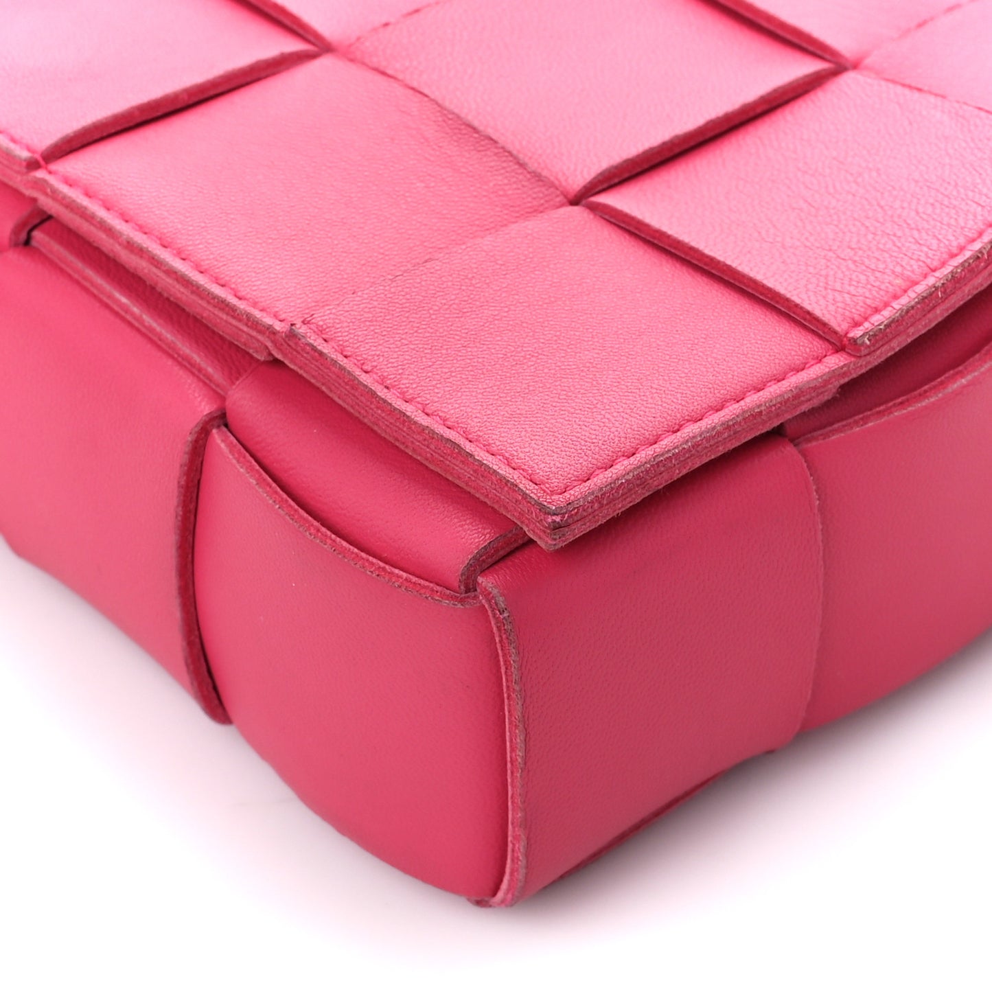 This is an authentic BOTTEGA VENETA Lambskin Maxi Intrecciato Cassette Crossbody Bag in Lollipop. This stylish messenger bag is crafted of tightly woven leather in pink. The bag features a matching adjustable crossbody strap with aged silver hardware and a front flap. The flap opens to a smooth leather interior with a hanging zipper pocket.Follow this item for alerts. Bottega Veneta is a registered trademark of Bottega Veneta. FASHIONPHILE is not affiliated with Bottega Veneta.