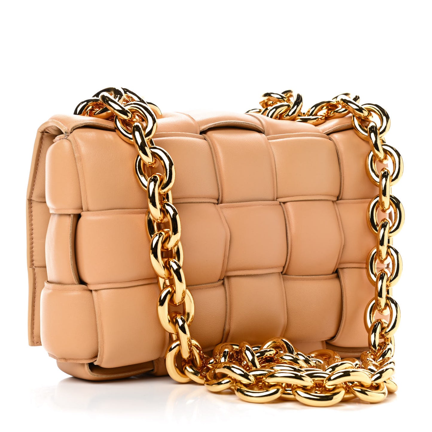 Bottega Veneta/ Bags/ Shoulder Bags /Bottega Veneta Lambskin Maxi Intreccio Padded Chain Cassette Crossbody Bag Almond
