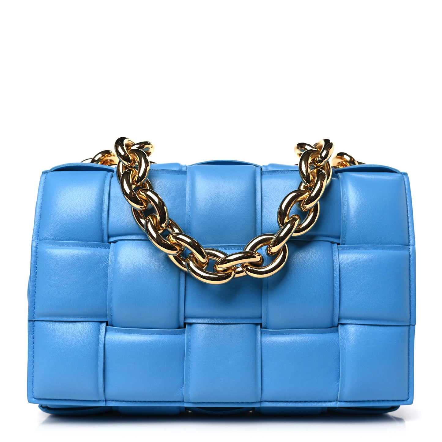 This is an authentic BOTTEGA VENETA Lambskin Maxi Intreccio Padded Chain Cassette Crossbody Bag in Swimming Pool. This stylish shoulder bag is crafted of soft padded and woven calfskin leather in light blue. The bag features a gold chain shoulder strap and a smaller chain handle. It opens to a matching leather interior with a zipper pocket.Follow this item for alerts. Bottega Veneta is a registered trademark of Bottega Veneta. FASHIONPHILE is not affiliated with Bottega Veneta.