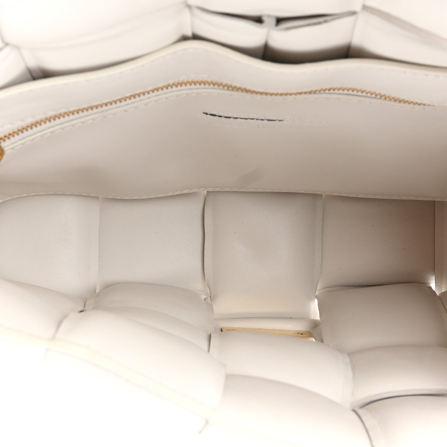 This is an authentic BOTTEGA VENETA Lambskin Maxi Intreccio Padded Chain Cassette Crossbody Bag in White. This stylish shoulder bag is crafted of soft padded and woven calfskin leather in white. The bag features a gold chain shoulder strap and a shorter chain handle. It opens to a matching leather interior with a zipper pocket.Follow this item for alerts. Bottega Veneta is a registered trademark of Bottega Veneta. FASHIONPHILE is not affiliated with Bottega Veneta.