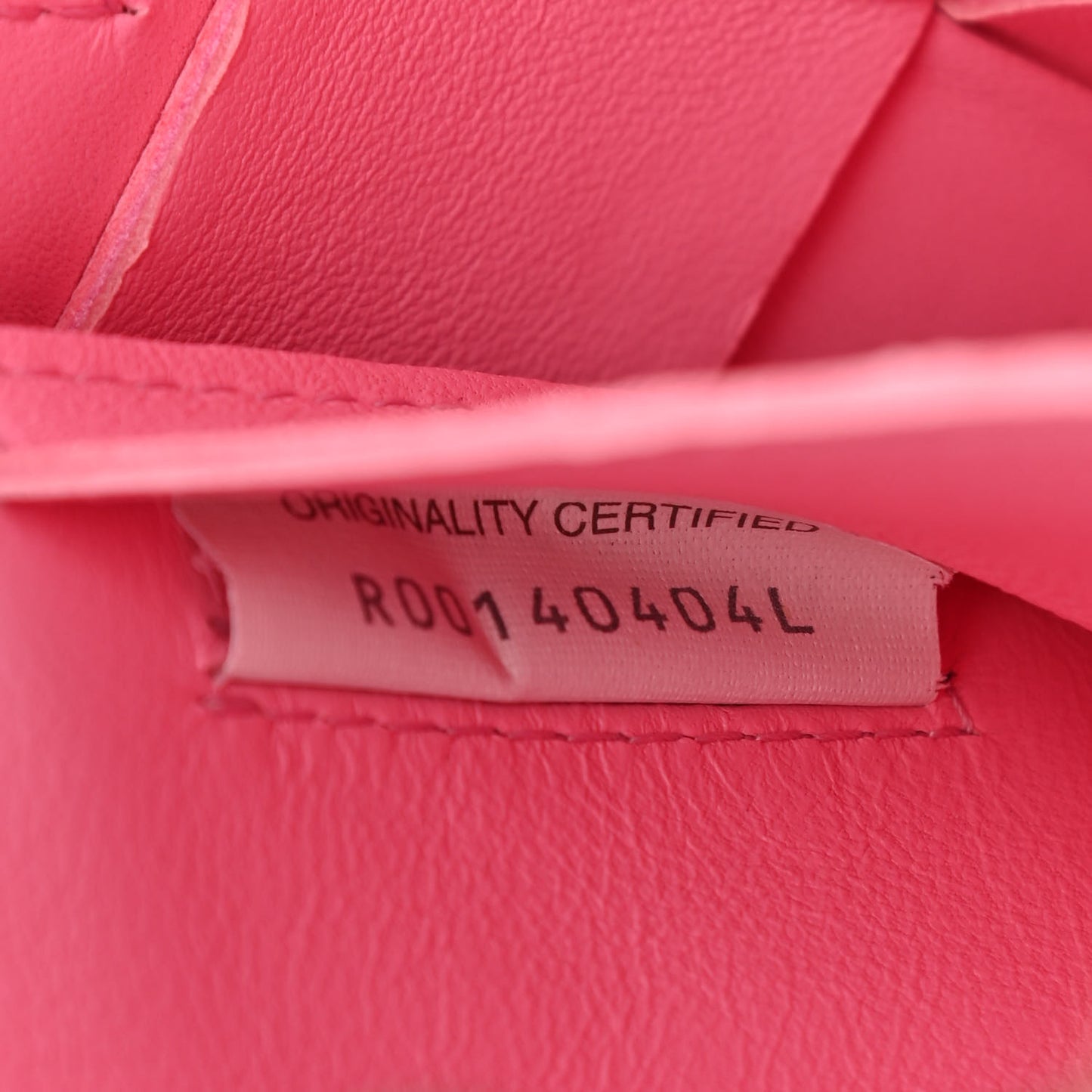 This is an authentic BOTTEGA VENETA Maxi Intrecciato Small Cassette Crossbody Bag in Ribbon. This stylish messenger bag is crafted of tightly woven lambskin leather in pink. The bag features a matching adjustable crossbody strap with gold hardware and a front flap. The flap opens to a smooth leather interior with a flat pocket.