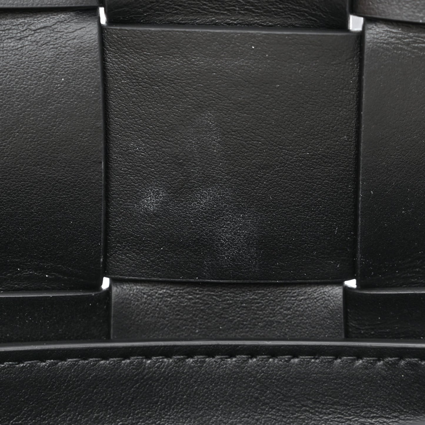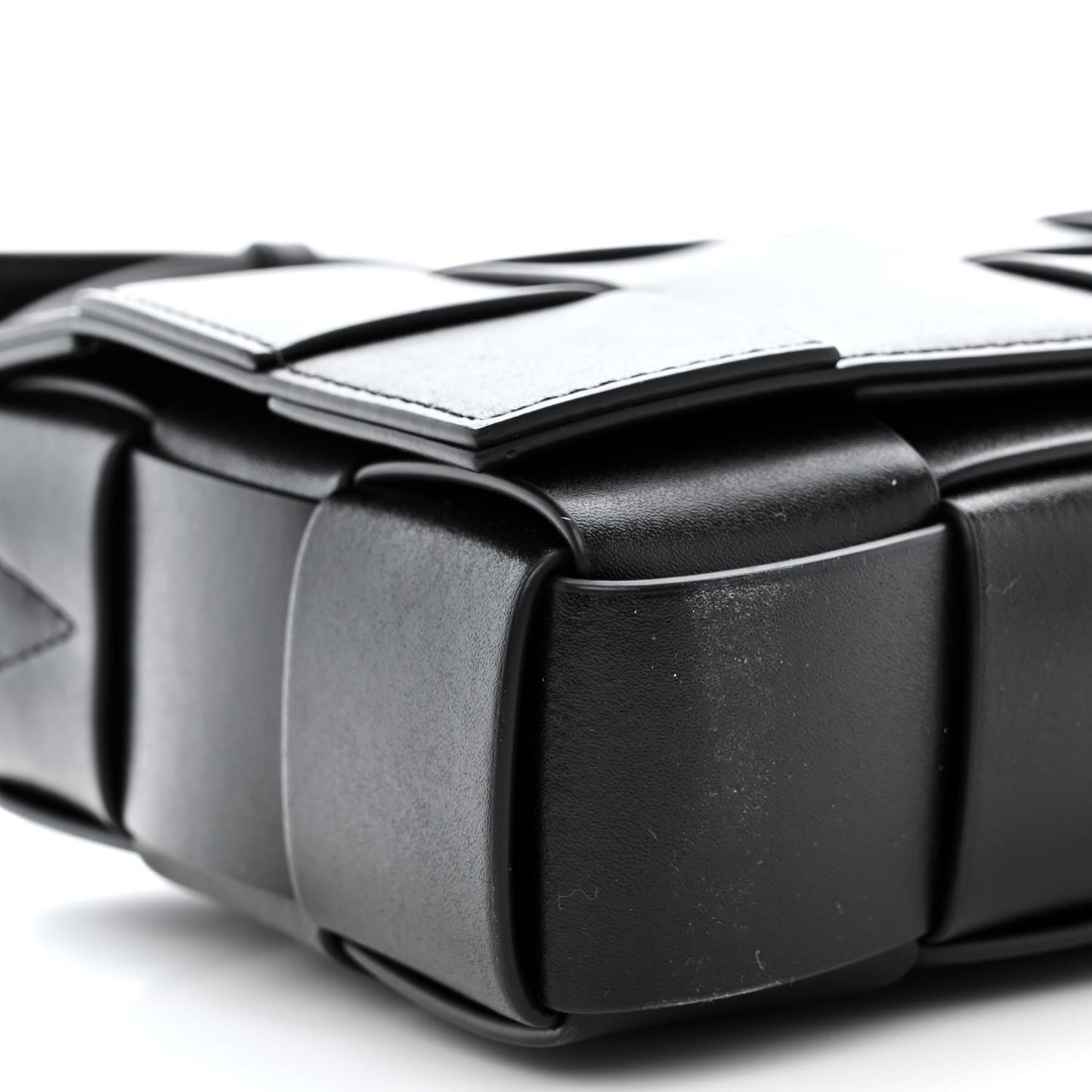 This is an authentic BOTTEGA VENETA Lambskin Maxi Intreccio Small Cassette Crossbody Bag in Black. This stylish messenger bags crafted of woven bonded leather in black. The bag features an adjustable crossbody strap with matte black hardware and a front flap. The flap opens to a leather interior with a zipper pocket.Follow this item for alerts. Bottega Veneta is a registered trademark of Bottega Veneta. FASHIONPHILE is not affiliated with Bottega Veneta.