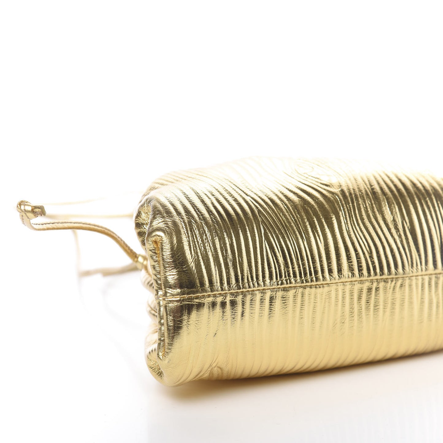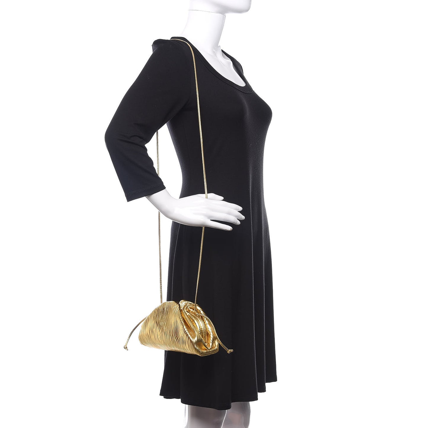 This is an authentic BOTTEGA VENETA Metalic Bark Calfskin The Mini Pouch in Gold. This ultra popular crossbody is crafted of supple calfskin leather in metallic gold. The bag features a ruched leather magnetic frame top that opens to a black leather interior. A long thin crossbody strap is accented with signature knotted ends. Enjoy the chic sophistication of Bottega Veneta with this beautiful clutch!Follow this item for alerts. Bottega Veneta is a registered trademark of Bottega Veneta. FASHIONPHILE is not affiliated with Bottega Veneta.