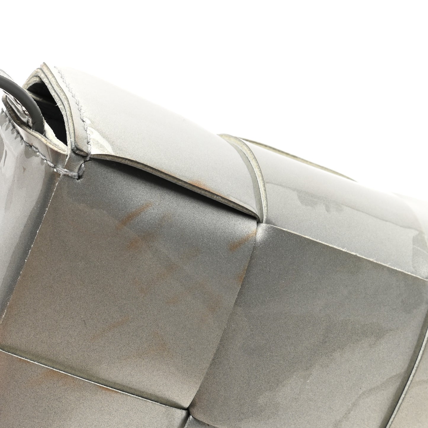 This is an authentic BOTTEGA VENETA Metallic Patent Calfskin Maxi Intrecciato Extra Mini Cassette Crossbody Bag in Silver. This stylish messenger bag is crafted of metallic patent calfskin leather in silver. The bag features a matching adjustable crossbody strap with silver hardware and a front flap that opens to a matching interior with card slots.Follow this item for alerts. Bottega Veneta is a registered trademark of Bottega Veneta. FASHIONPHILE is not affiliated with Bottega Veneta.