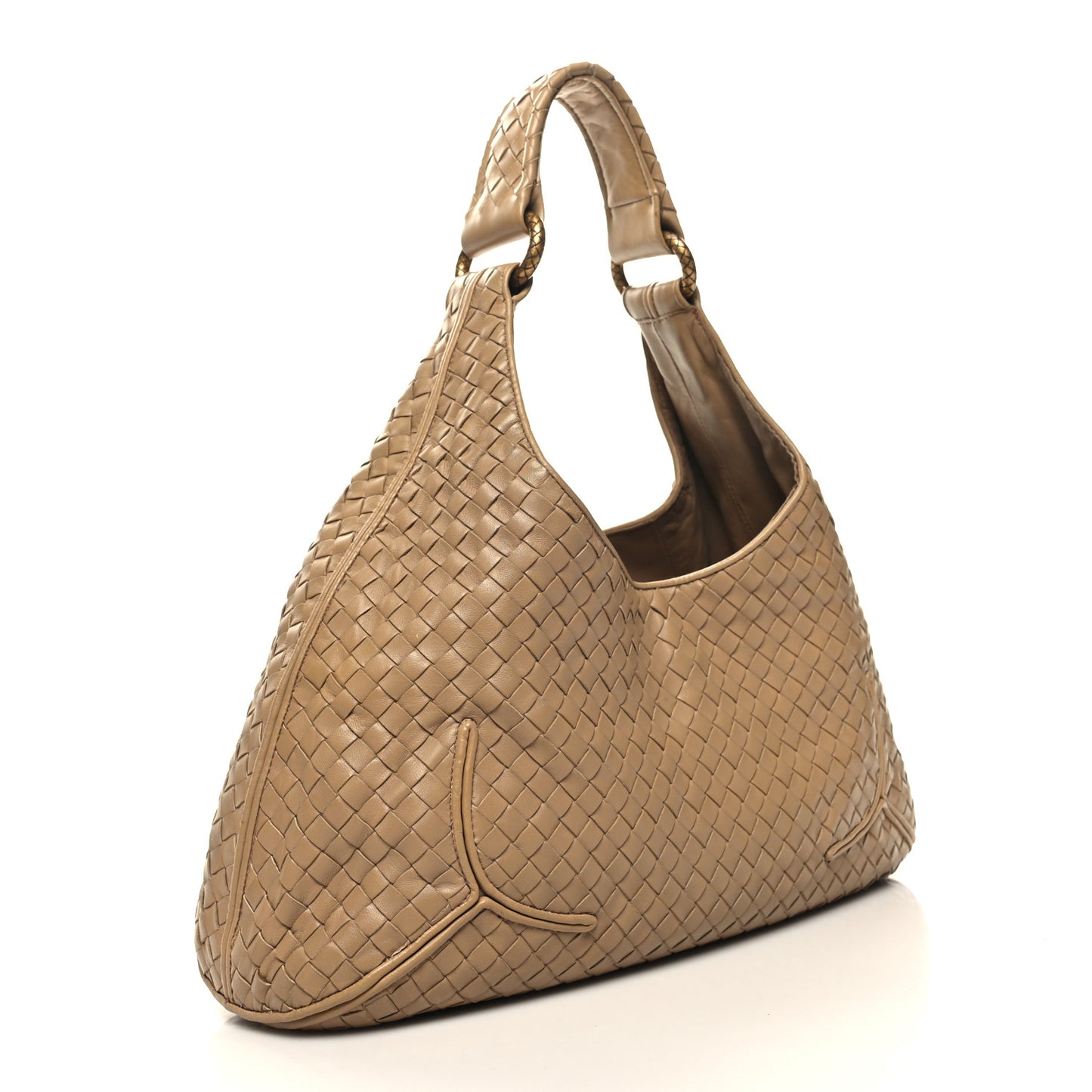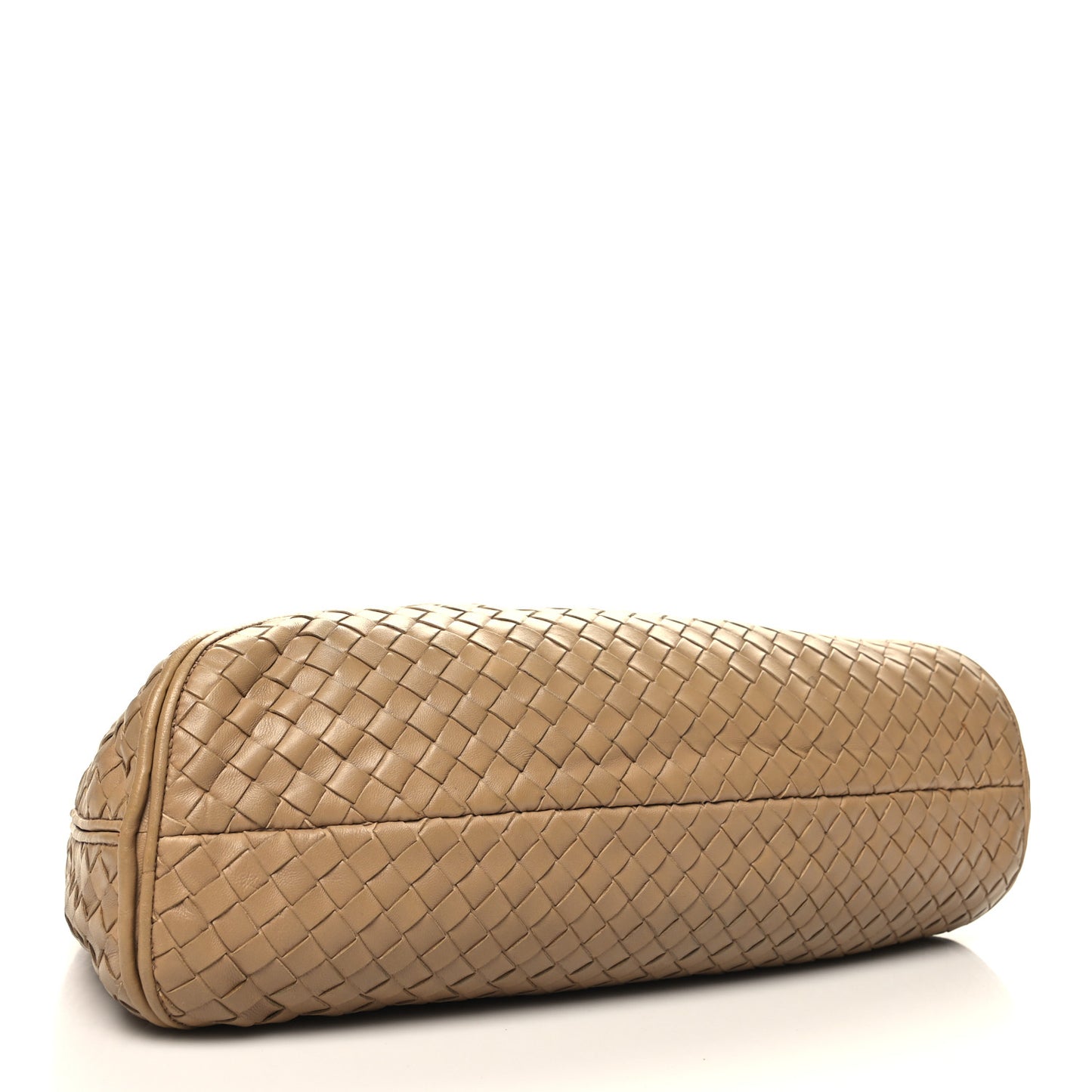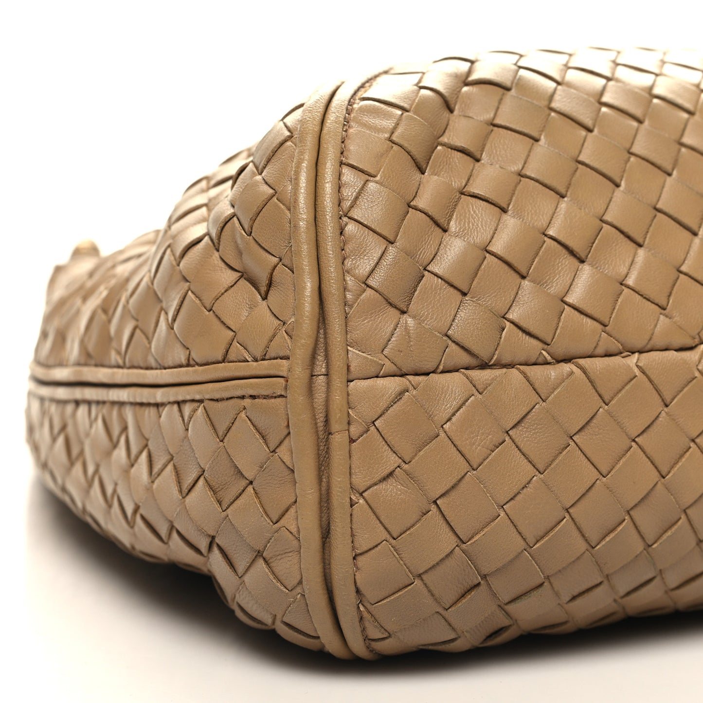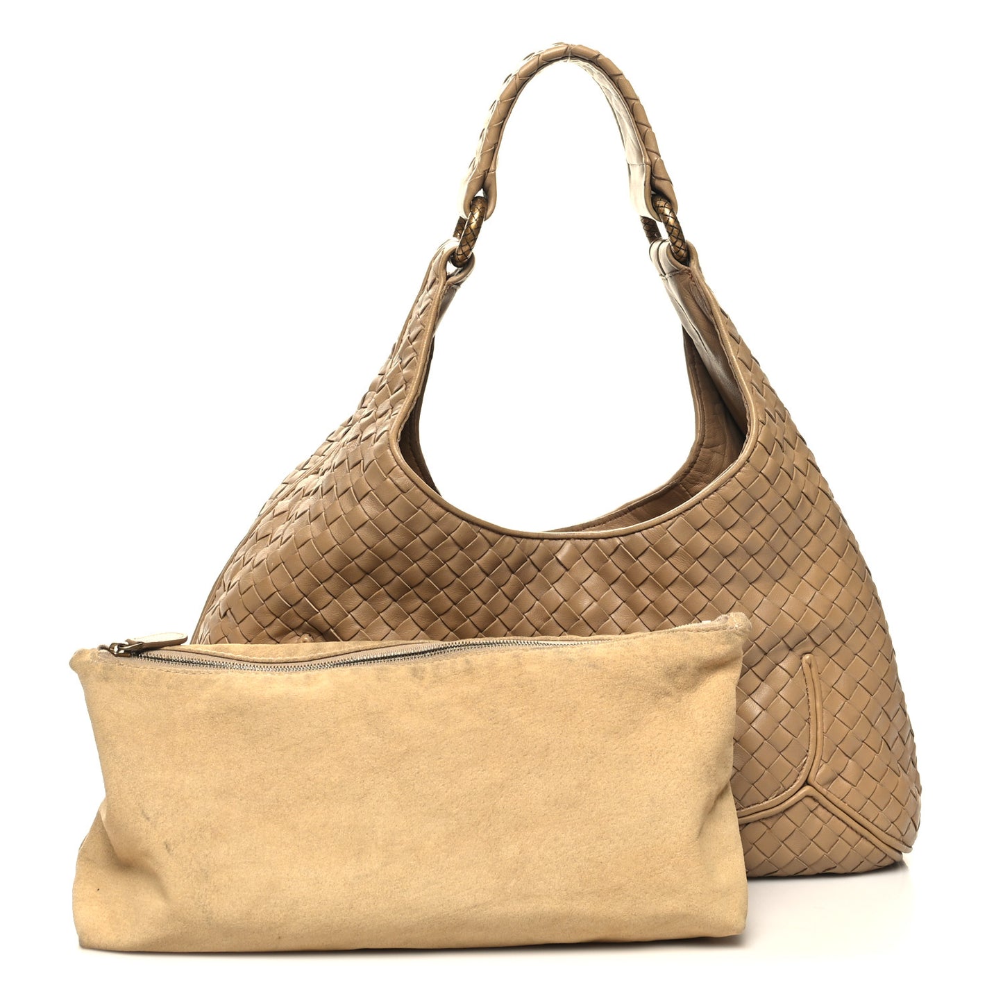 This is an authentic BOTTEGA VENETA Nappa Intrecciato Ball Hobo in Brown. This stylish hobo is crafted of signature intrecciato tightly woven leather in dark beige. The bag features a woven looping leather shoulder strap with smooth leather decorative piping trim throughout. The top opens to a taupe suede interior with a main zipper compartment and four unique side pockets.Follow this item for alerts. Bottega Veneta is a registered trademark of Bottega Veneta. FASHIONPHILE is not affiliated with Bottega Veneta.