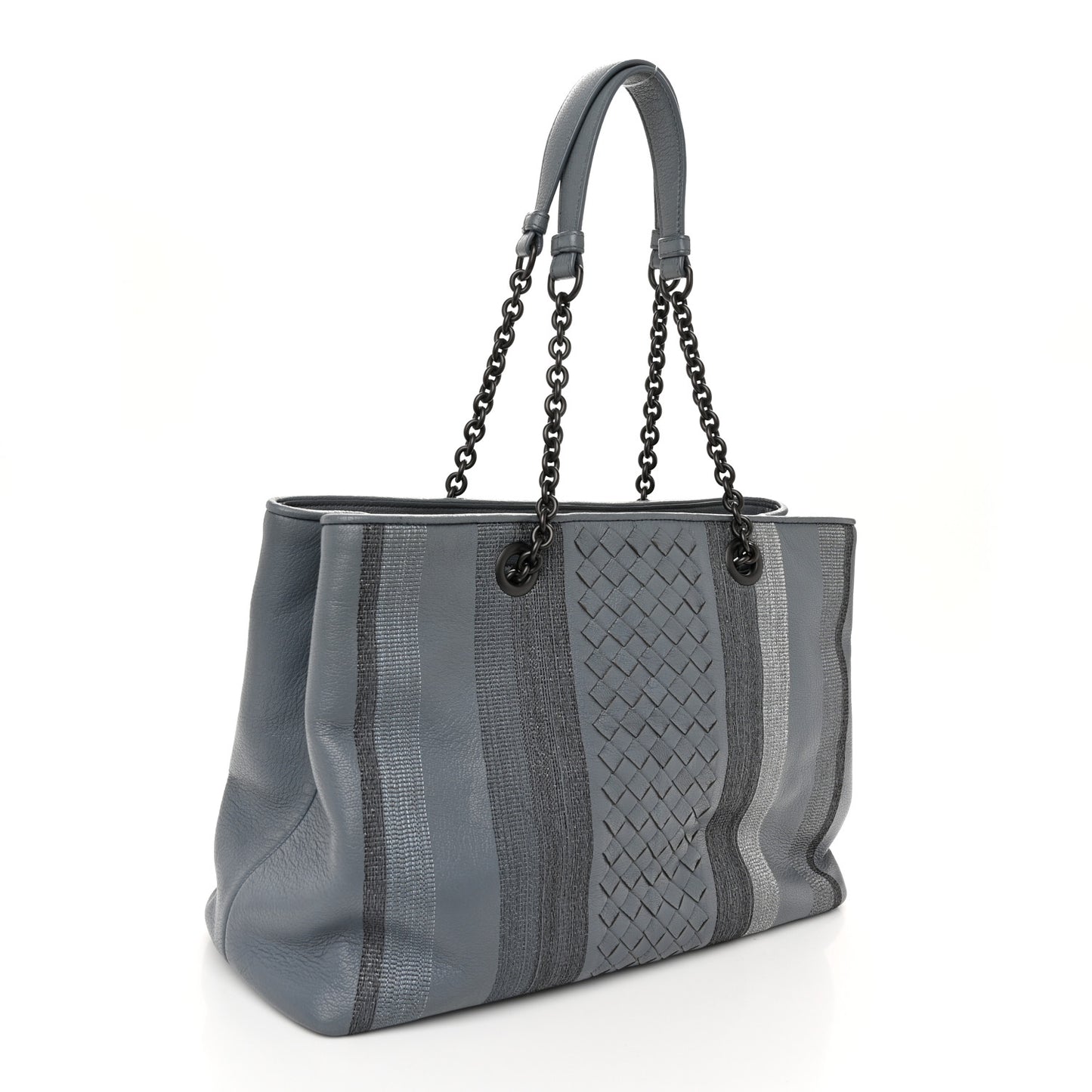 This is an authentic BOTTEGA VENETA Nappa Intrecciato Medium Tote in Blue. This stylish shoulder bag is beautifully crafted of intrecciato lambskin leather tightly woven. The tote features leather shoulder straps with aged brass chains. The top is a taupe suede interior with a center zipper pocket and two large compartments.Follow this item for alerts. Bottega Veneta is a registered trademark of Bottega Veneta. FASHIONPHILE is not affiliated with Bottega Veneta.