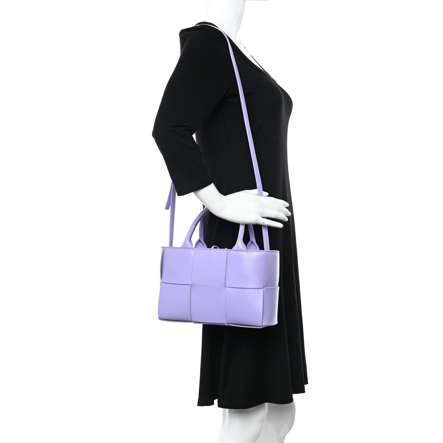 This is an authentic BOTTEGA VENETA Nappa Intrecciato Mini Arco Tote in Wisteria. This exceptional handbag is crafted of lambskin leather in light purple with a maxi weave effect and features leather top handles, and an optional crossbody strap. The bag has an open top with a matching leather interior and a removable pouch.Follow this item for alerts. Bottega Veneta is a registered trademark of Bottega Veneta. FASHIONPHILE is not affiliated with Bottega Veneta.
