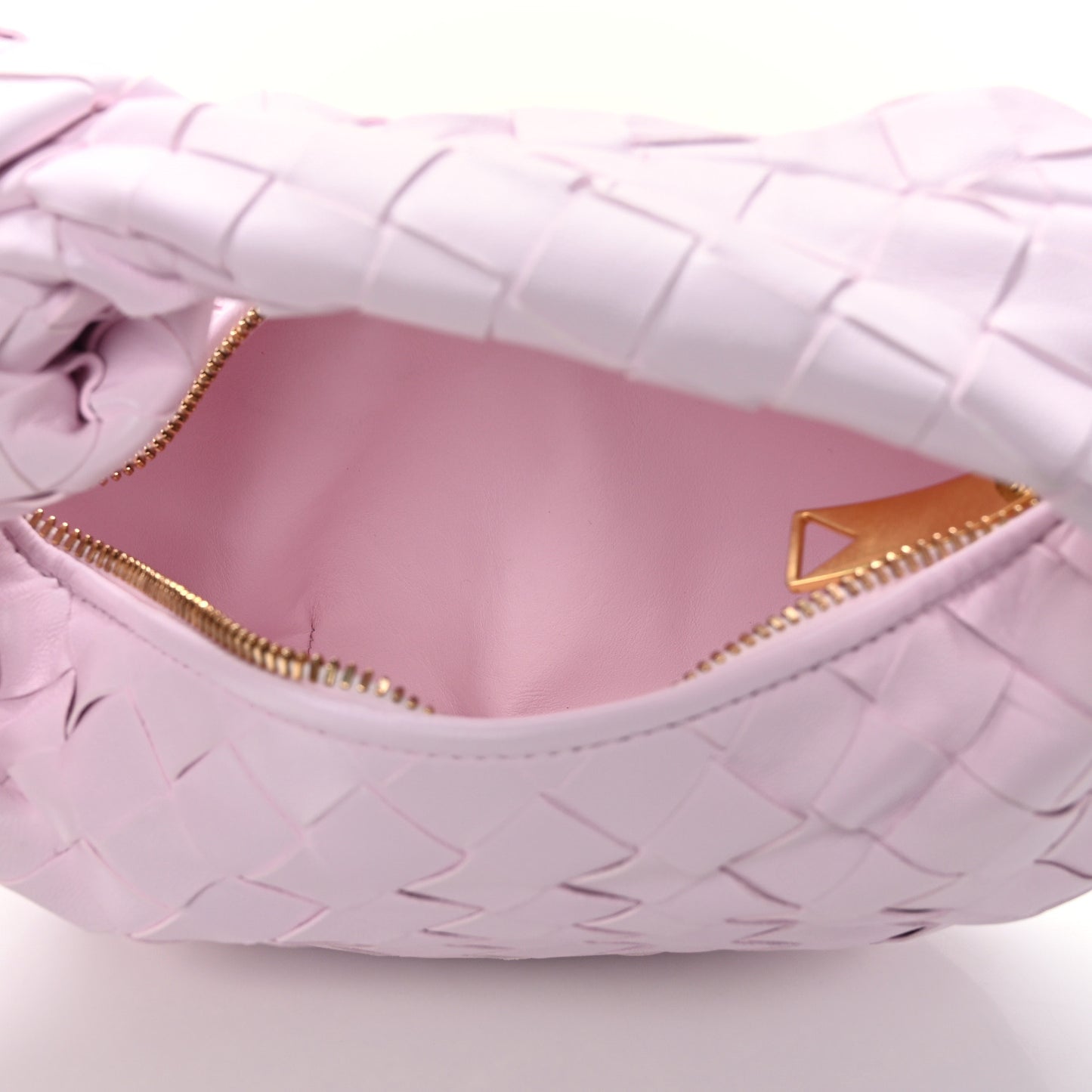 This is an authentic BOTTEGA VENETA Nappa Intrecciato Mini Jodie in Bliss Washed. This stylish shoulder bag is beautifully crafted of soft woven lambskin leather in light pink. The bag features a matching handle and a gold top zipper that opens to a compact light pink leather interior.Follow this item for alerts. Bottega Veneta is a registered trademark of Bottega Veneta. FASHIONPHILE is not affiliated with Bottega Veneta.