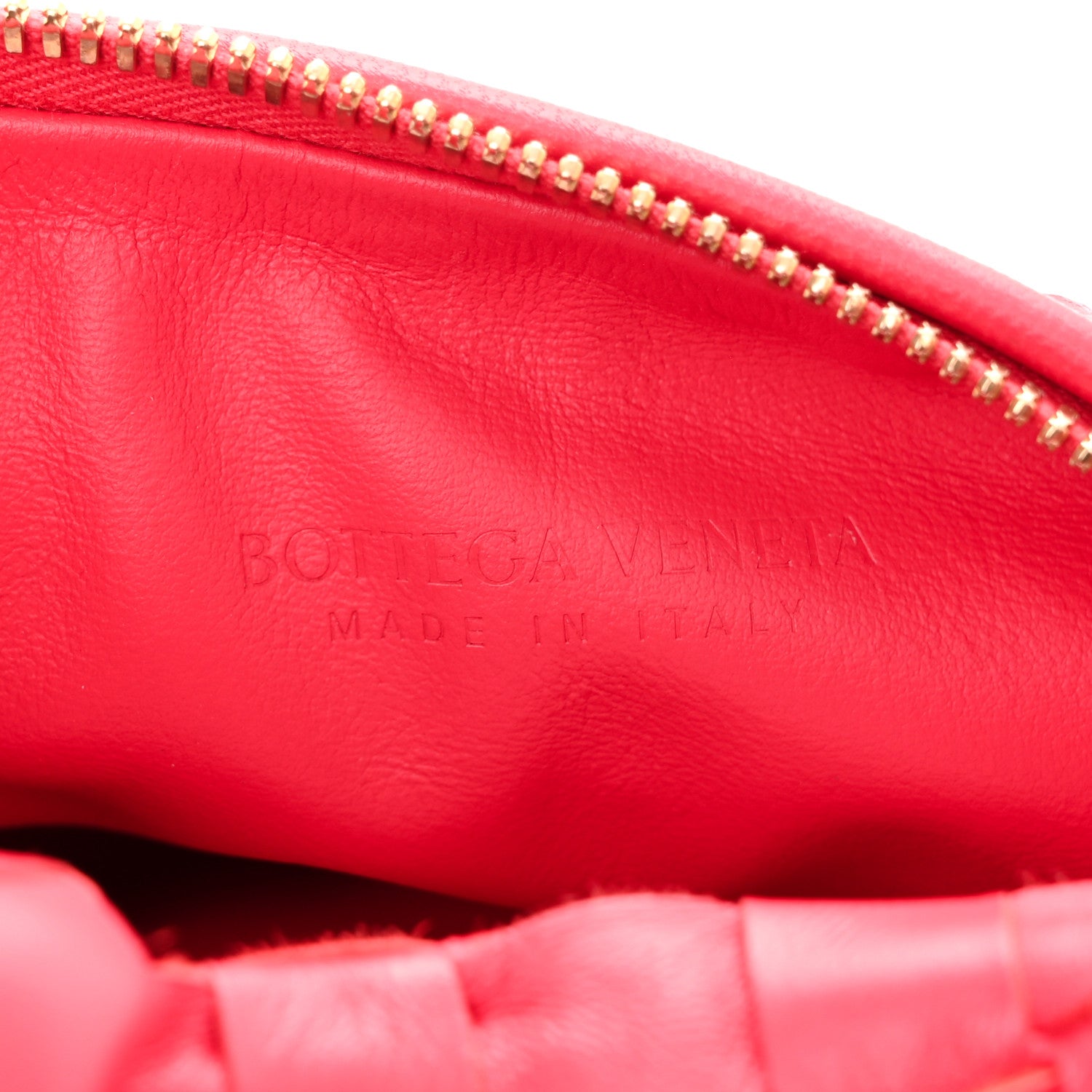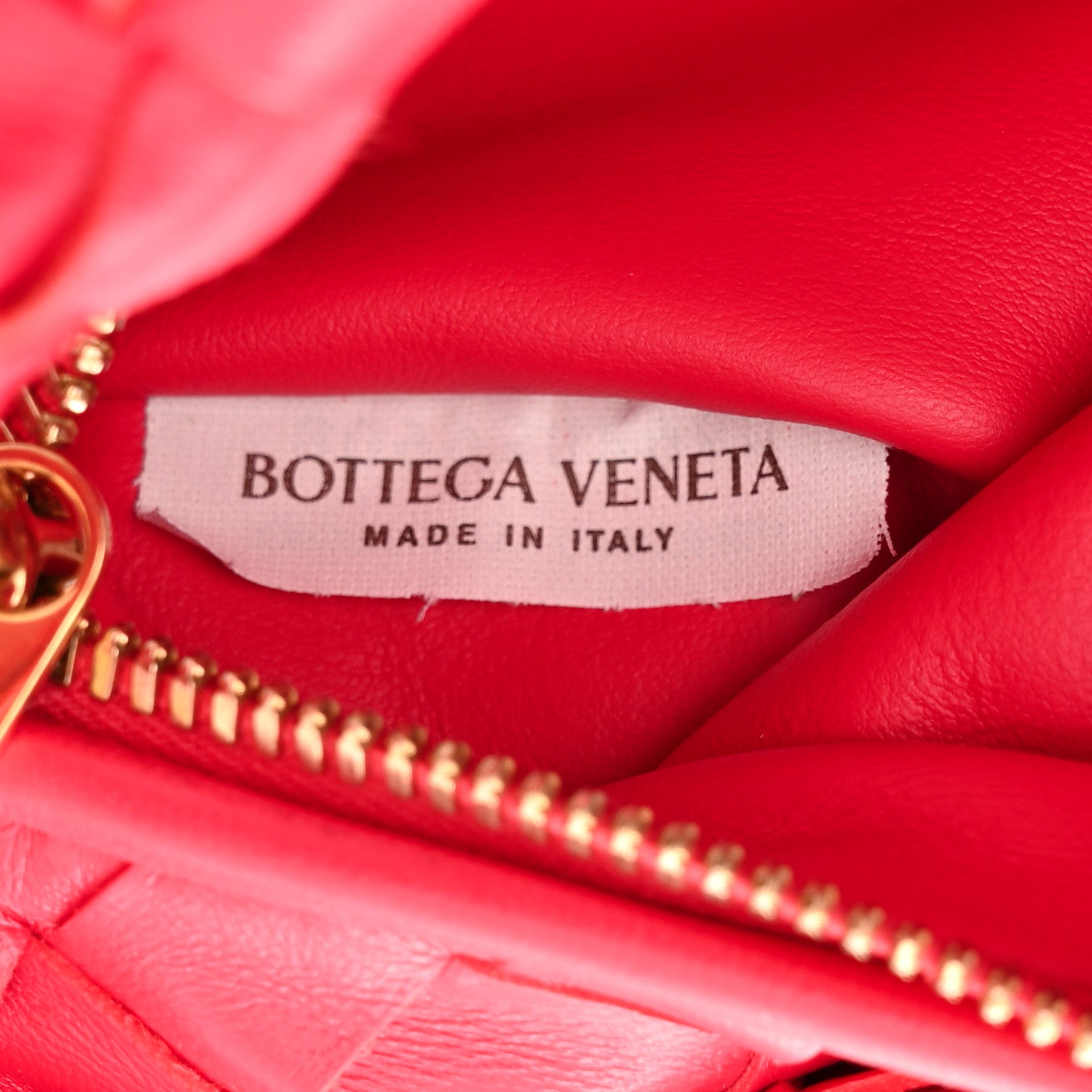 This is an authentic BOTTEGA VENETA Nappa Intrecciato Mini Jodie in Firework. This stylish shoulder bag is beautifully crafted of soft woven lambskin leather in red. The shoulder bag features a matching handle and a gold top zipper that opens to a compact red leather interior.