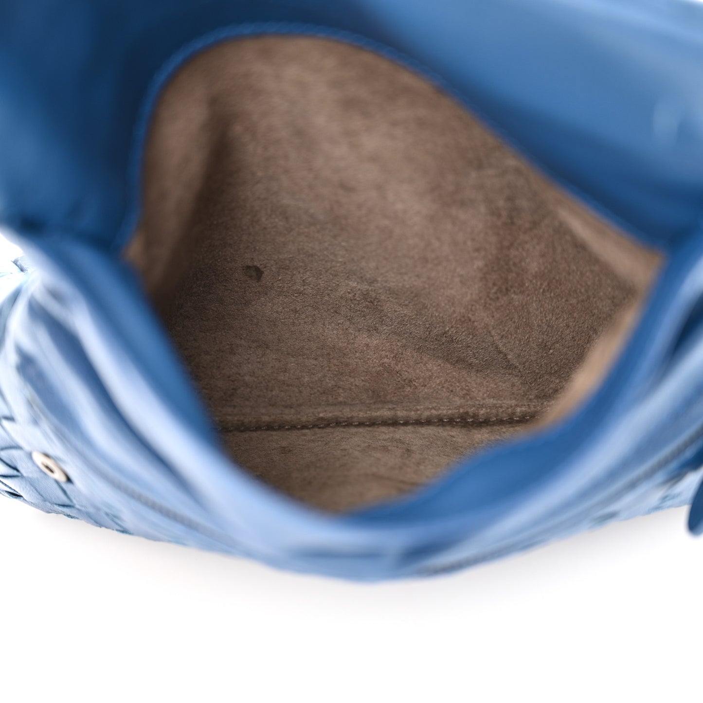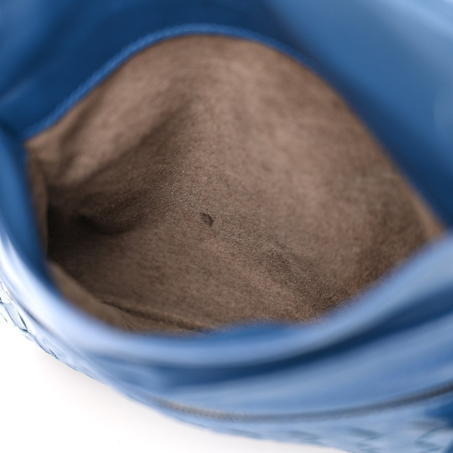 This is an authentic BOTTEGA VENETA Nappa Intrecciato Small Chain Crossbody in Empire. This stylish mini messenger bag is beautifully crafted of woven lambskin leather in blue. The bag features an optional matte dark silver chain shoulder strap and opens to a brown suede interior with card slots and a patch pocket.